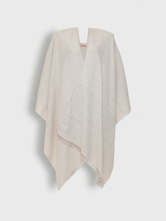 Zela Poncho in beige tone, with an open design, featuring a geometric pattern and fringe...