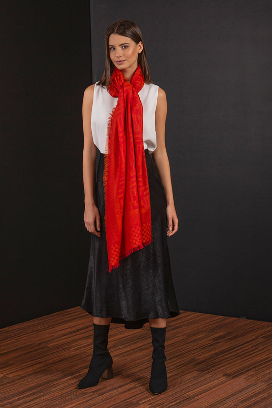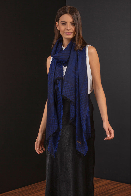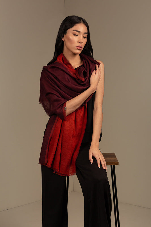This exclusive jacquard shawl is made of royal alpaca and silk. The dual colour design...