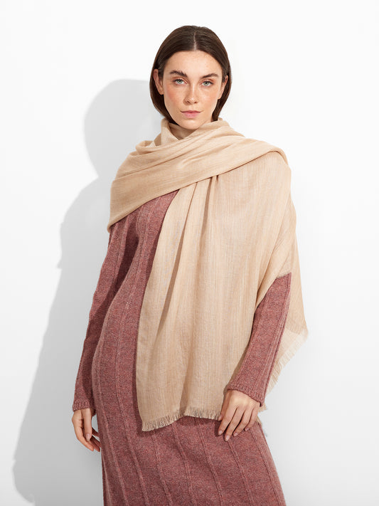Teaberry B Stole in beige tone, in a solid color design, featuring fine fringed edges...