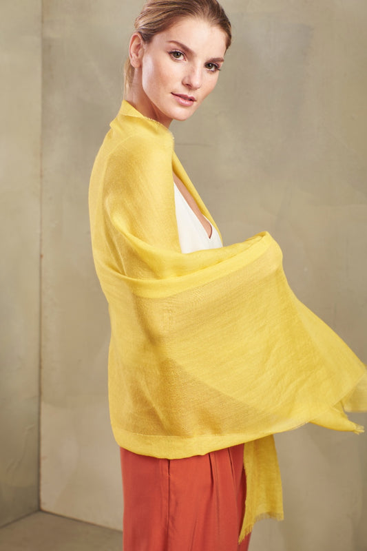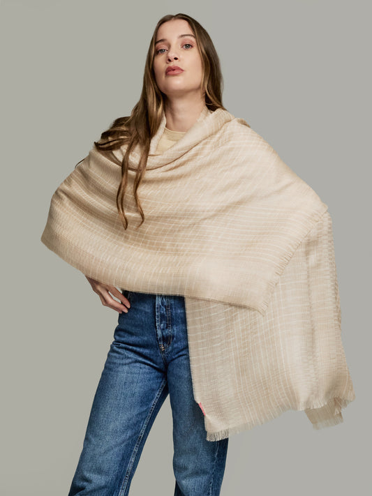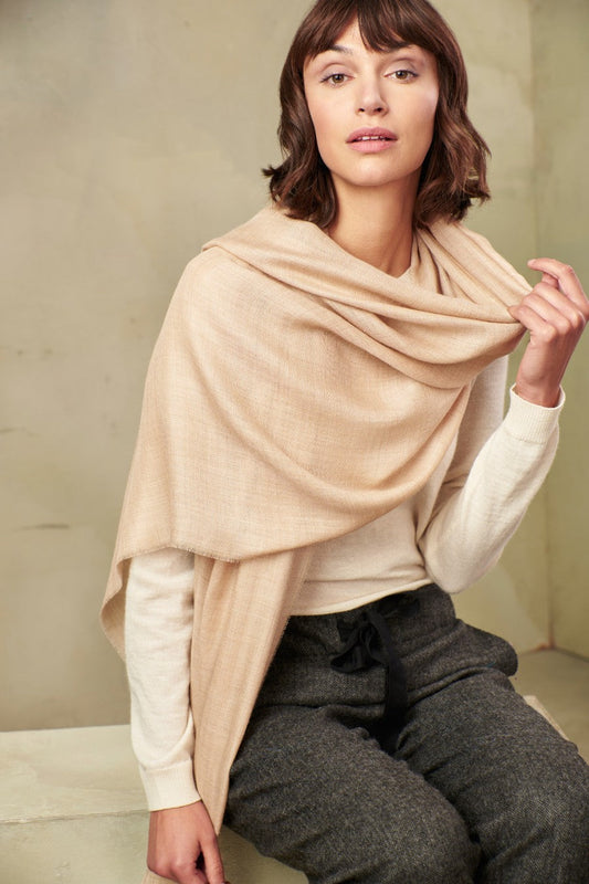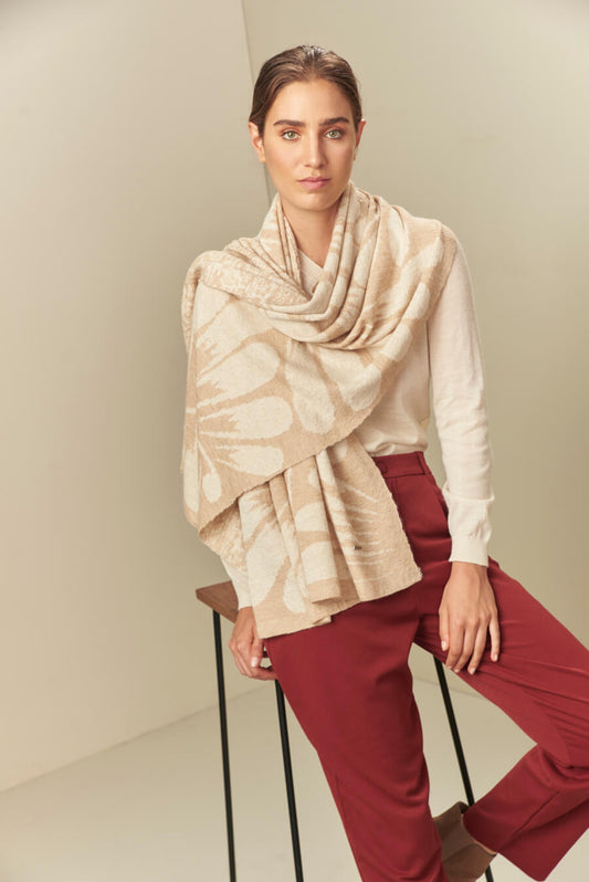 This elegant shawl in neutral tones is a baby alpaca and silk piece which accentuates...
