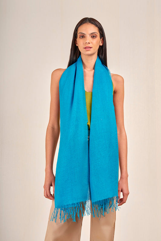 Teaberry Stole in turquoise tone, featuring a solid color and fine fringed edges that provide...