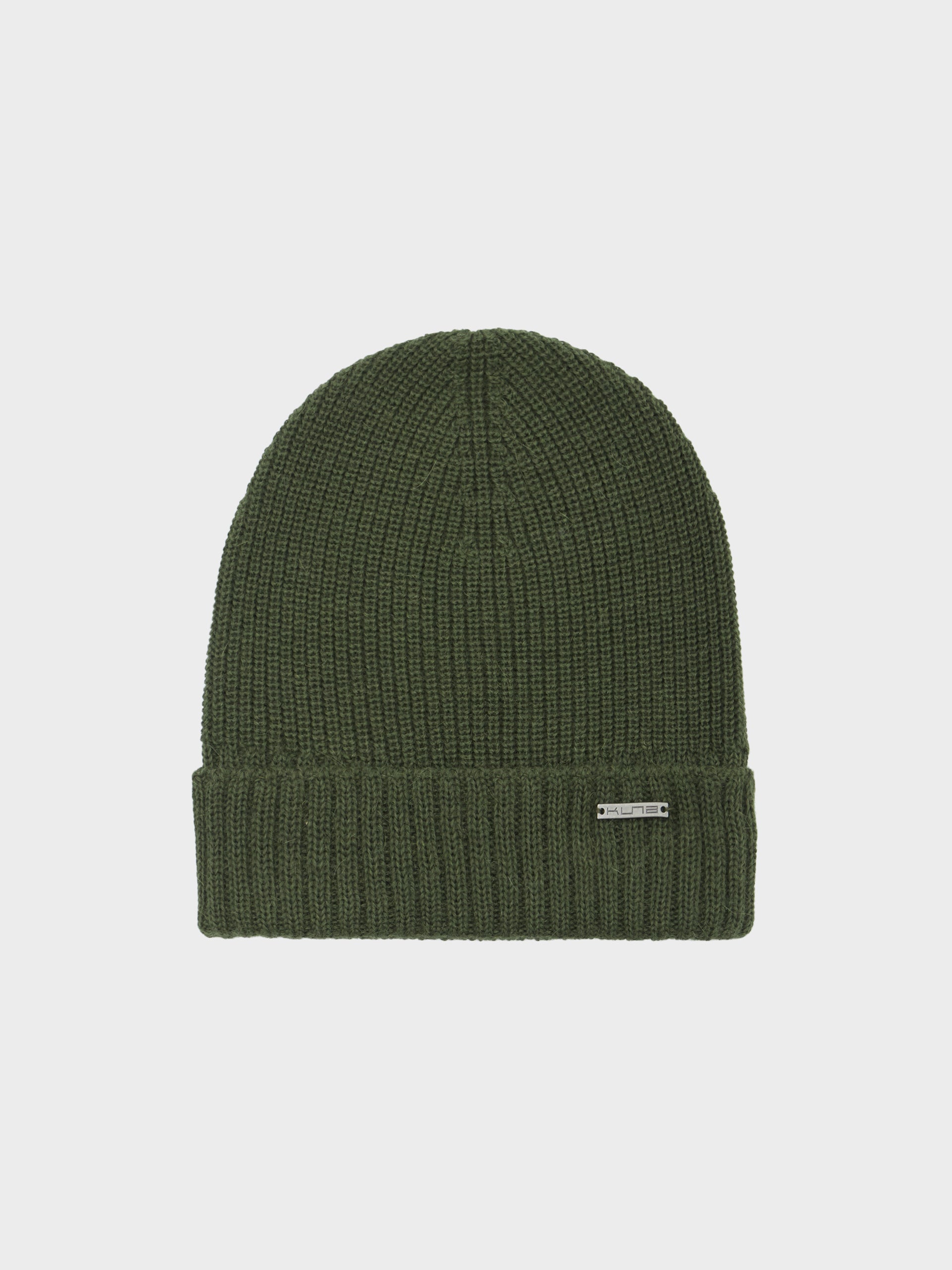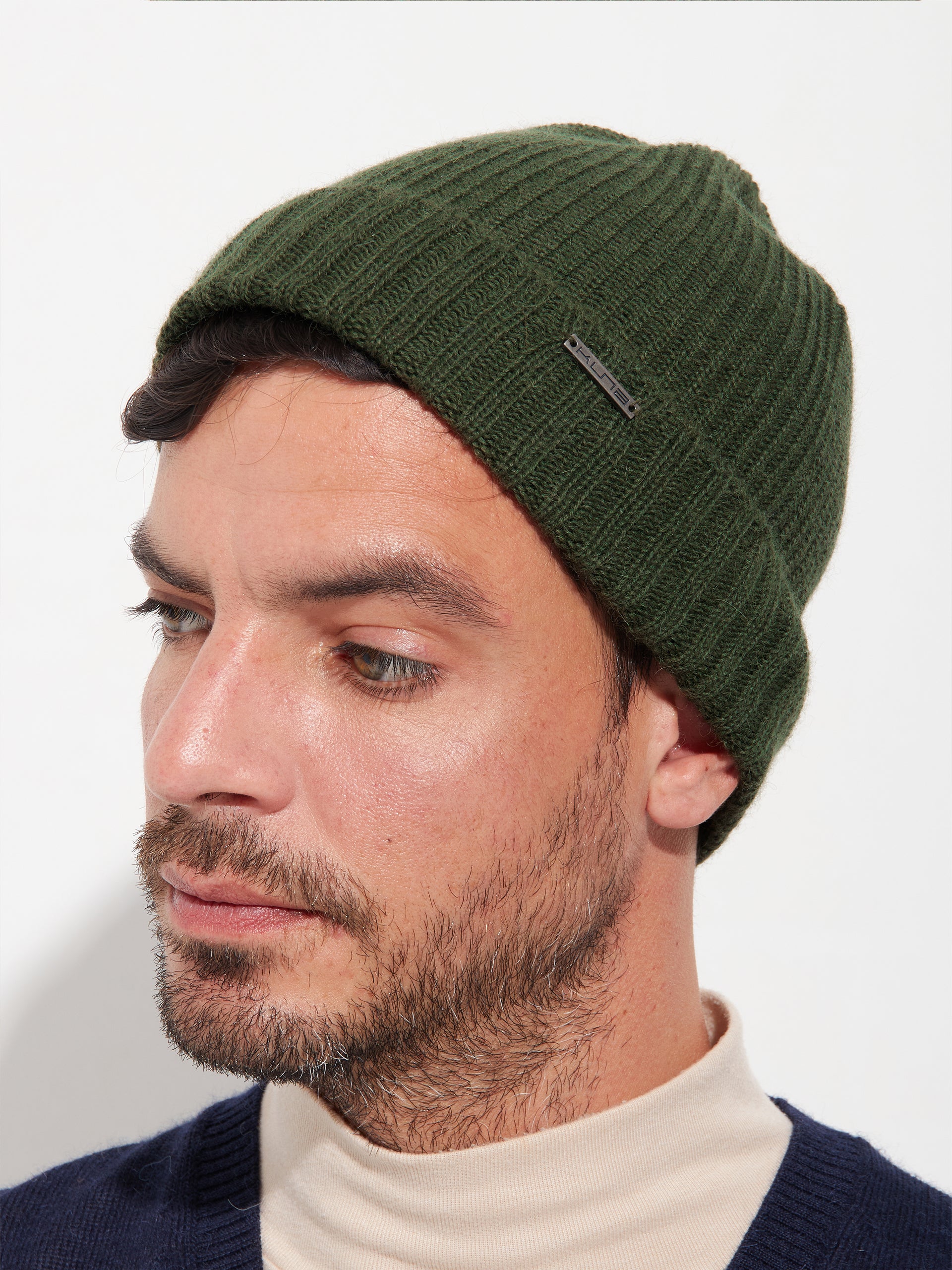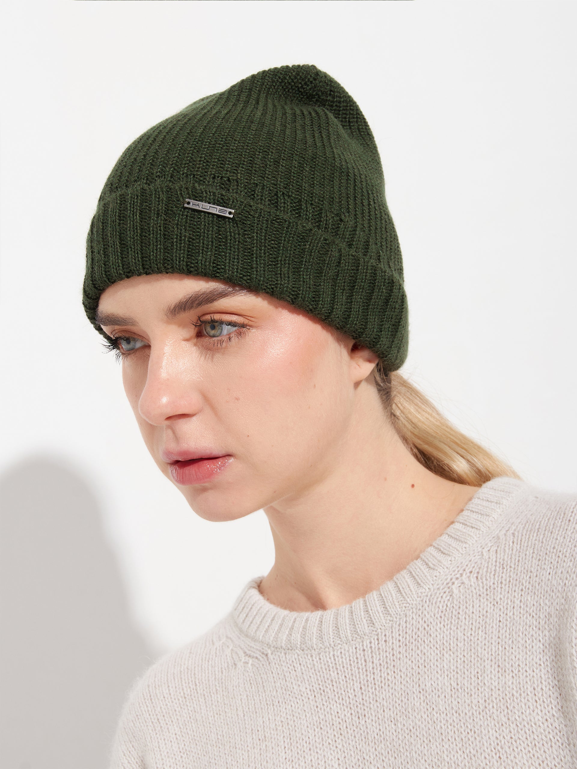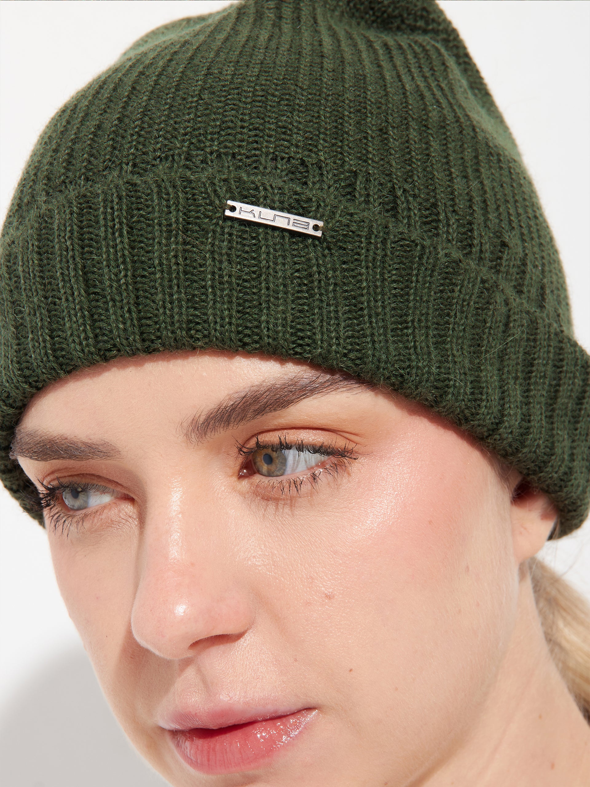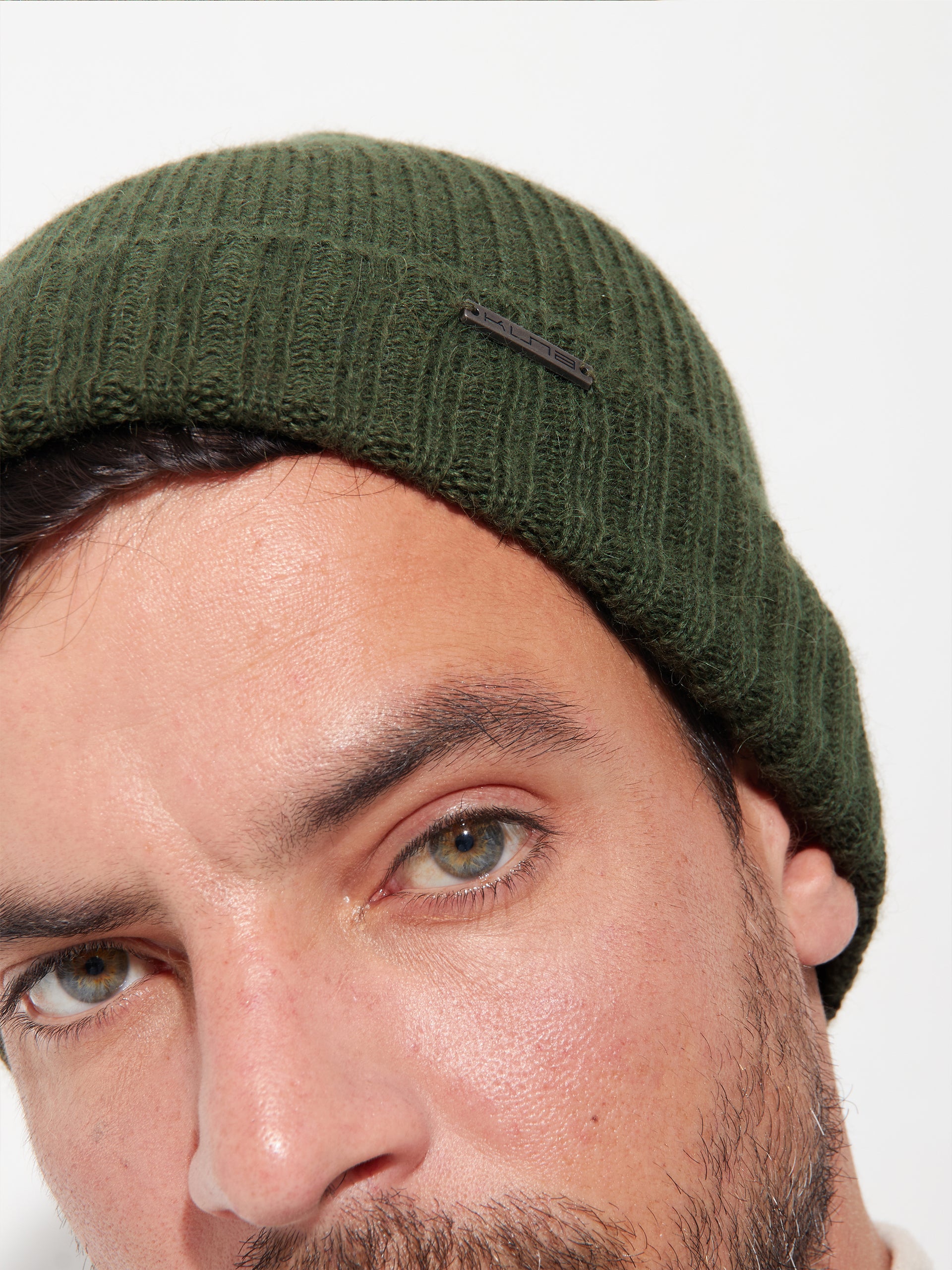 Apostrofe beanie in green, made of 100% baby alpaca. This knitted accessory stands out for its snug fit and folded waistband, offering a minimalist full color design. | Predominant material: Baby Alpaca
