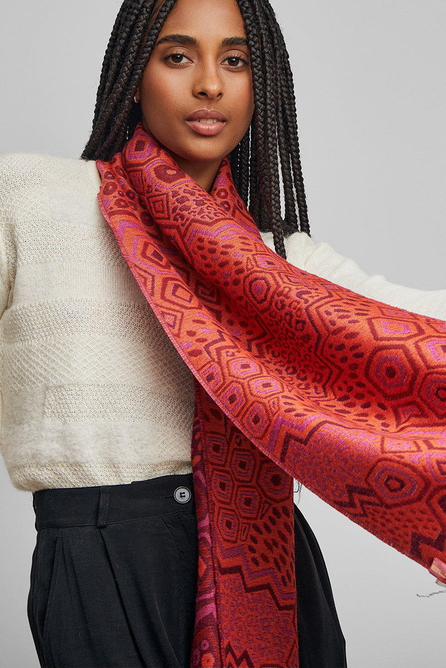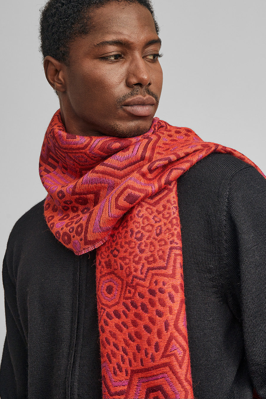Elegant design inspired by the AFROPERU collection and embodied in our Wife scarf, a Jacquard knit based on baby alpaca and silk, a leading garment in any look.