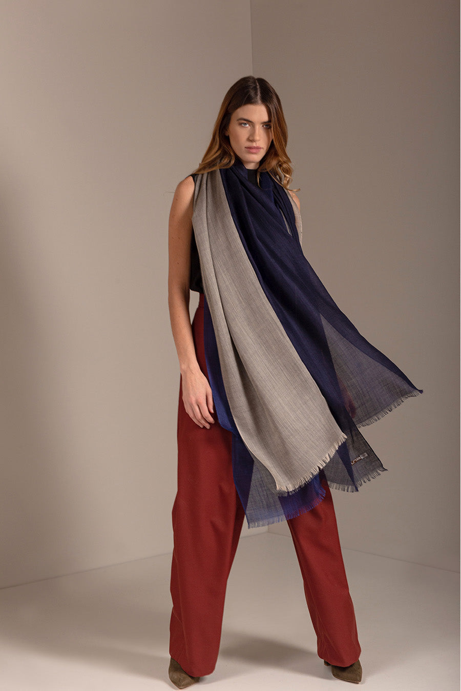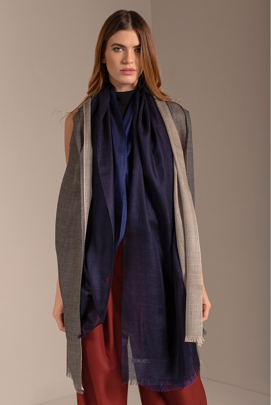 Classy pashmina with subtle degrade in neutral tones. Piece woven in royal alpaca and silk.