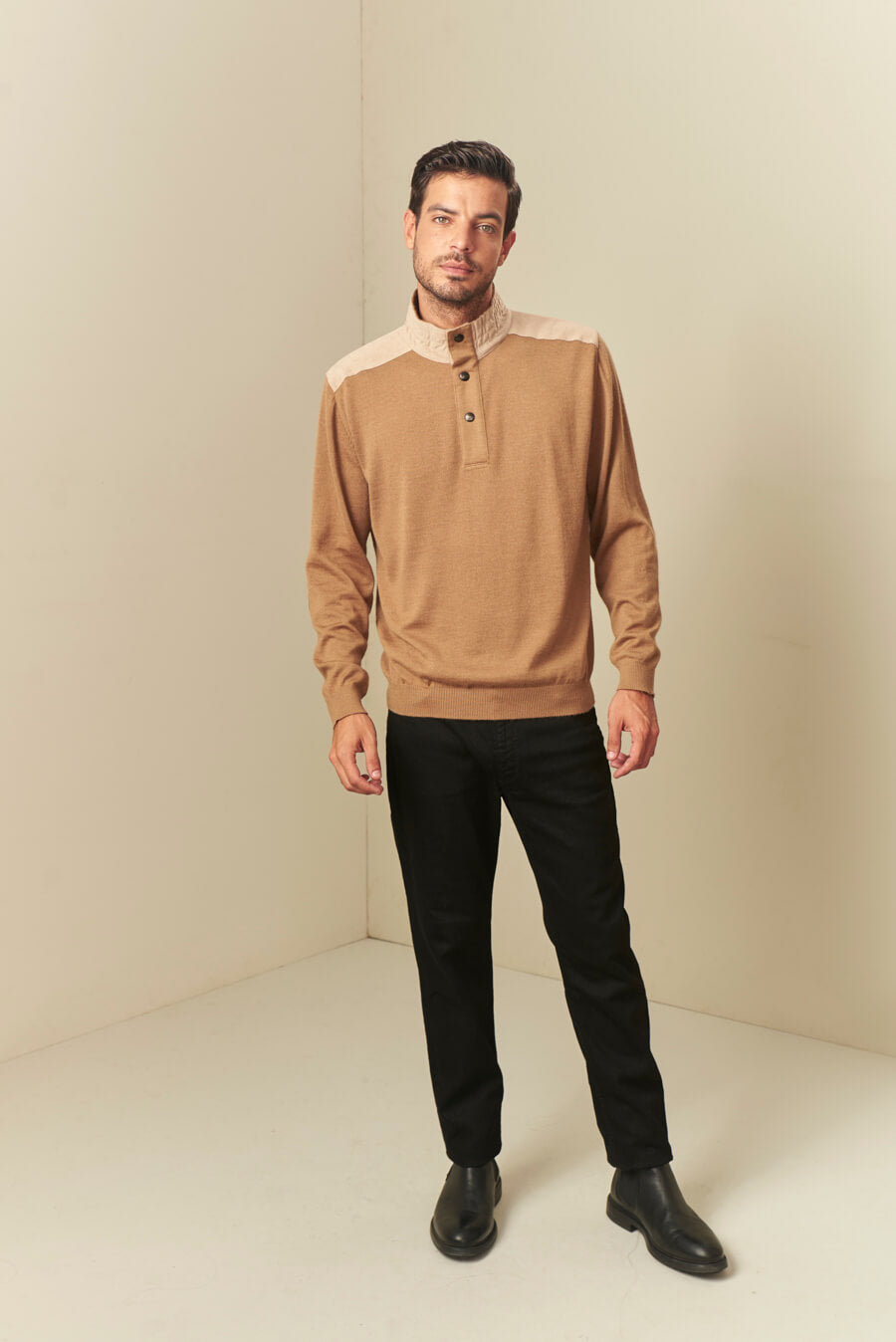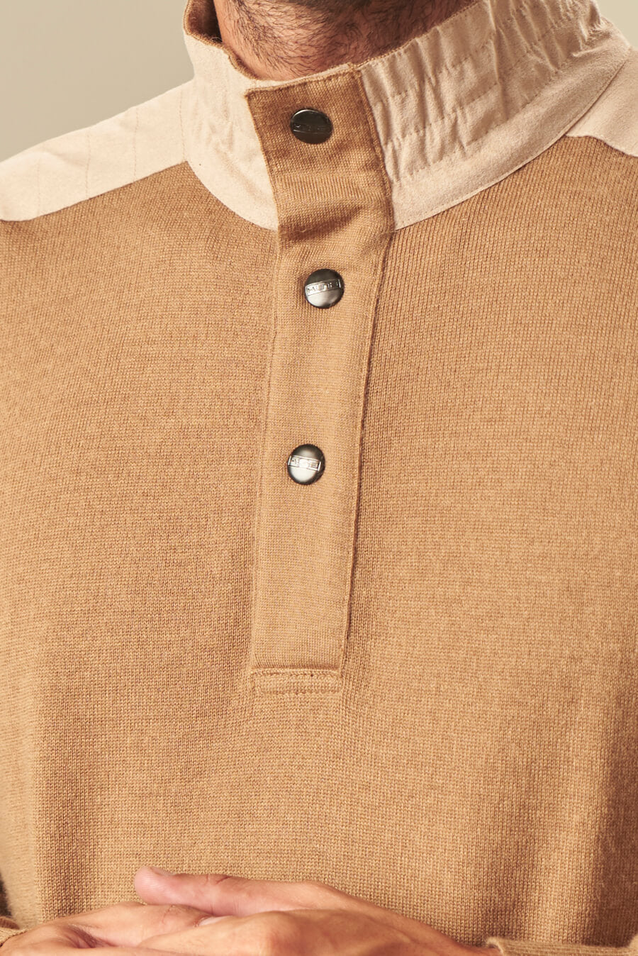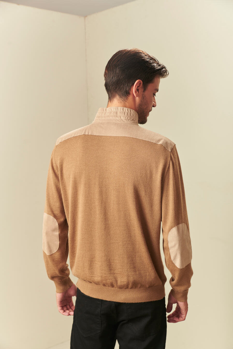 High neck sweater made with the finest alpaca fiber. Our exclusive alpaca 16 material is not only traceable but also extremely soft and warm. A garment of classic silhouette, but with elegant details of alcantara in the elbow pads, yoke and neck.