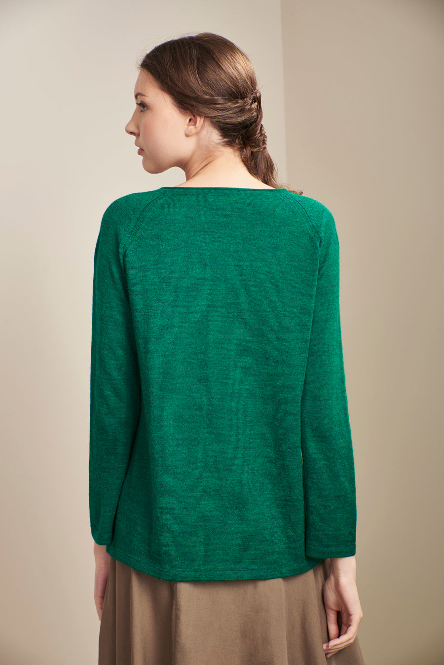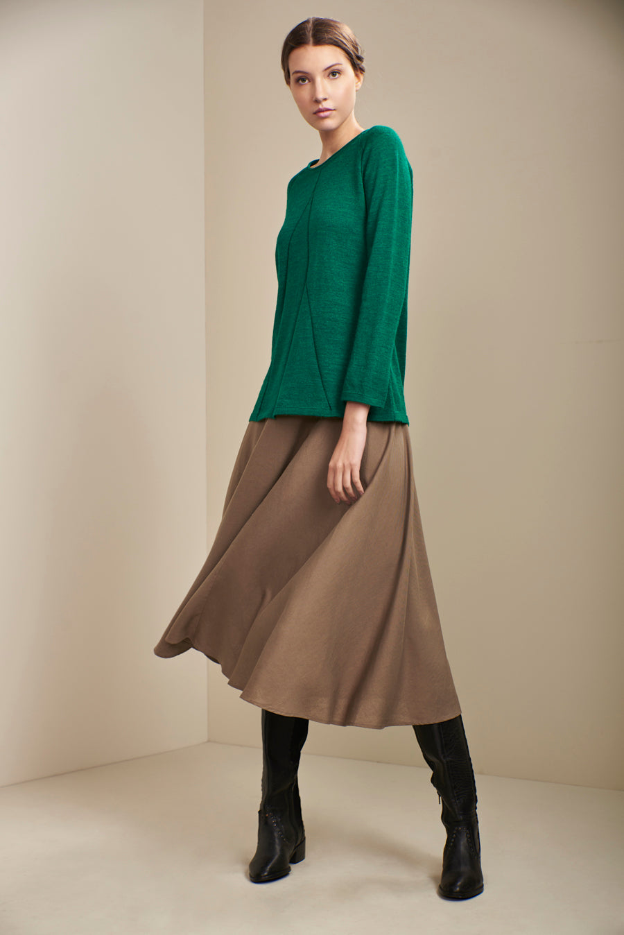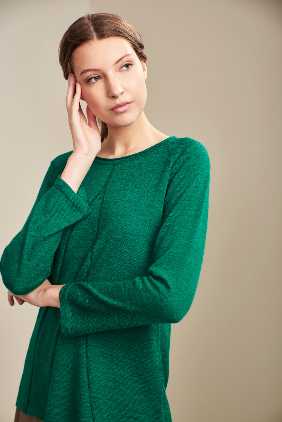 Relaxed and casual, this wide sweater, made in baby alpaca, combines the flat knit with the curved lines that make this, an asymmetric garment. It has a round neckline and long sleeves.