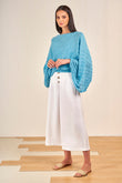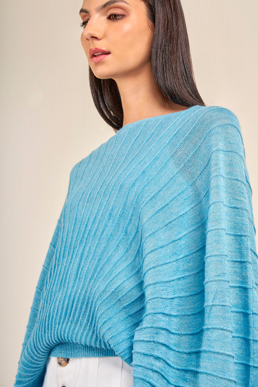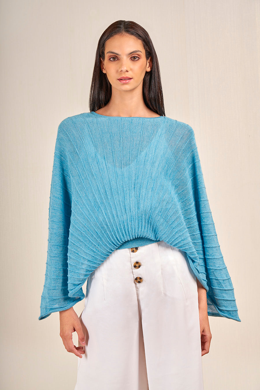 Our light Vuanatu sweater is made of a soft blend of baby alpaca and silk. The pleated jersey and batwing sleeves make it a unique piece, great to accentuate your style.