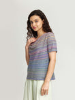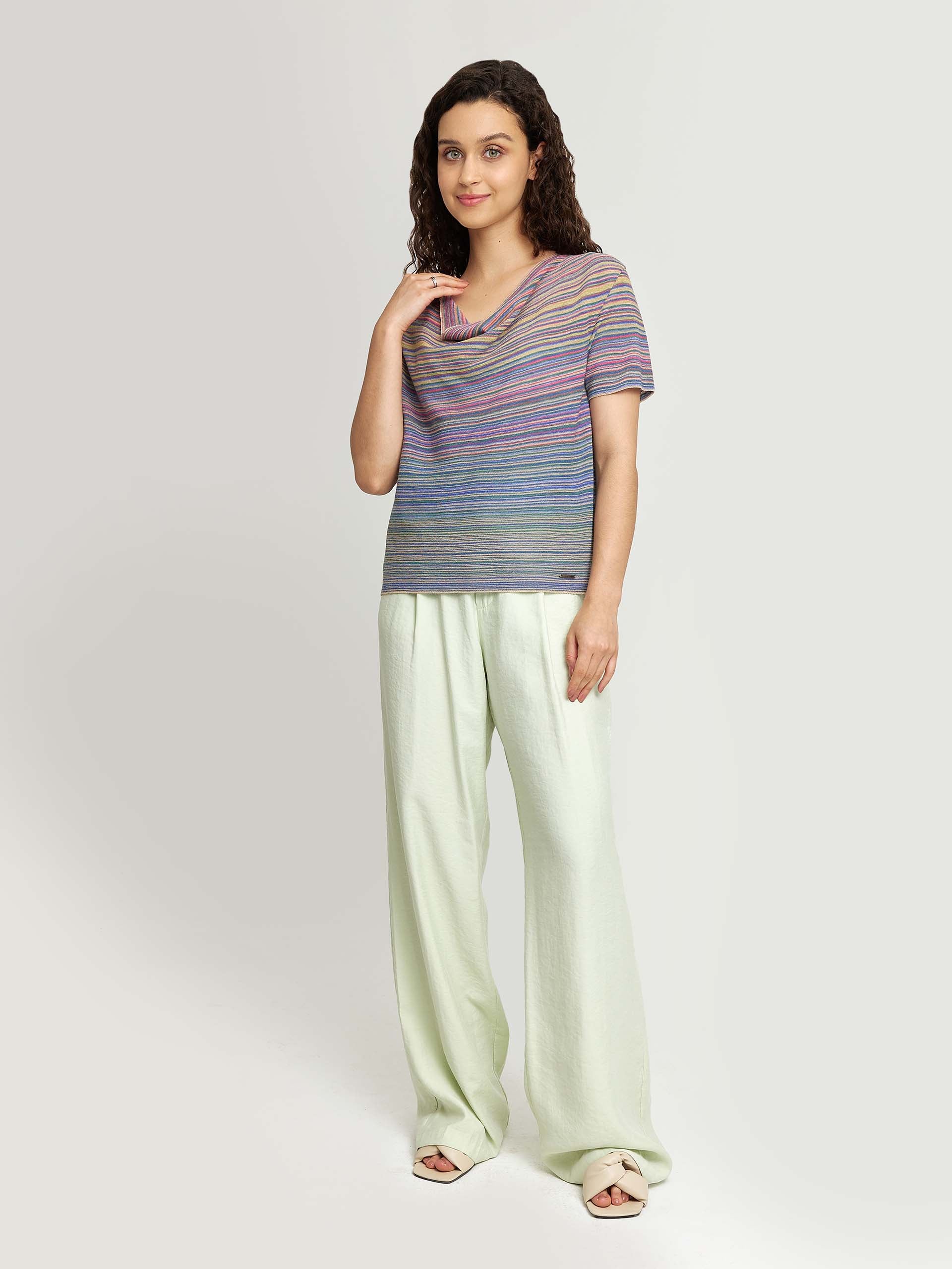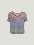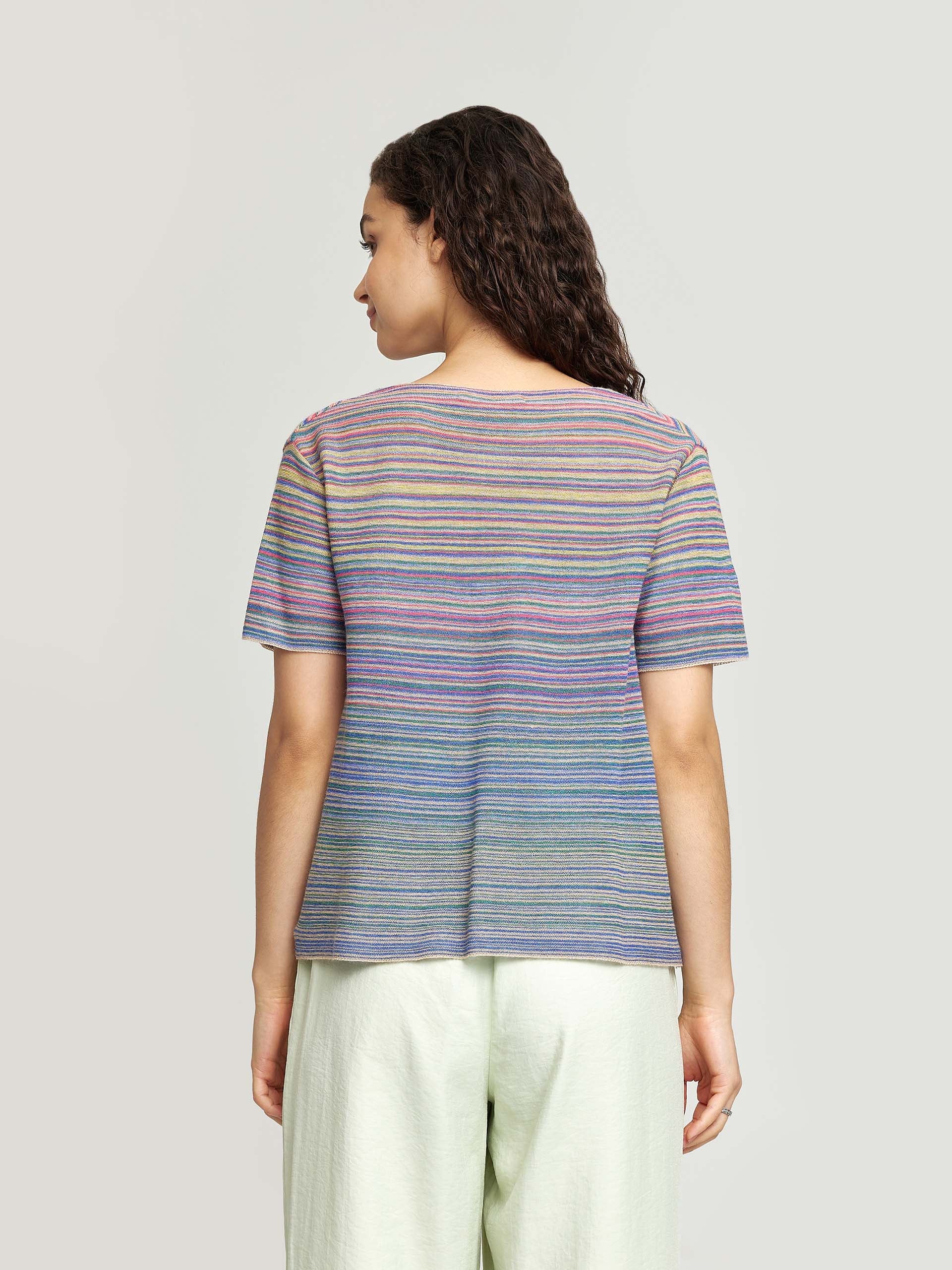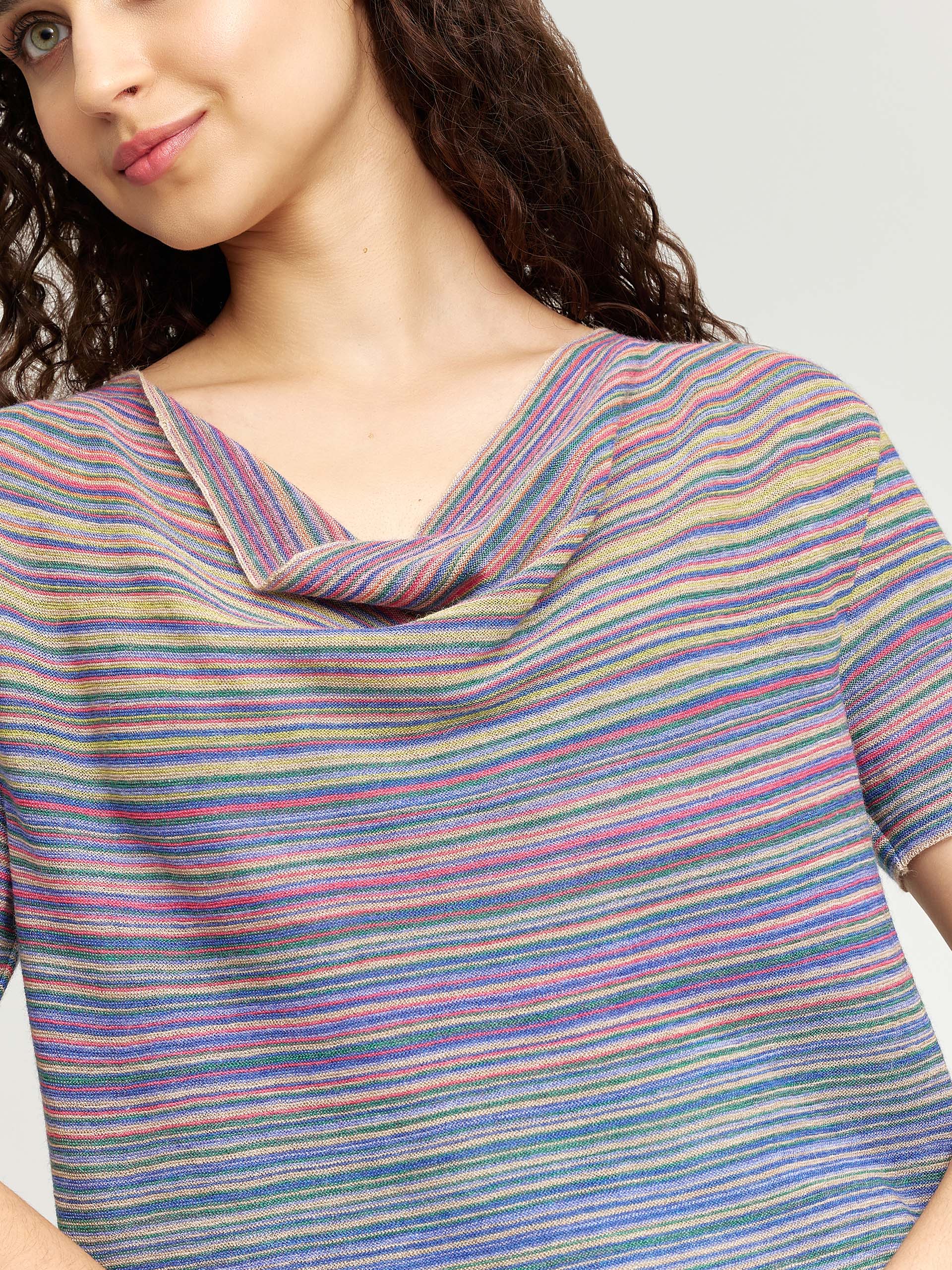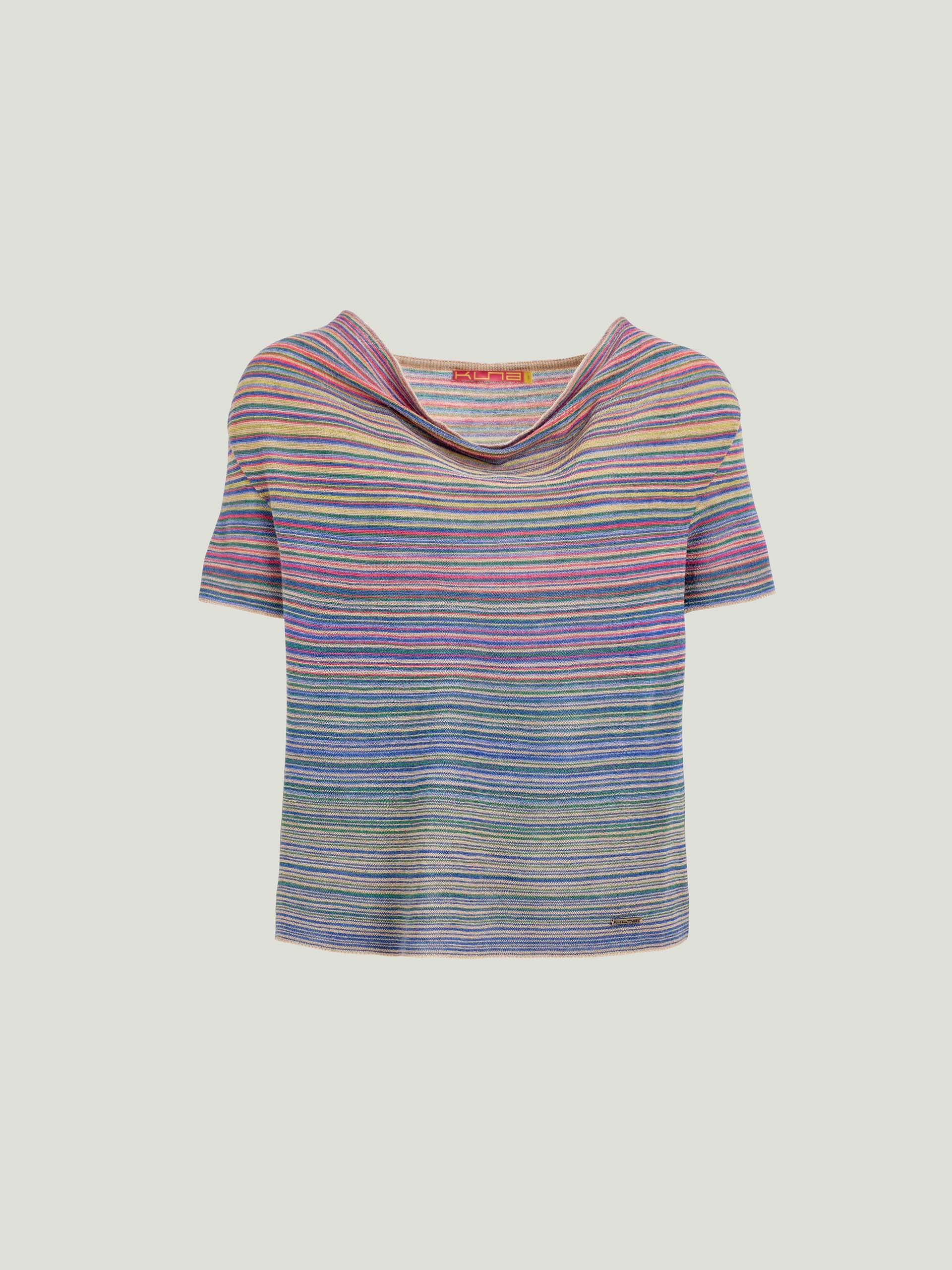 Ultra-light baby alpaca and silk fabric, ideal for summer afternoons. With it we have made this garment with a relaxed cut, waterfall neckline and short sleeves. Colorful design with horizontal details. The beautiful Uapiti sweater will enrich your looks. | Predominant material: Baby Alpaca & Silk