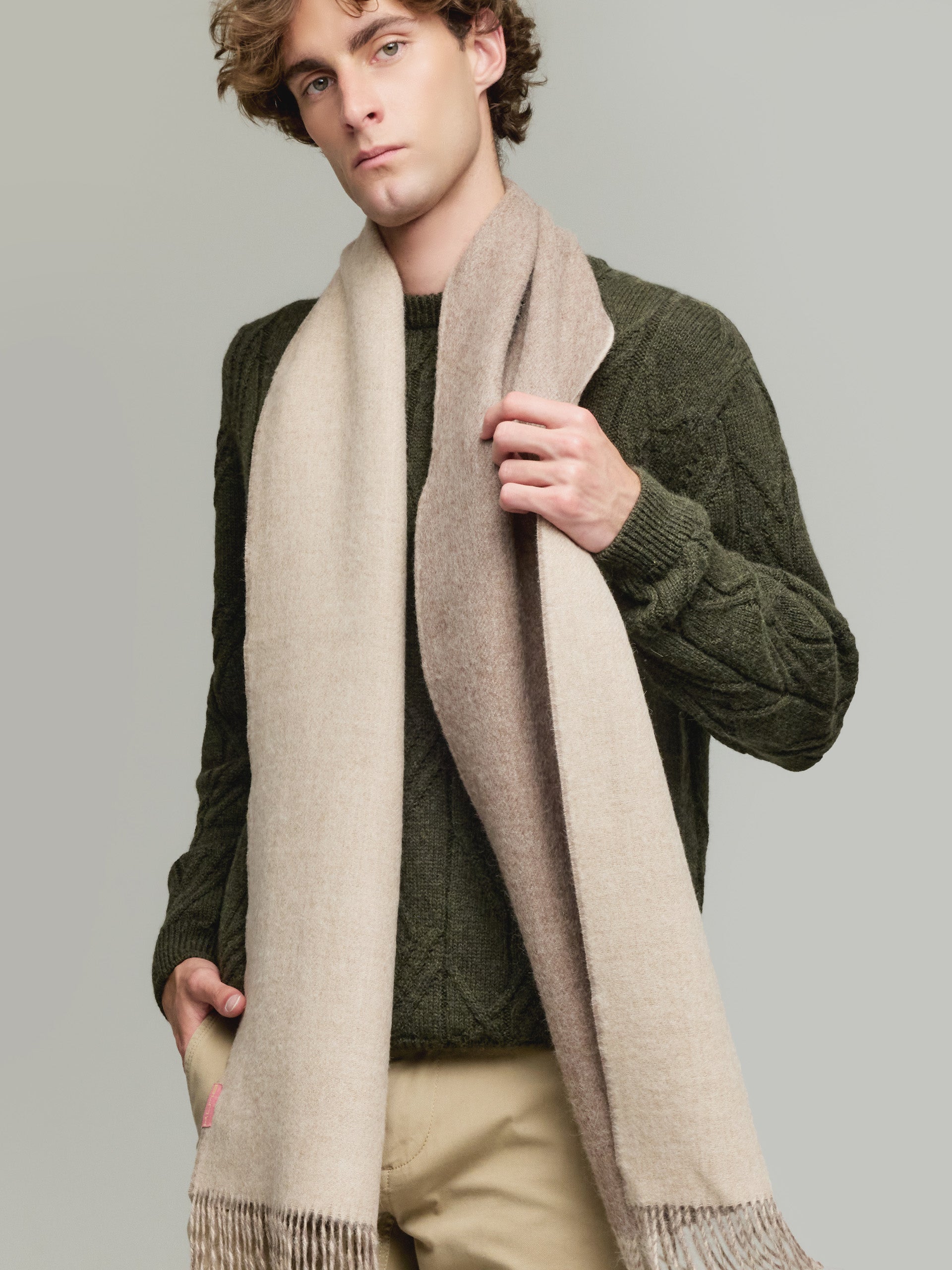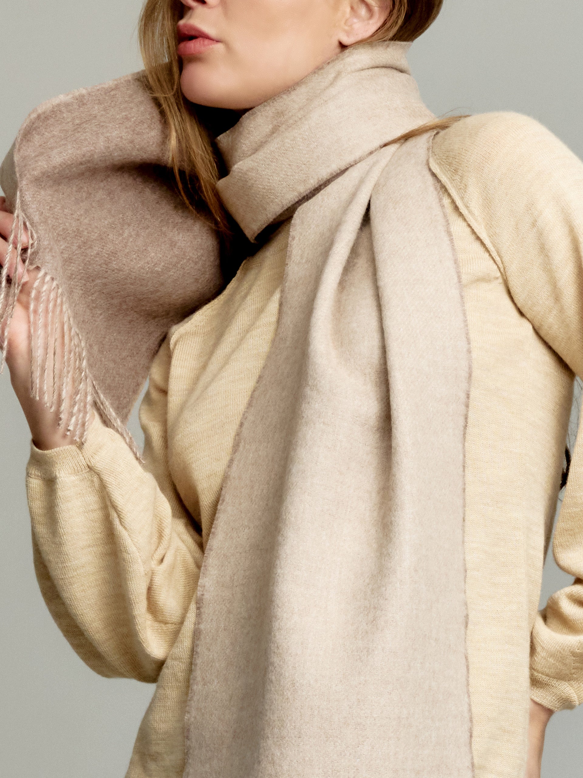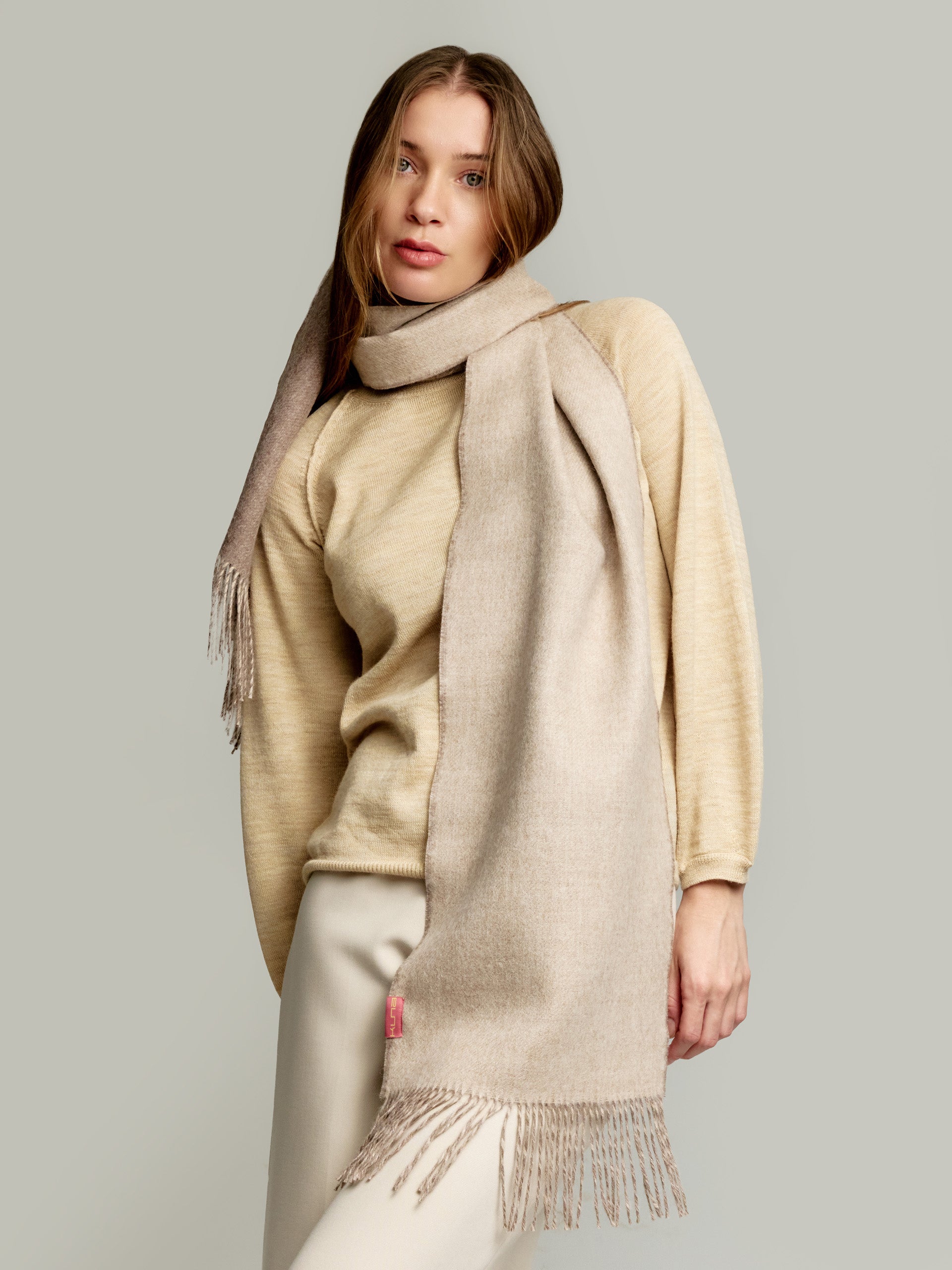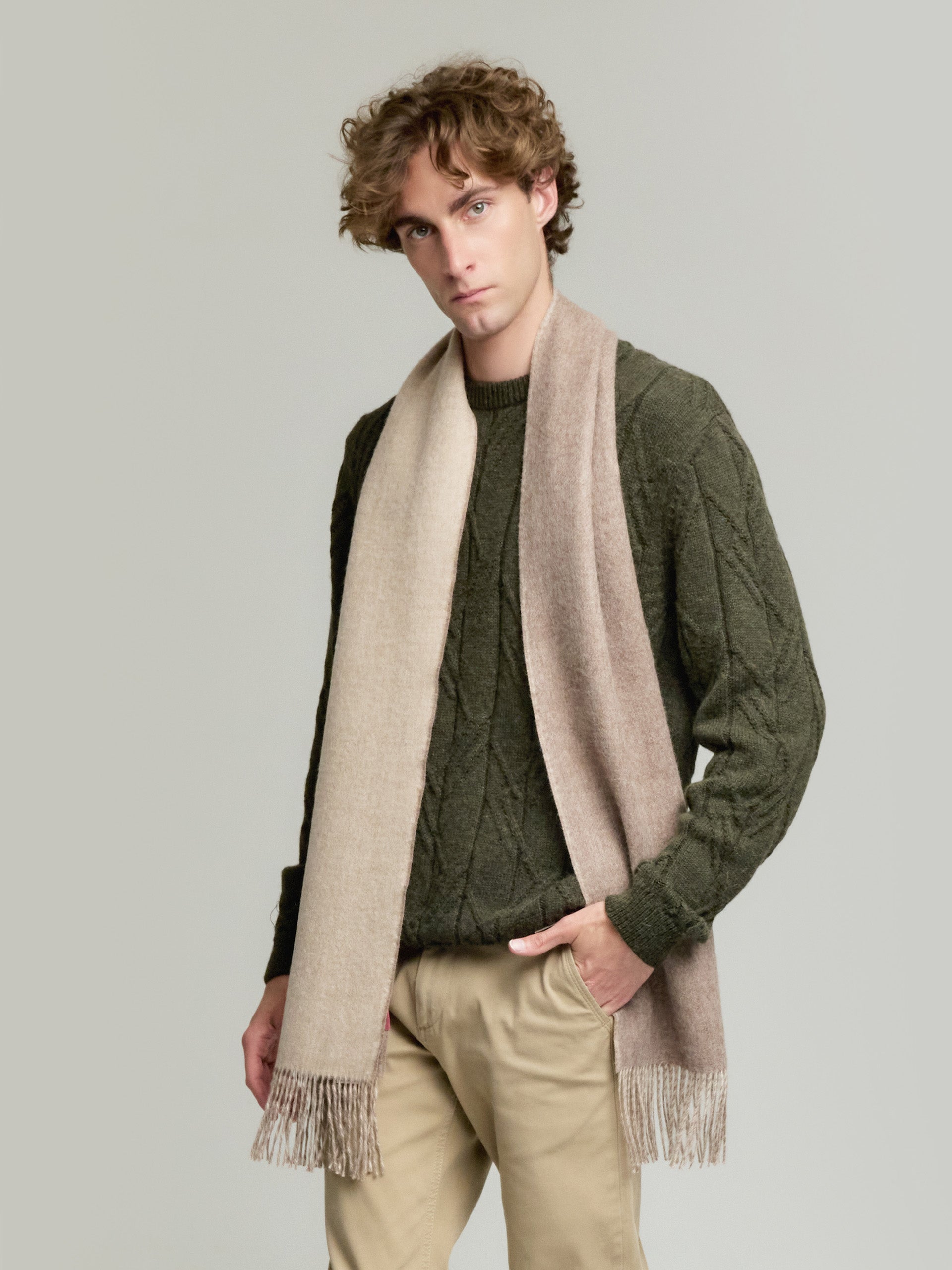The Yamila reversible scarf, made with exquisite baby alpaca yarn, is an accessory of timeless elegance. Its sober shades make it the perfect choice for any occasion. A must-have in your wardrobe that fuses the softness of alpaca with a versatile and refined design. | Material predominante: Baby Alpaca