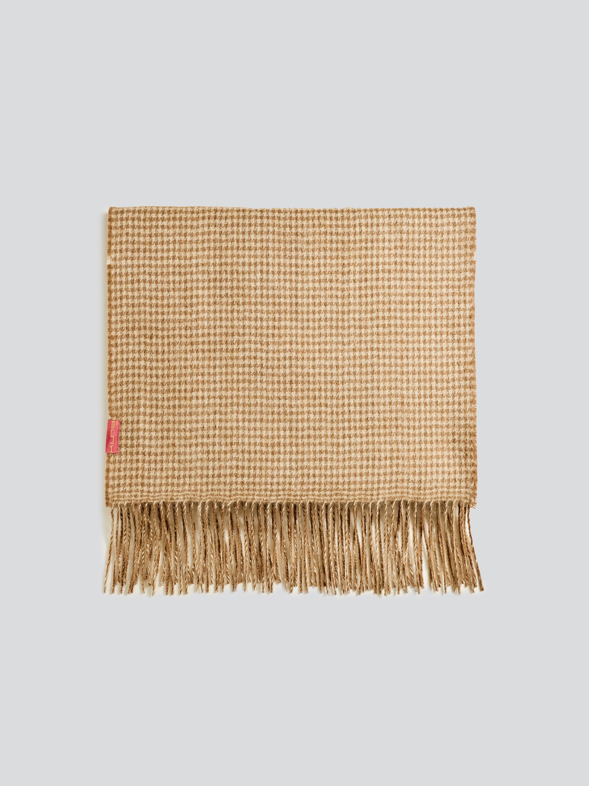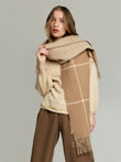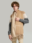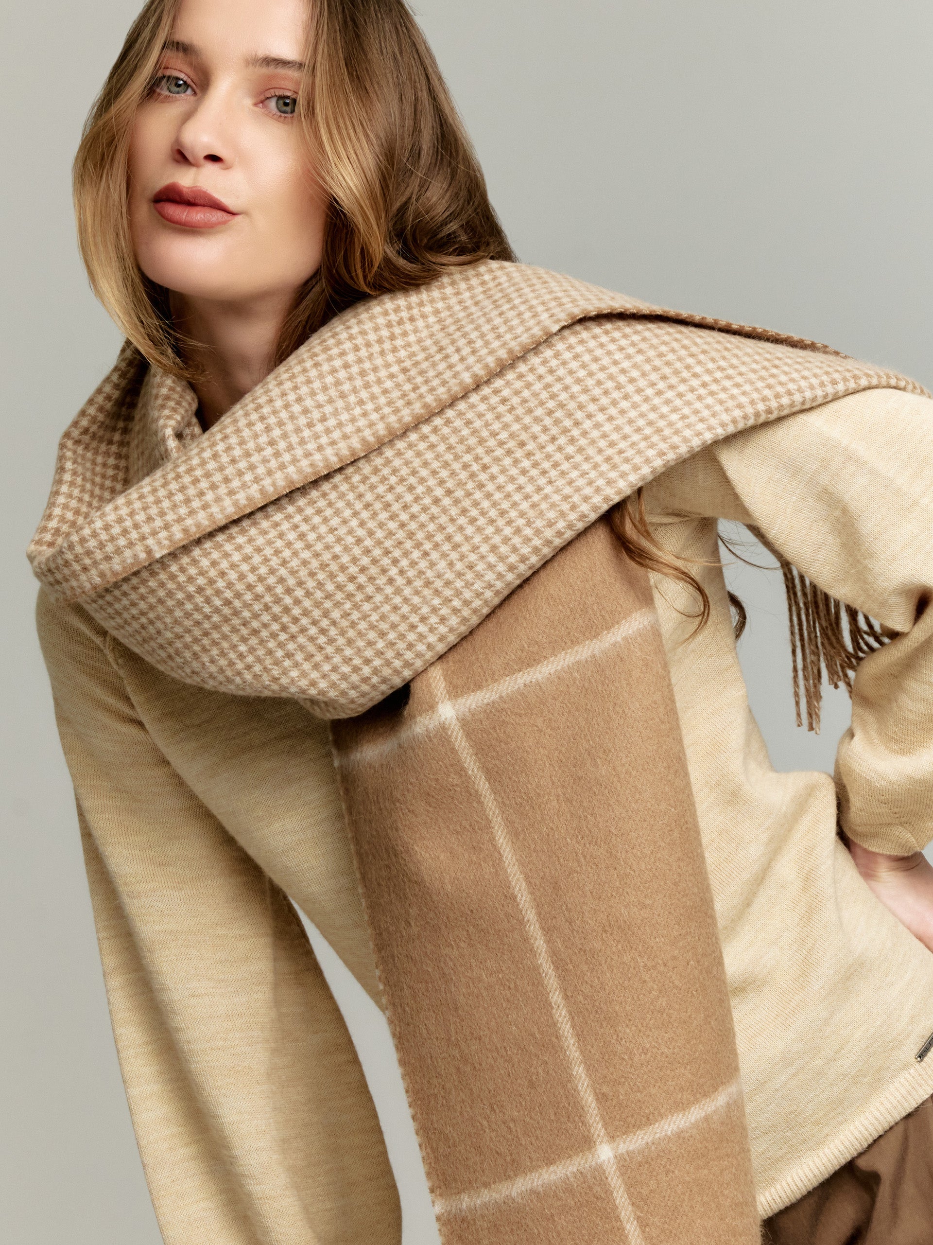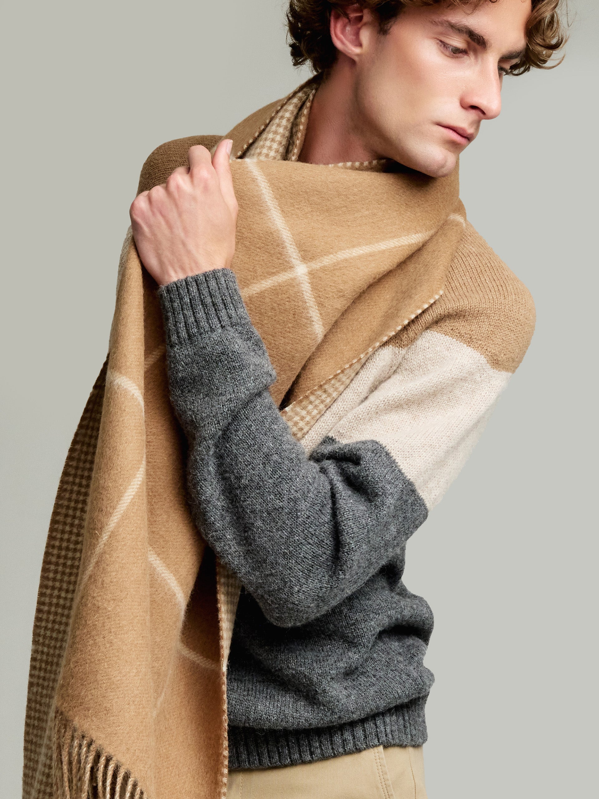 This reversible stole in natural shades offers color blocks on one side and a checkered design on the other. With long fringes and made of 100% baby alpaca, our Ylenia stole combines versatility and luxury to complement any outfit with elegance and warmth. | Material predominante: Baby Alpaca