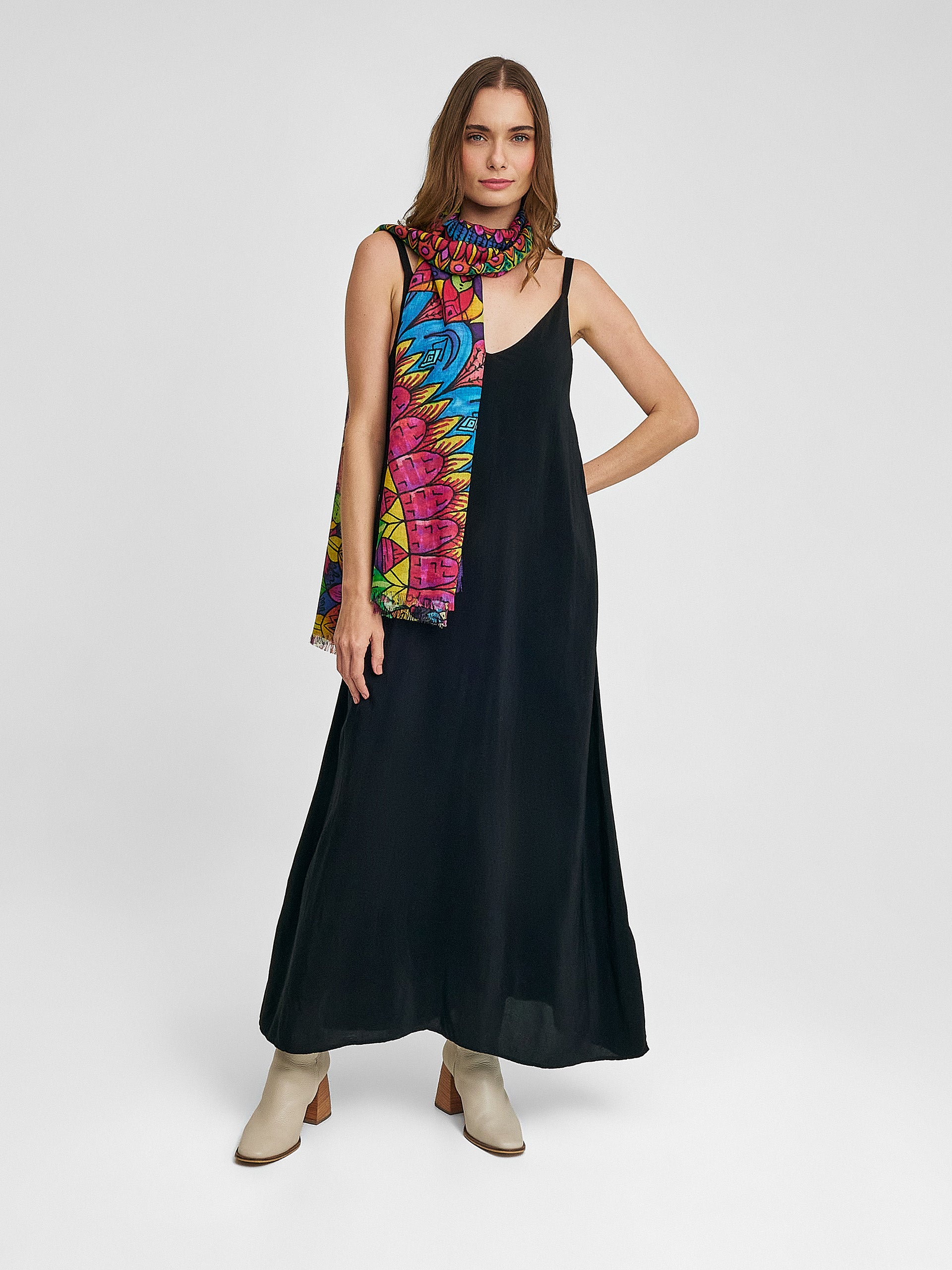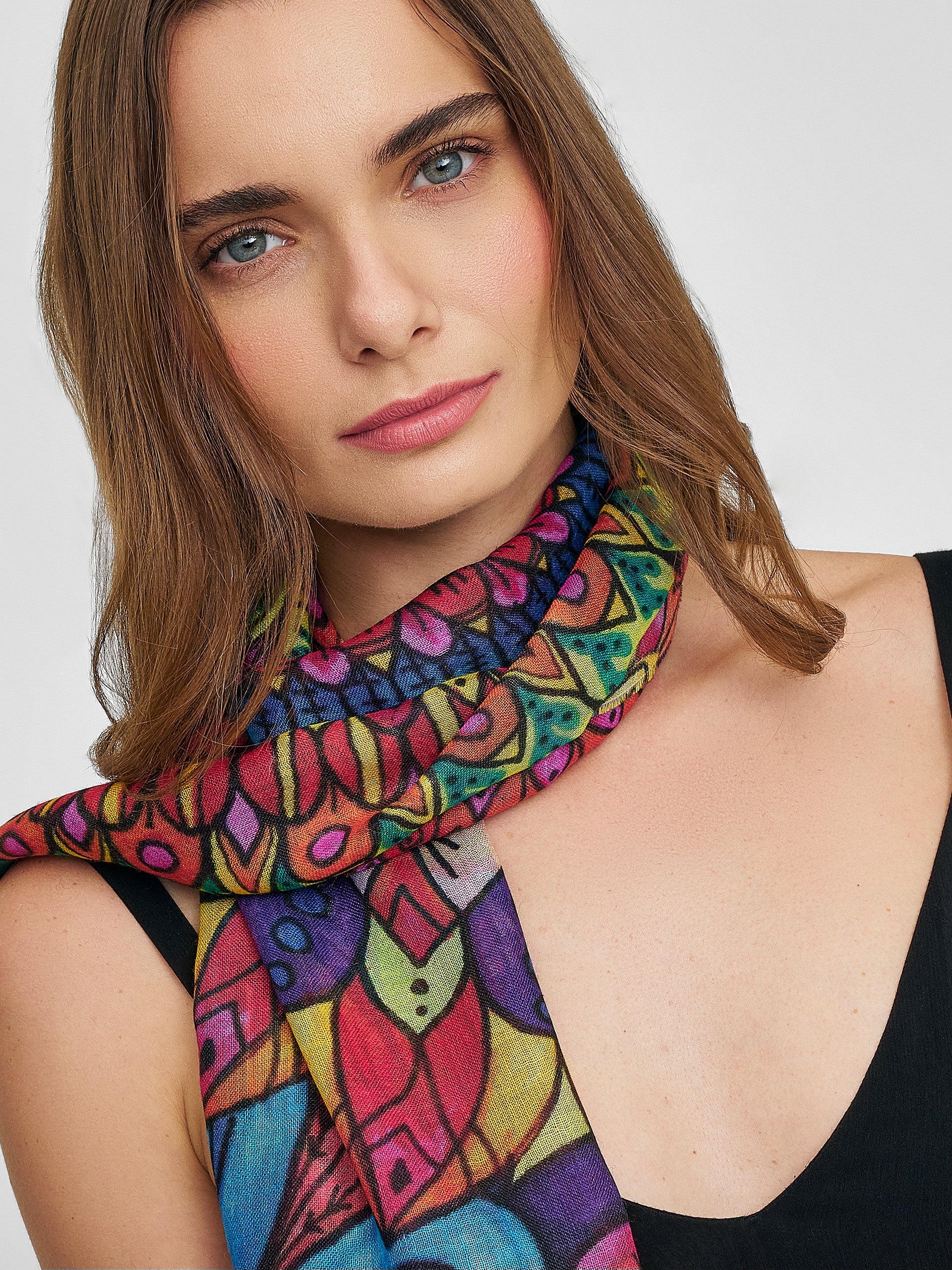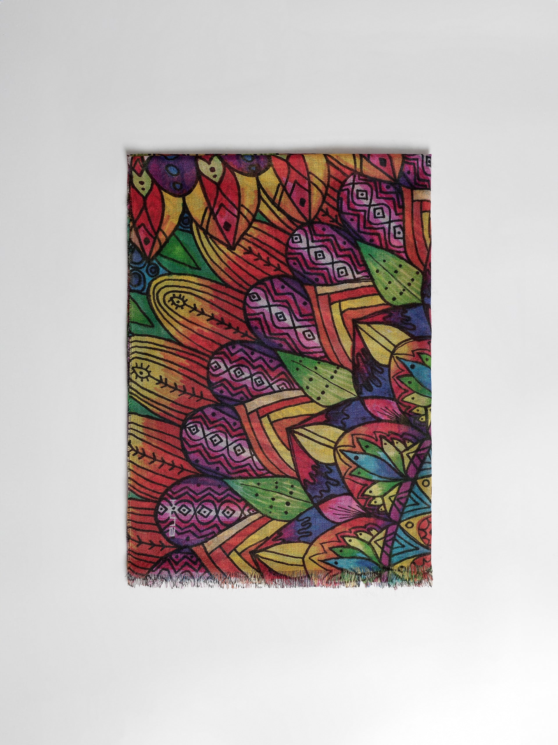 When my body, mind, and soul are in harmony, I am no longer fragmented. My reason and my heart unite to bring out the power in me and I discover my true self. "I am who I am." This beautiful shawl has been the inspiration of our artist Kelly Abarca, through artwork captured in baby alpaca and silk shawls. | Predominant material: Baby Alpaca & Silk