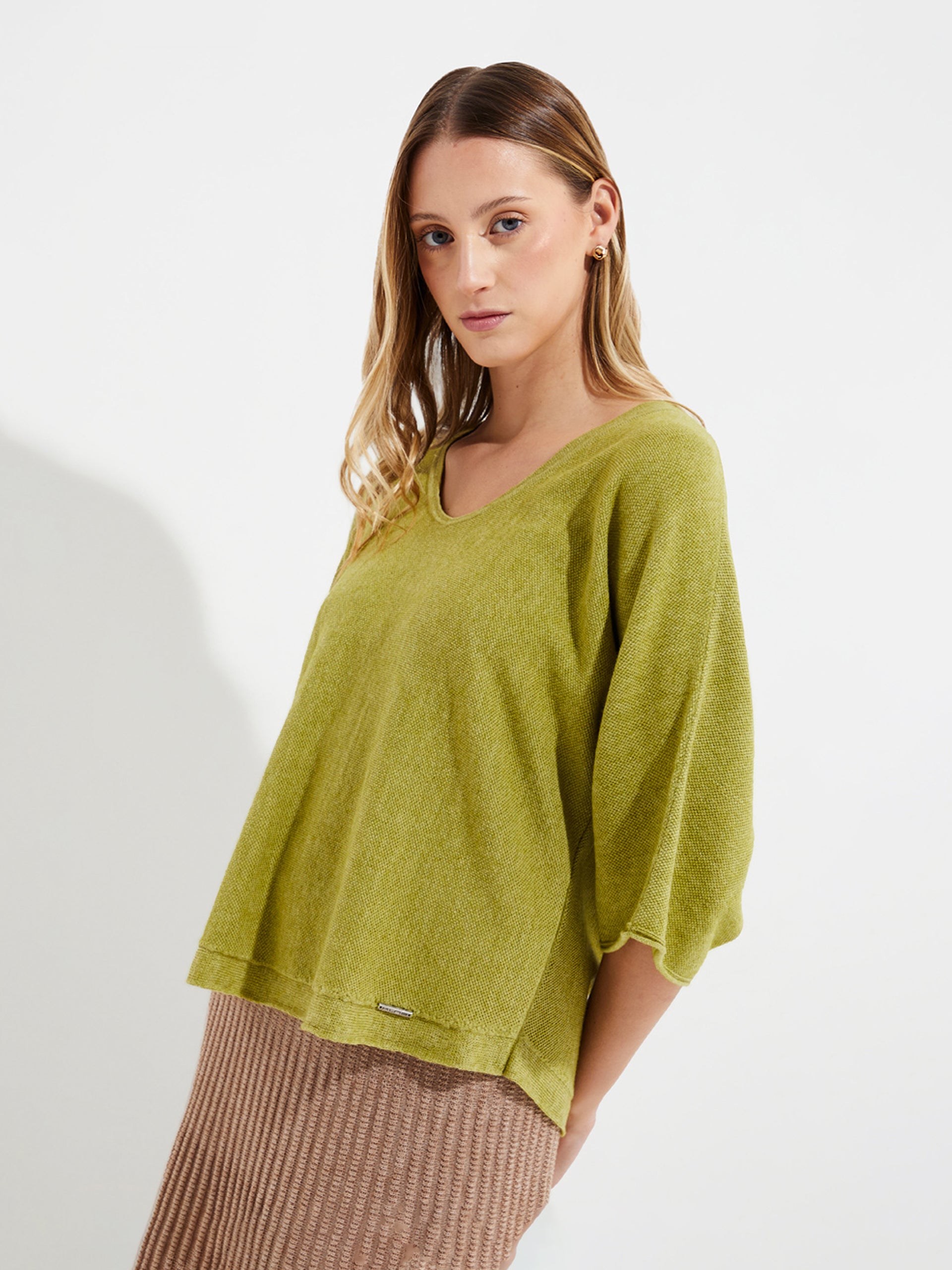A unique garment with a modern design, the Yolanda sweater is made of organic cotton and baby alpaca. Its finish makes it an ideal item for the season. With a round neckline and three-quarter sleeves, it offers a relaxed silhouette and solid color. Available in two colors. Feel the warmth and softness of the Yolanda sweater, perfect for any occasion. | Predominant material: Cotton