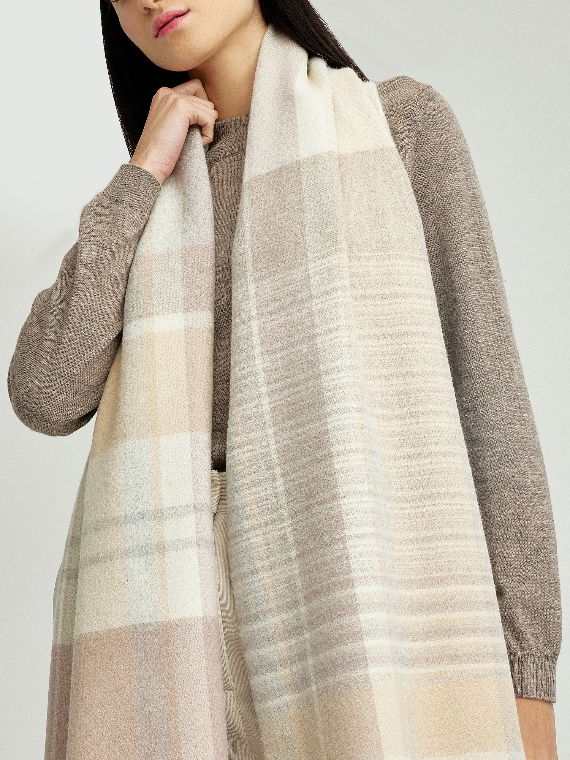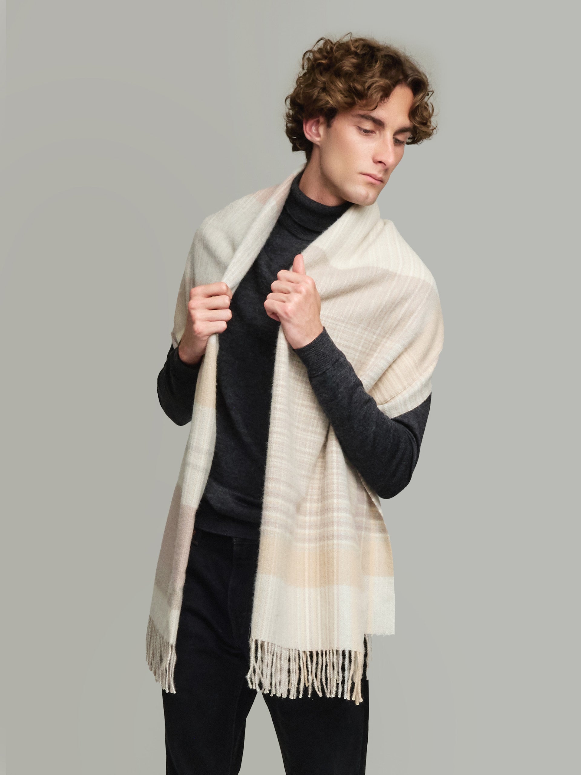 Discover the Yolima stole, an exquisite pashmina made of baby alpaca and silk, highlighting an elegant, checkered design. Its softness and refinement make it the ideal complement for any occasion, bringing a touch of luxury and style to your look. Available in three shades to suit your preference. | Material predominante: Baby Alpaca