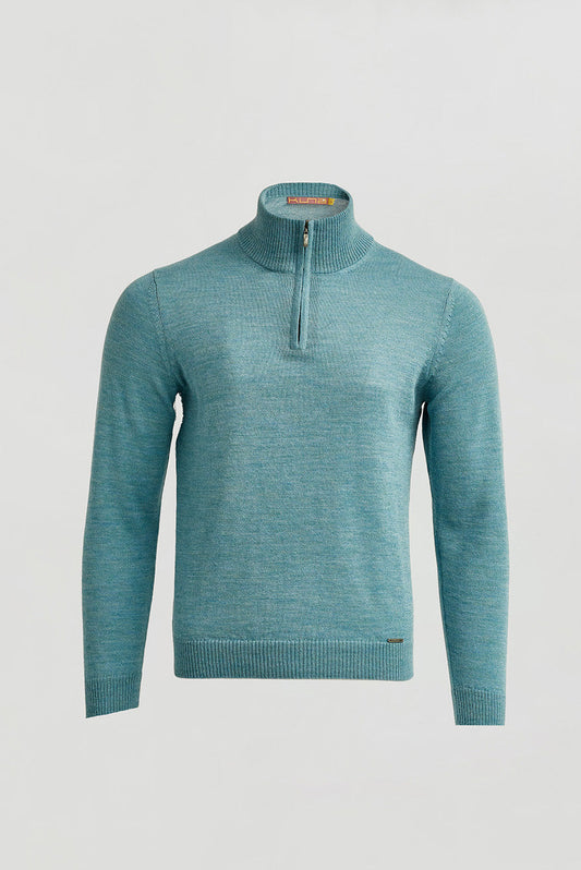 Albert Sweater in blue tone, featuring a high collar and partial zipper. Crafted from baby...