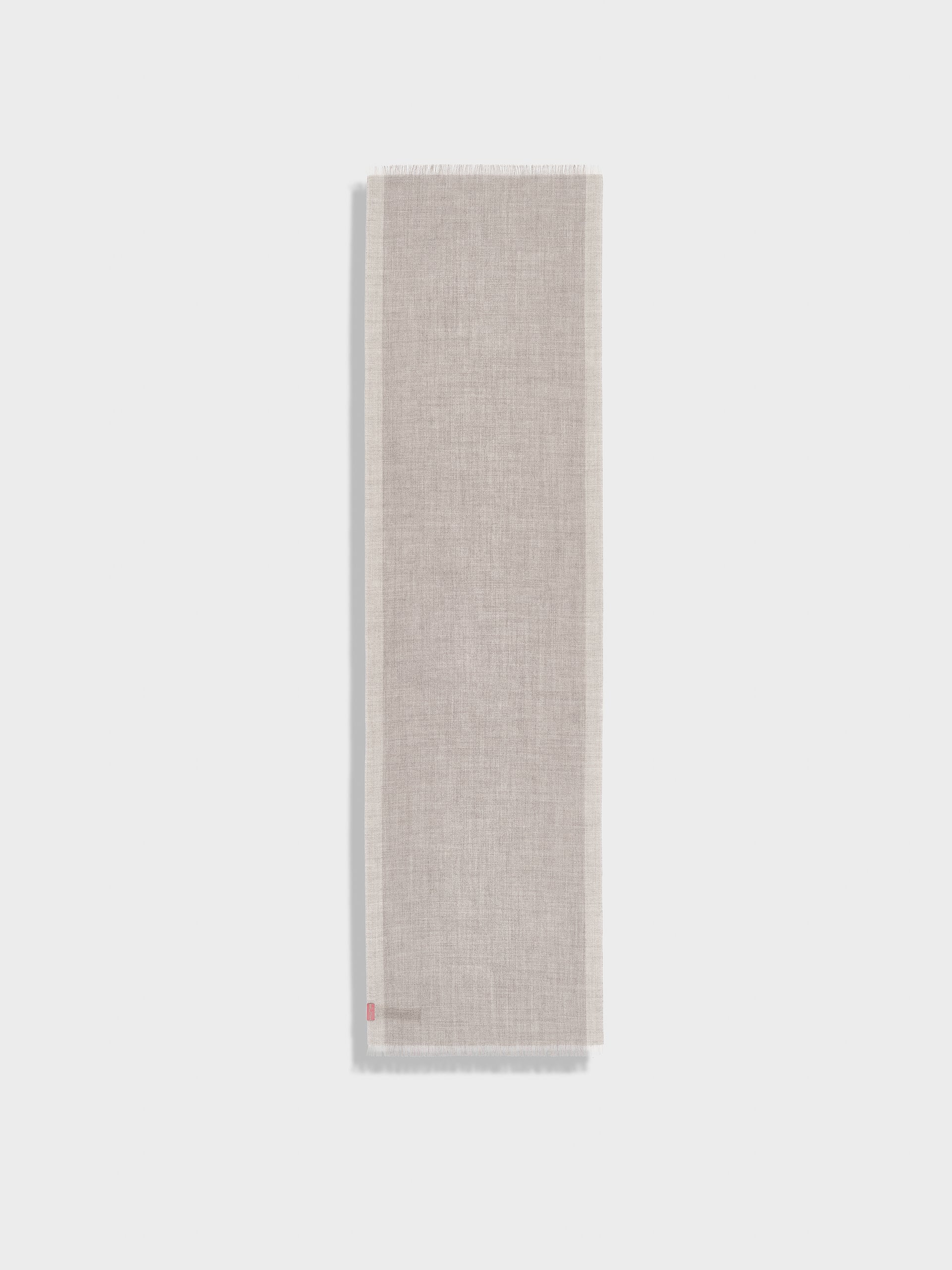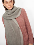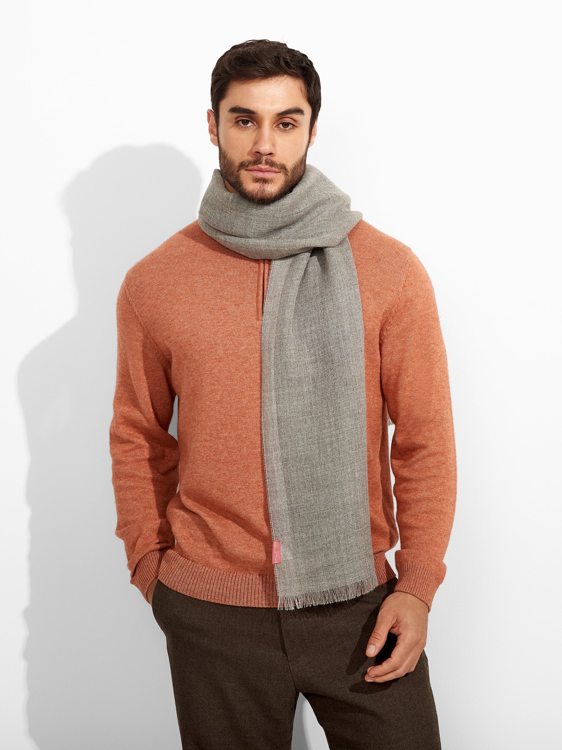 Rum Stole in gray tone, featuring contrasting lines along the sides and fine fringed edges. Crafted from eco baby alpaca, it offers warmth and softness. | Predominant material: Baby Alpaca