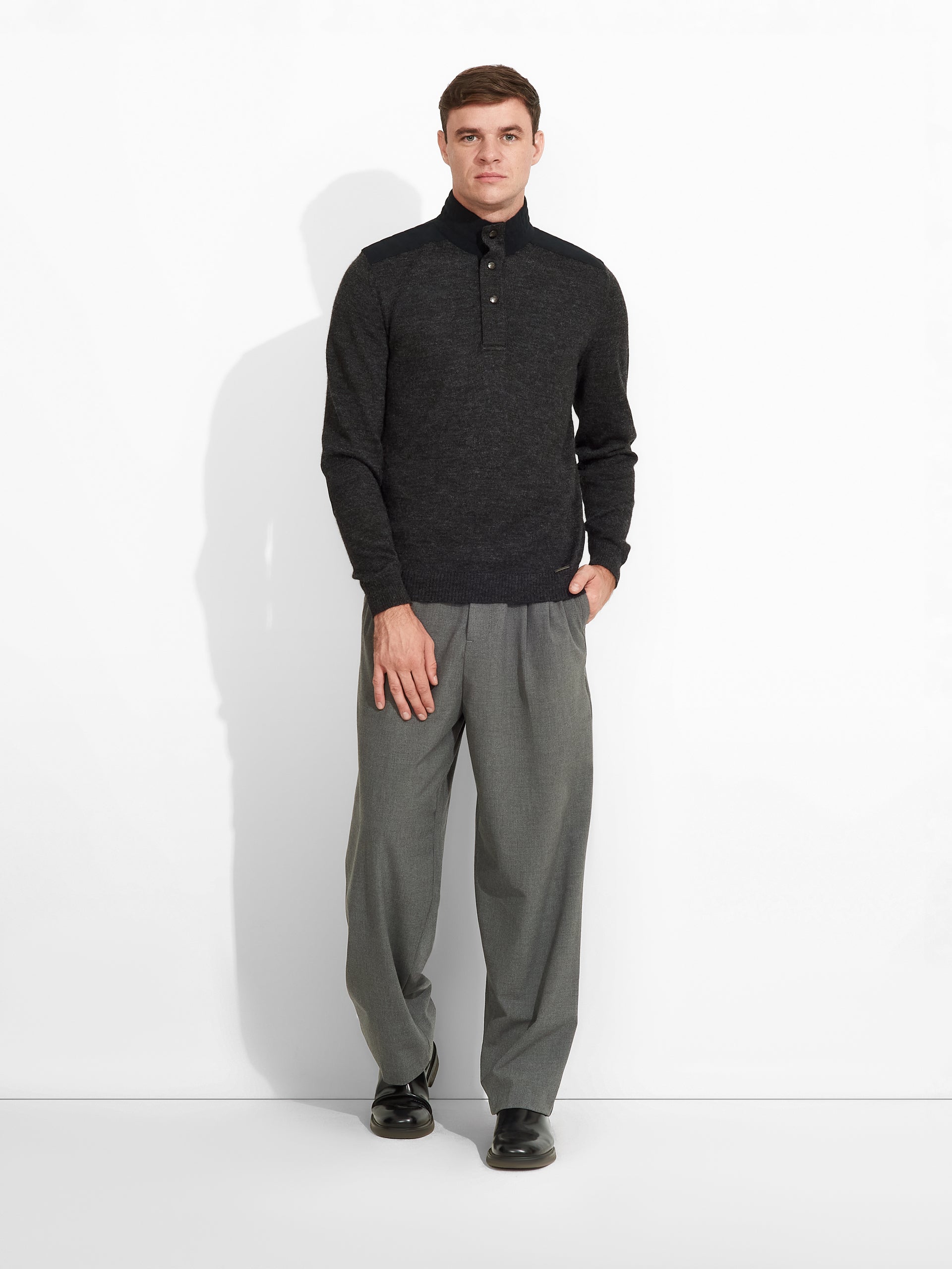 Zorba Sweater in gray tone, featuring a high collar and half-button placket with Alcantara application at the front. It showcases a yoke detail at the shoulders. Crafted from baby alpaca to provide warmth and comfort. | Predominant material: Baby Alpaca