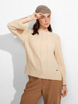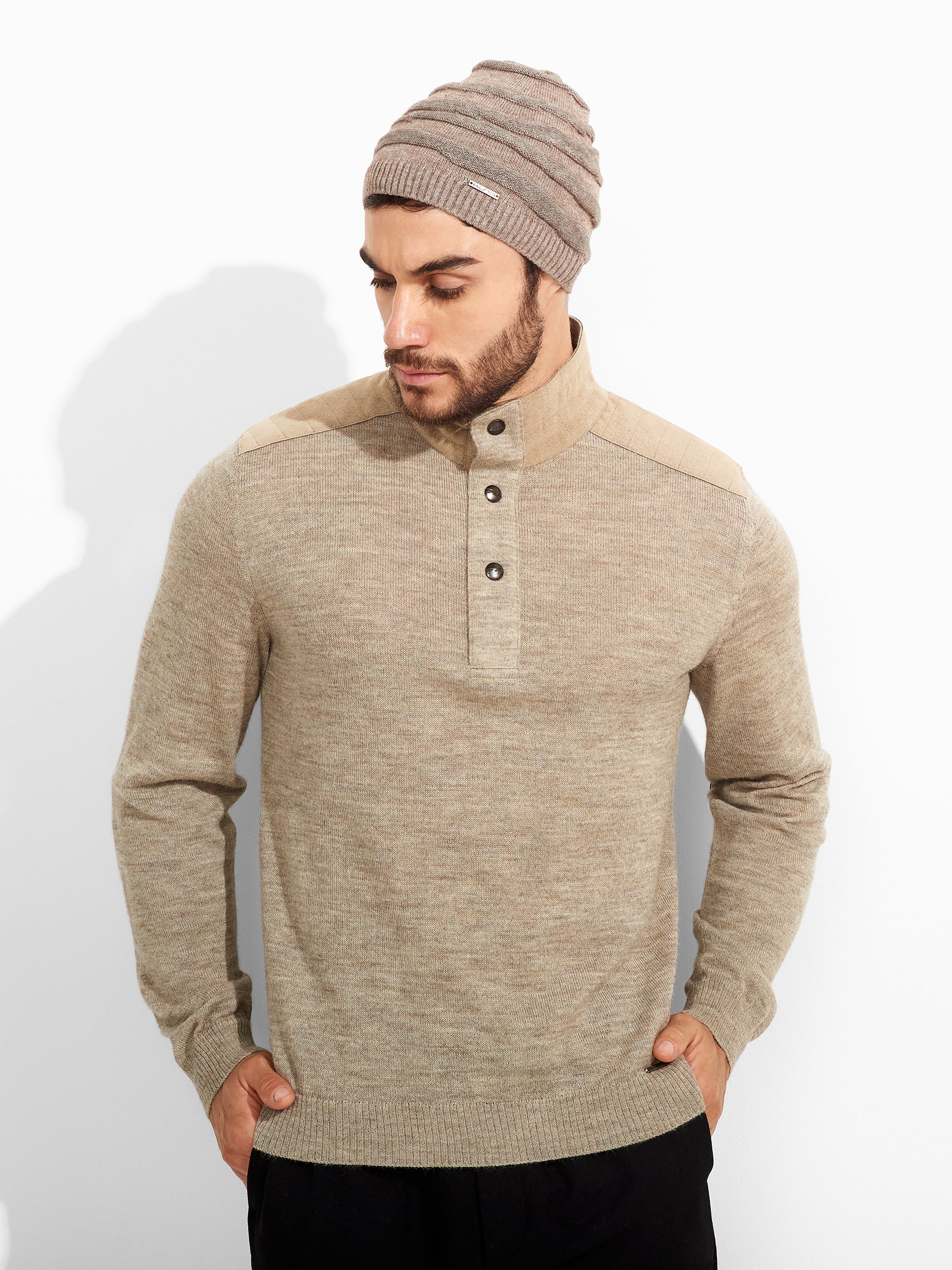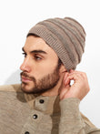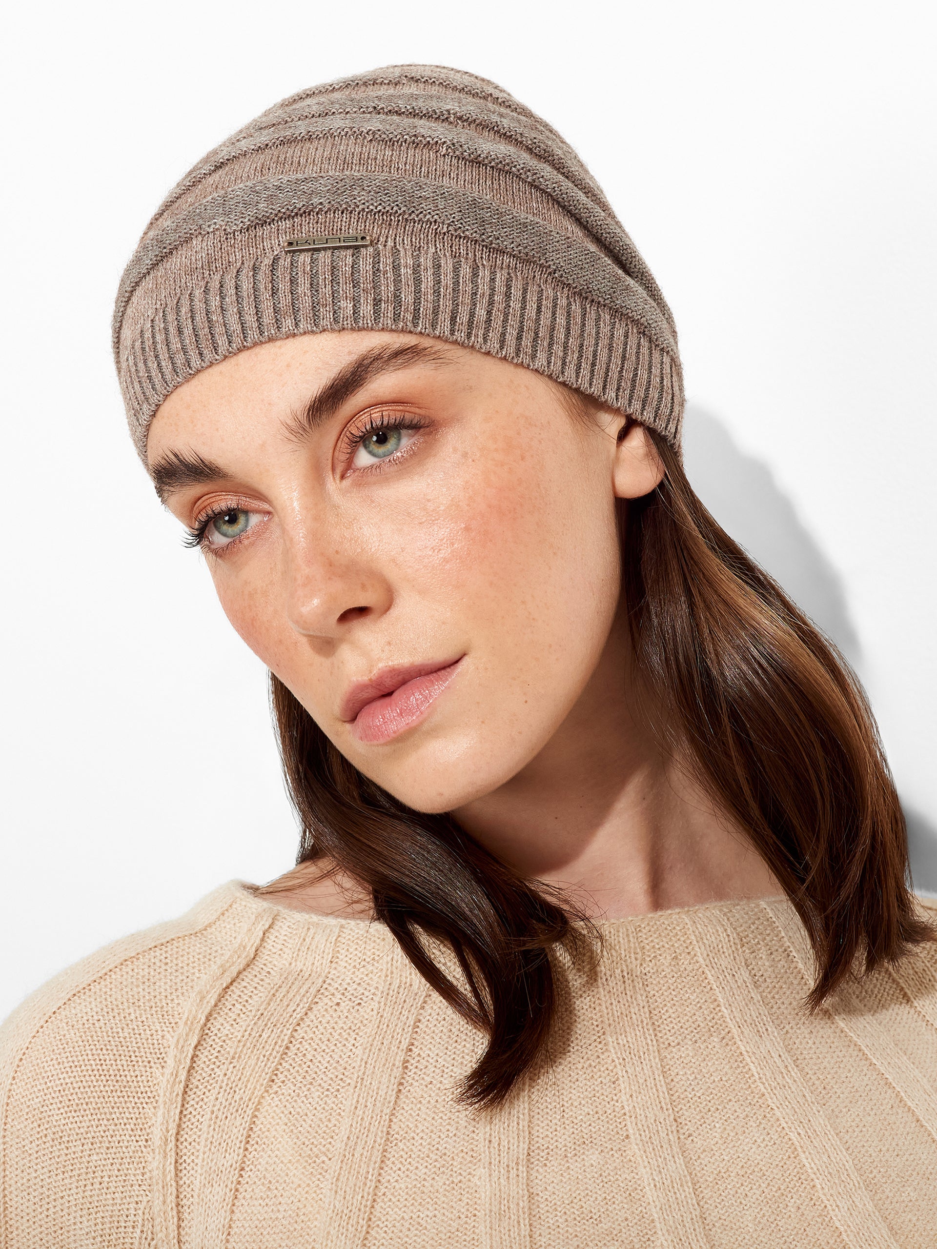 Zion Hat in gray tone, crafted in a knit with horizontally structured sections and a subtle wavy pattern. The lower edge features a vertically ribbed knit for a snug fit. Made from a blend of cotton and baby alpaca, it offers softness and comfort. | Predominant material: Cotton