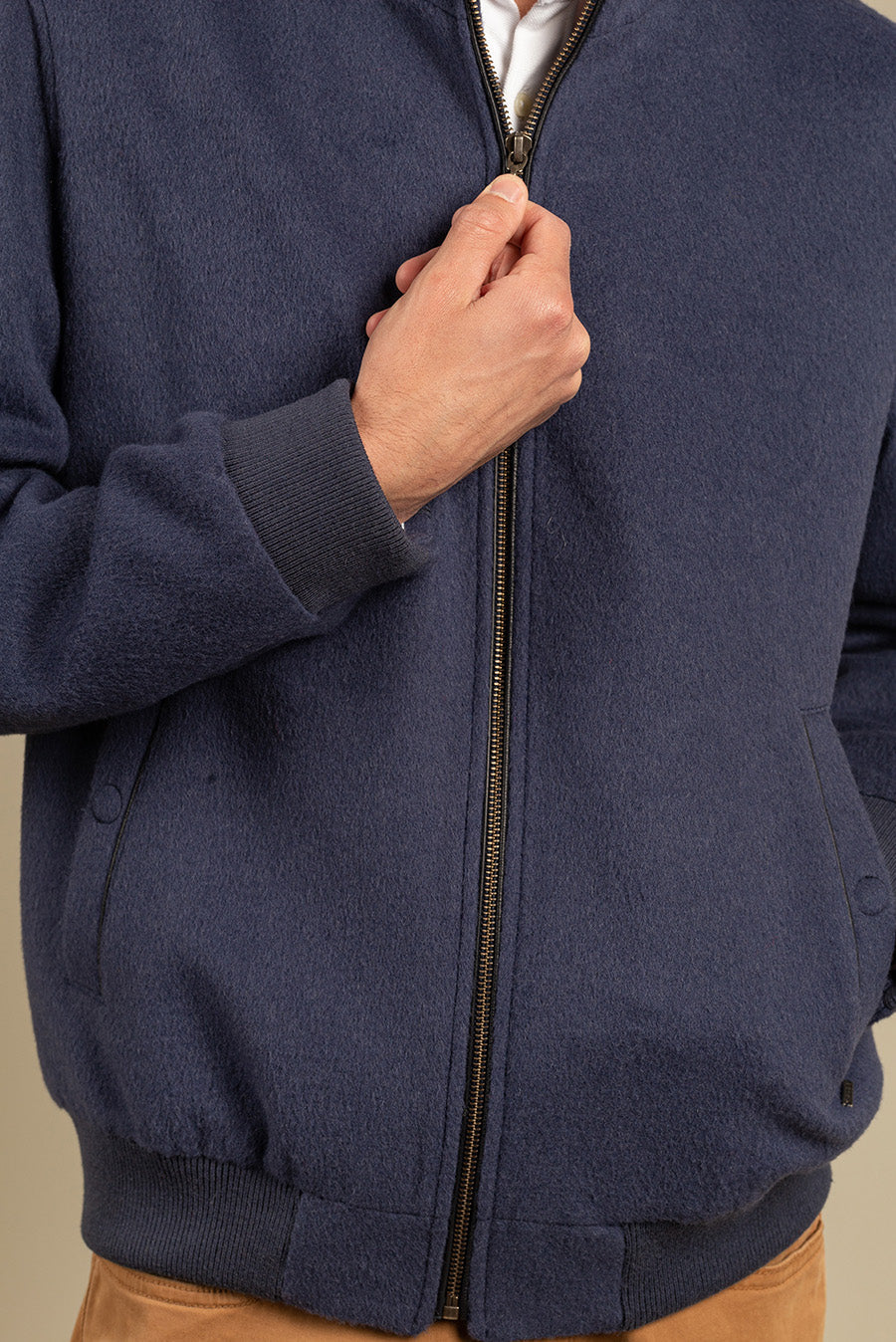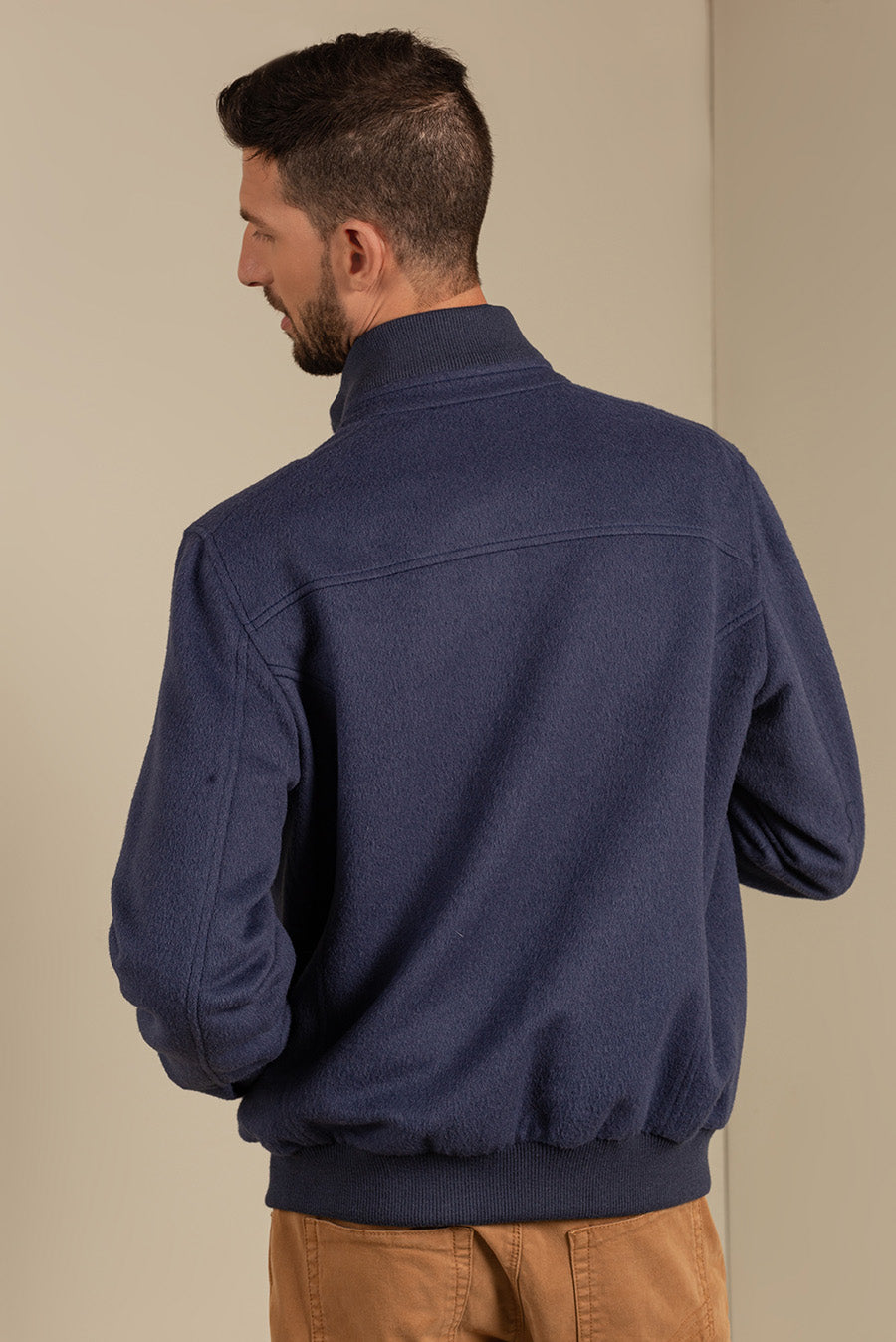 Comfortable baby alpaca jacket with wide zipper and waist band. Practical for its external and internal pockets and warm for its interior lining, our Nadrian jacket is the basic and casual garment that every man should have.