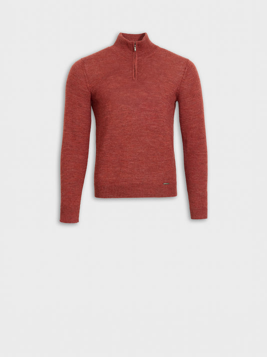 Albert Sweater in red tone, featuring a high collar and partial zipper. Crafted from baby...