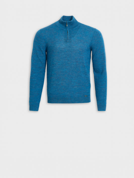 Zorba Sweater in blue tone, featuring a high collar and half-button placket with Alcantara application...