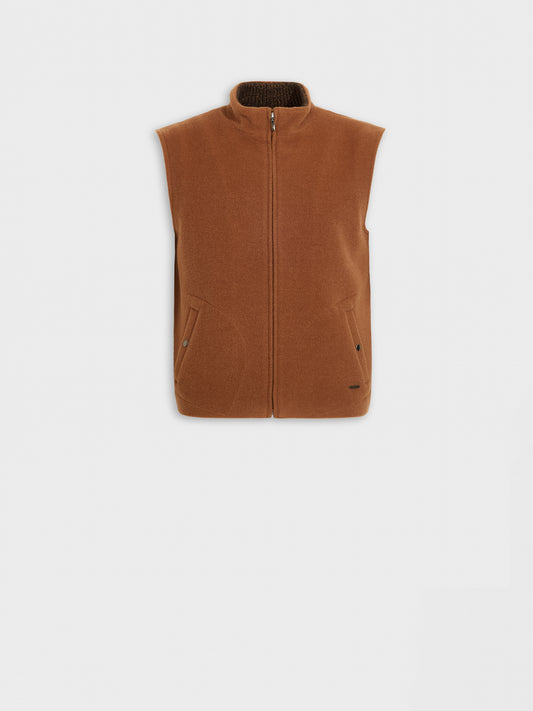 Zunkle Vest in camel tone, featuring a high collar, metal zipper closure, and pockets with...