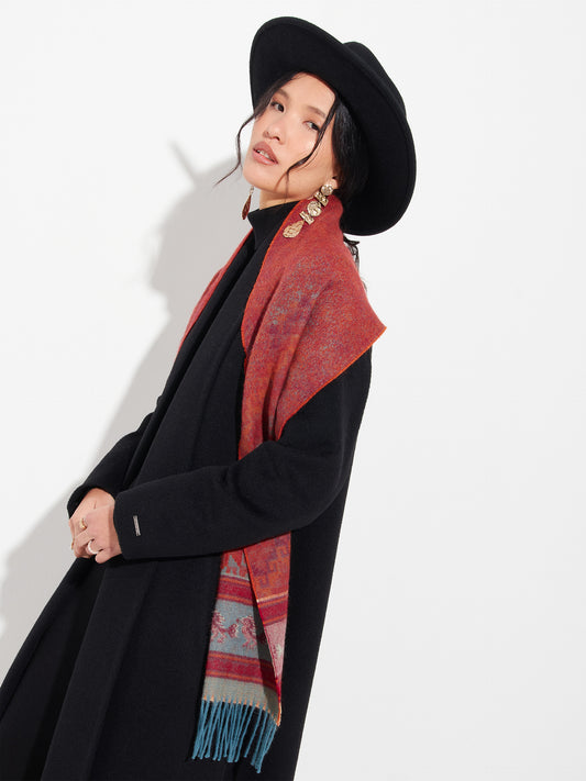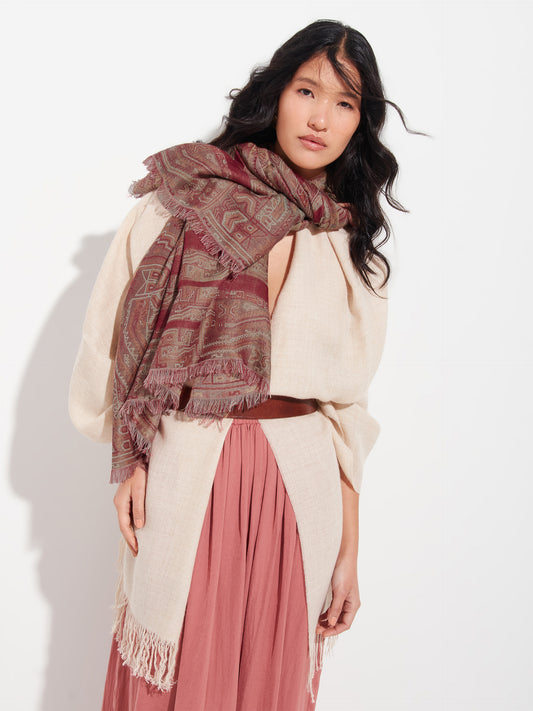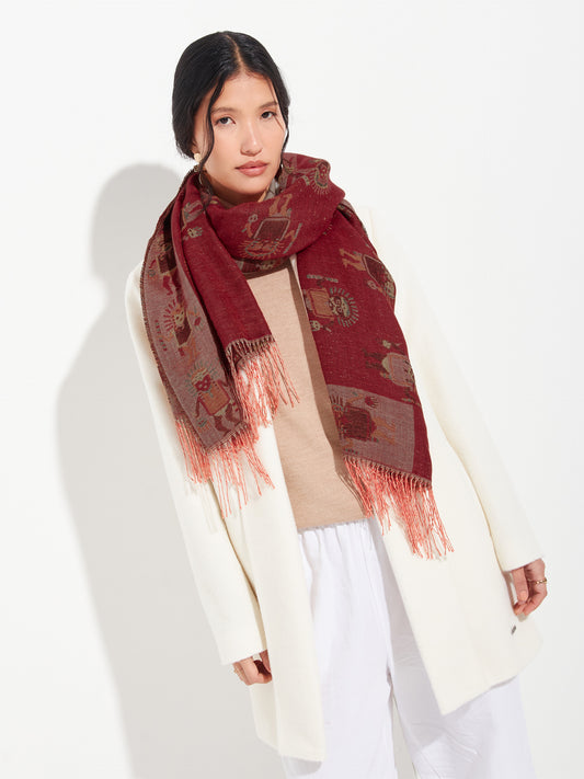 Chancay 37 scarf in red, made from 100% baby alpaca using a double-sided Jacquard technique....