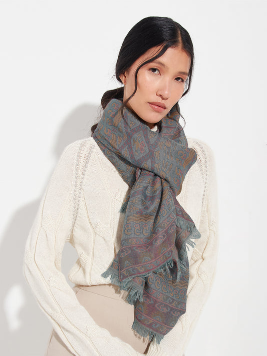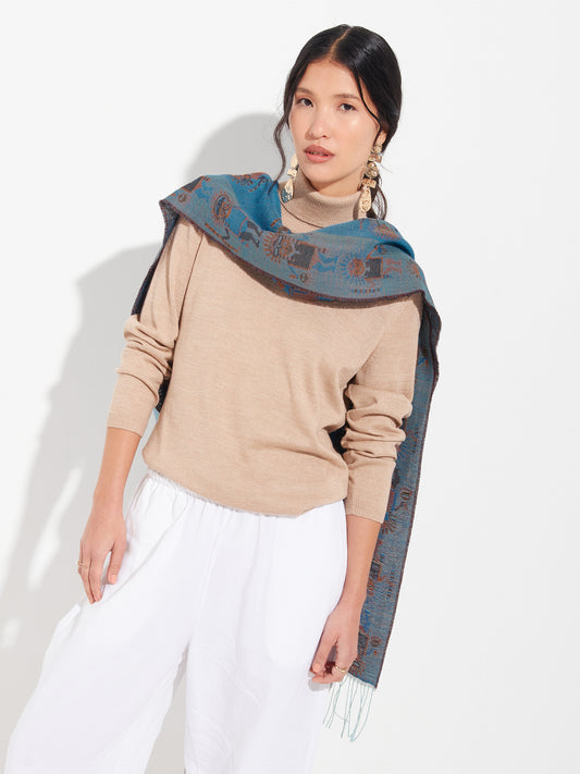 Chancay 36 scarf in blue, made from 100% baby alpaca using a double-sided Jacquard technique....