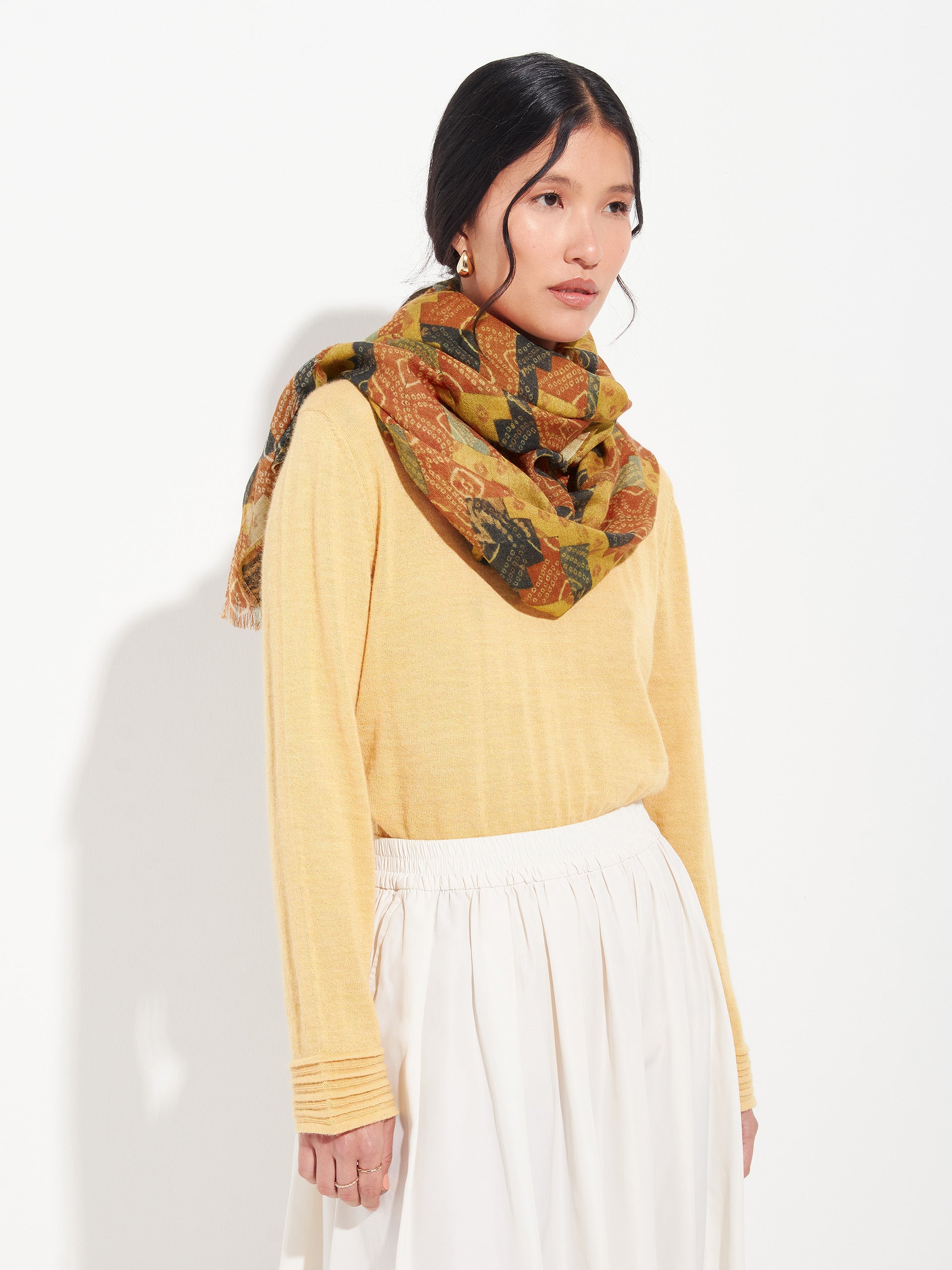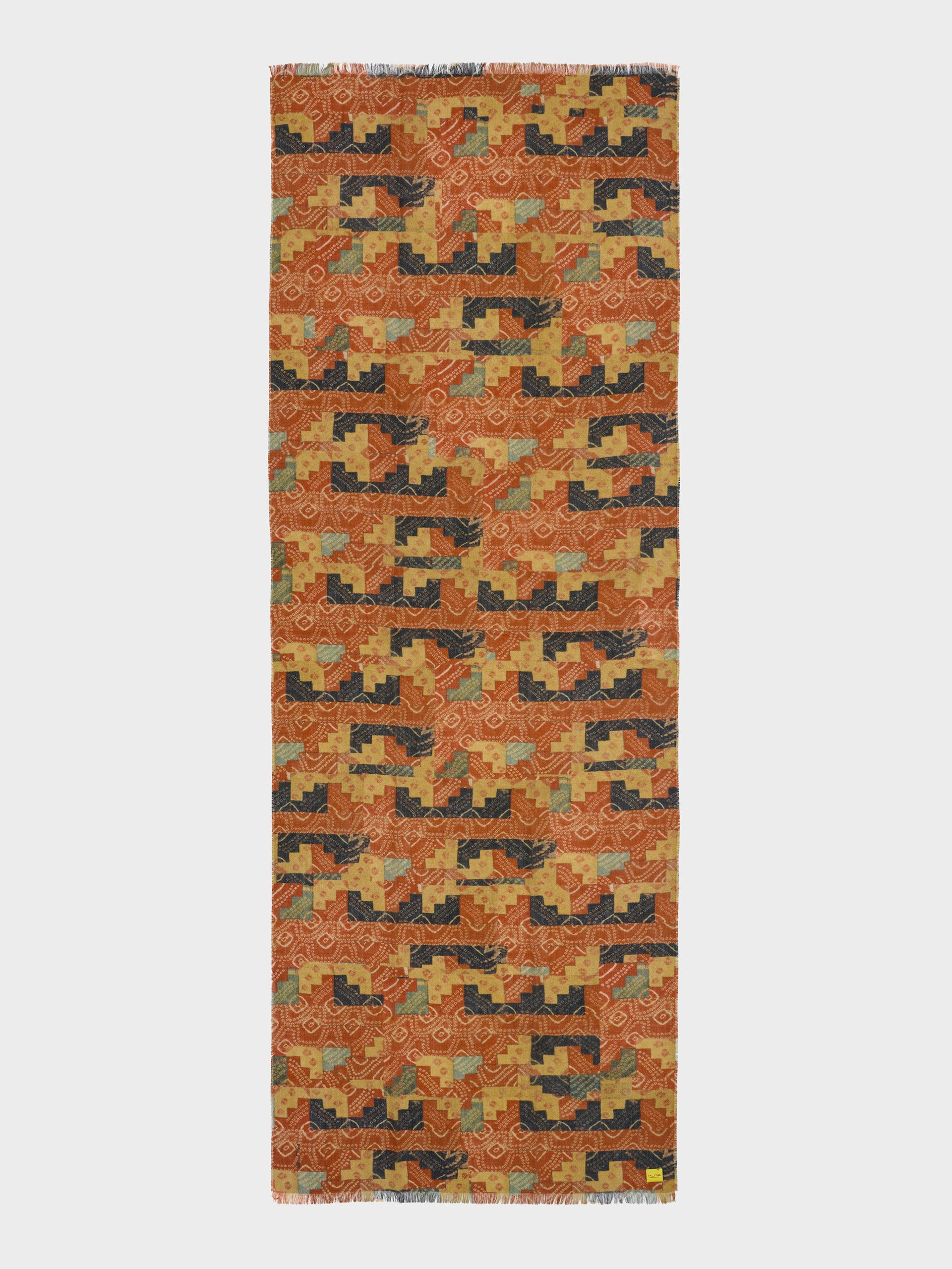 Huari 6 stole in multicolor tones, made from 70% baby alpaca and 30% silk, with digital printing on a taffeta (chiffon) base. Measuring 190/186 x 70 cm, it is a reversible garment inspired by the Huari culture, evoking the richness of ancient traditions through a design with cultural identity. | Predominant material: Baby Alpaca