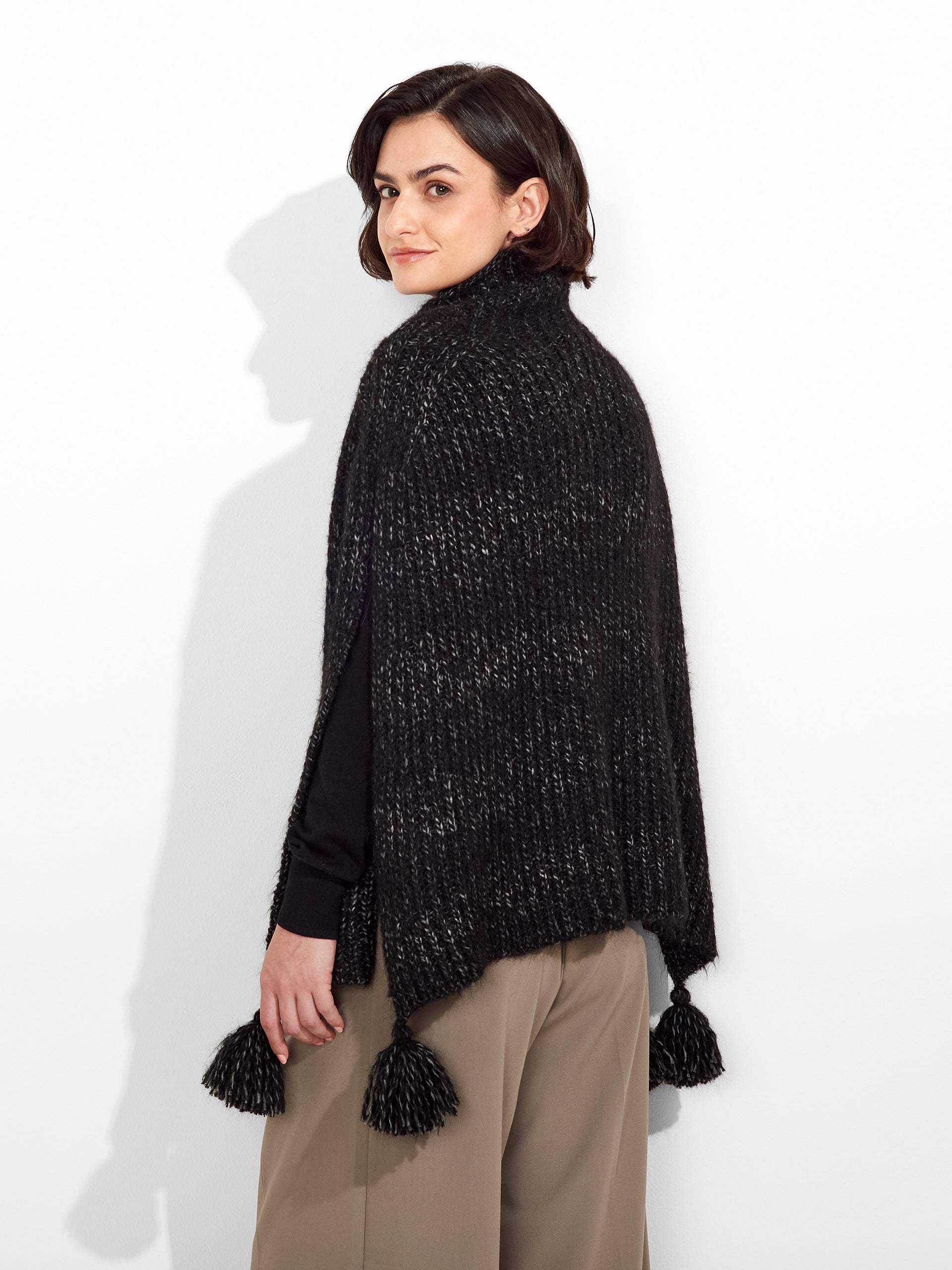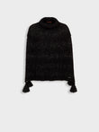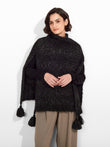 Zpazio Poncho in black tone, with a loose design and high collar that adds warmth and style. It features decorative pom-poms. Crafted from a blend of suri alpaca, baby alpaca, and wool, it offers a warm and sophisticated texture. | Predominant material: Suri Alpaca
