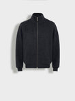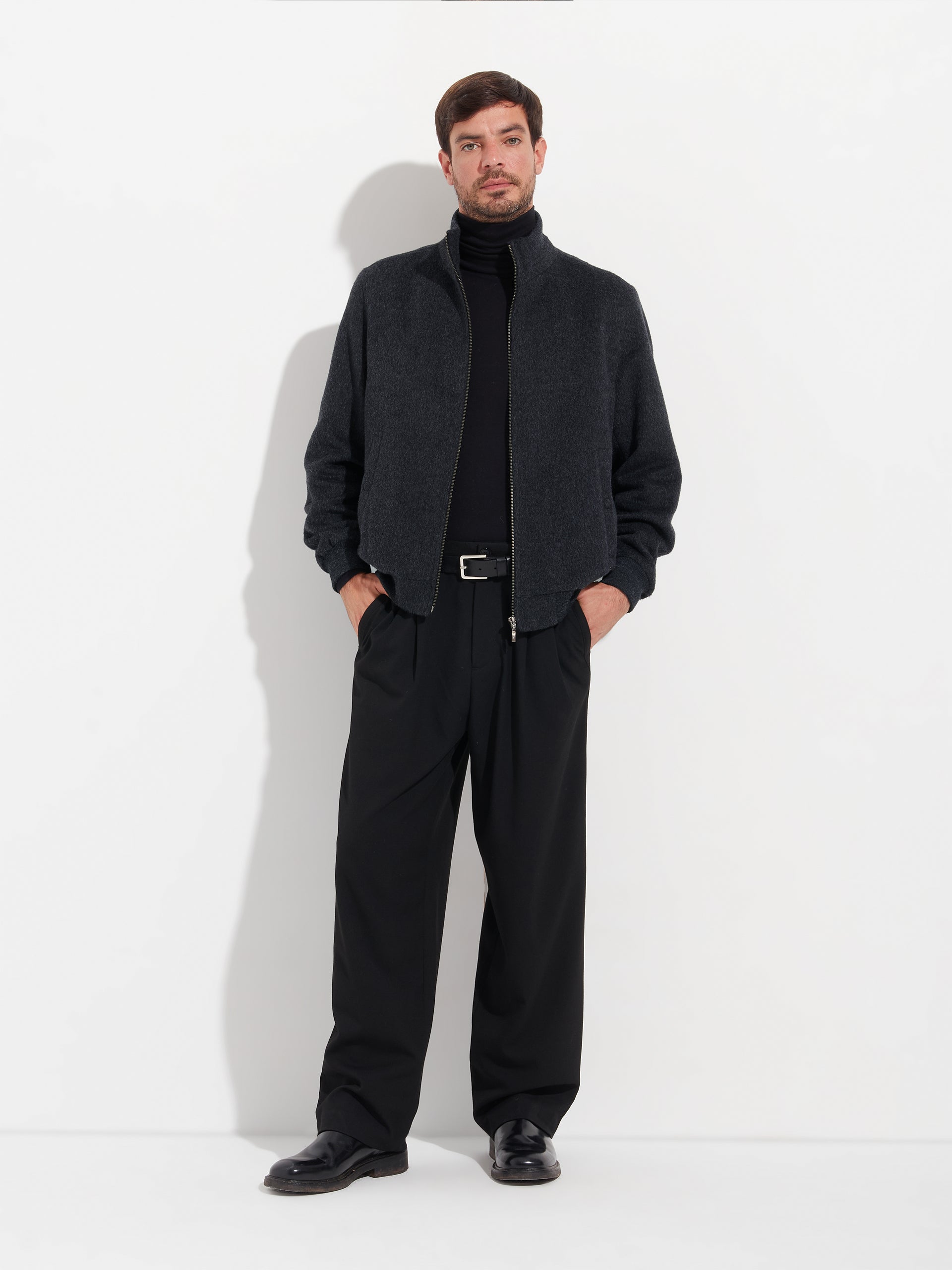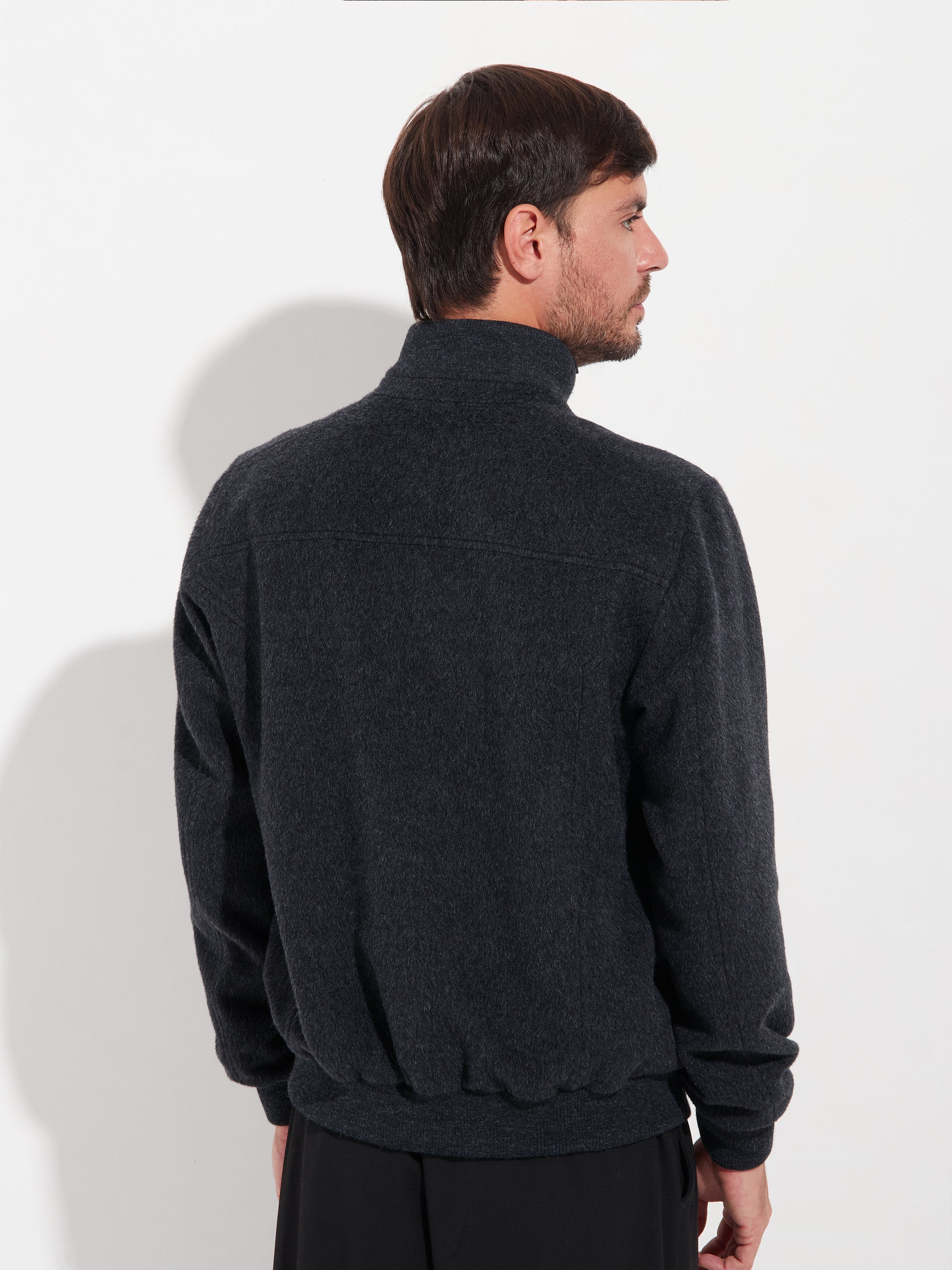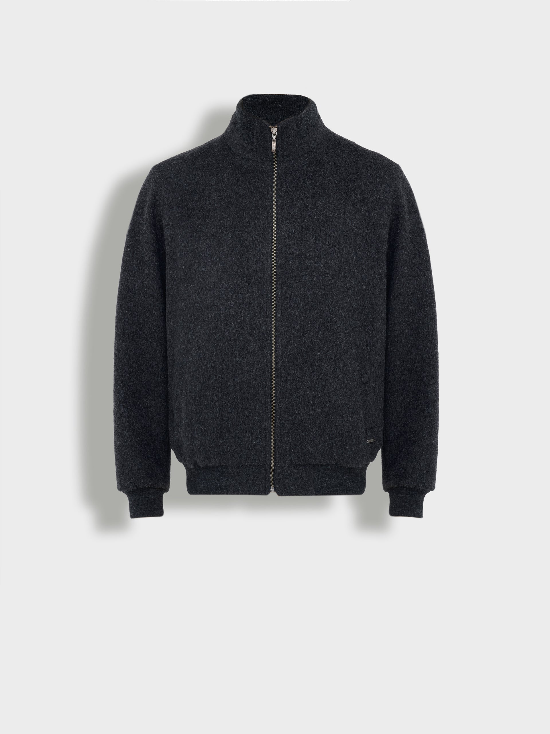 Alois jacket in grey color, made of baby alpaca and wool. It has metal zipper, inner lining and knitted details on cuffs, waistband and inner collar. Bomber design that combines elegance, warmth and comfort. | Predominant material: Baby Alpaca