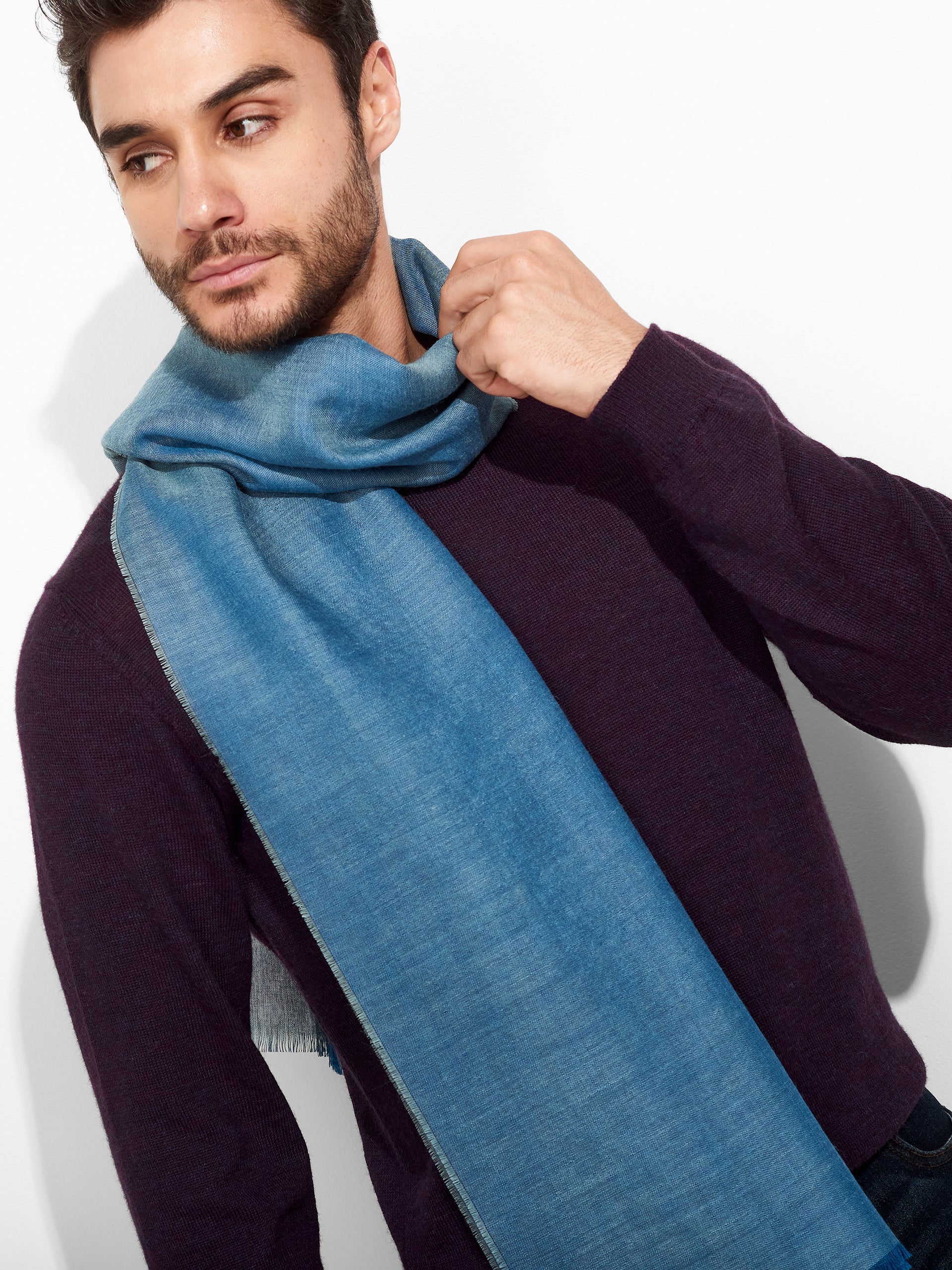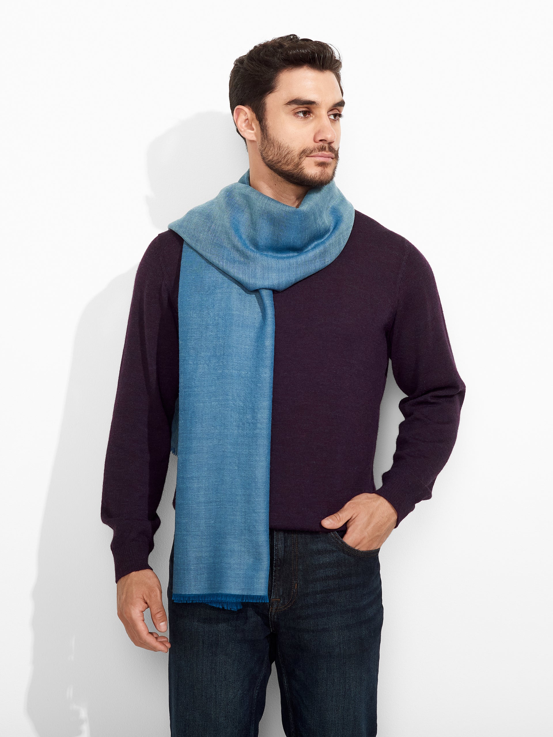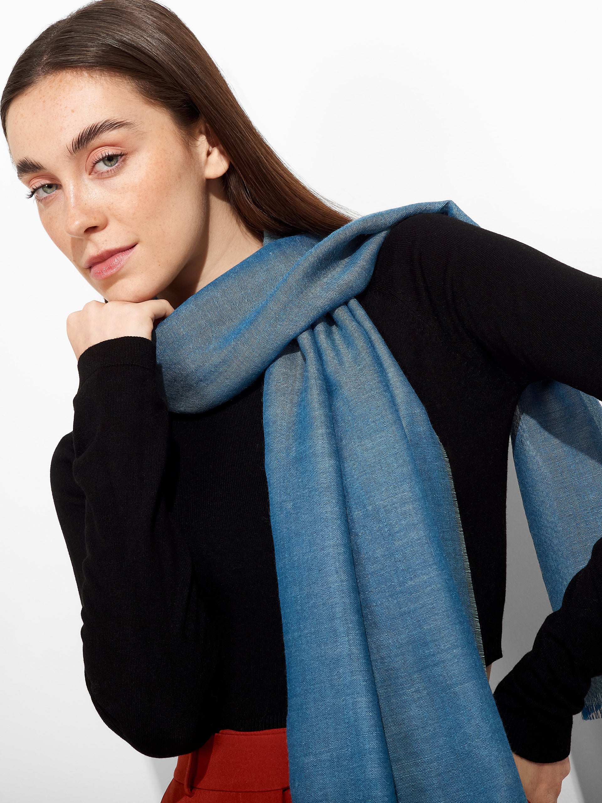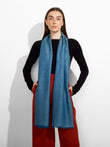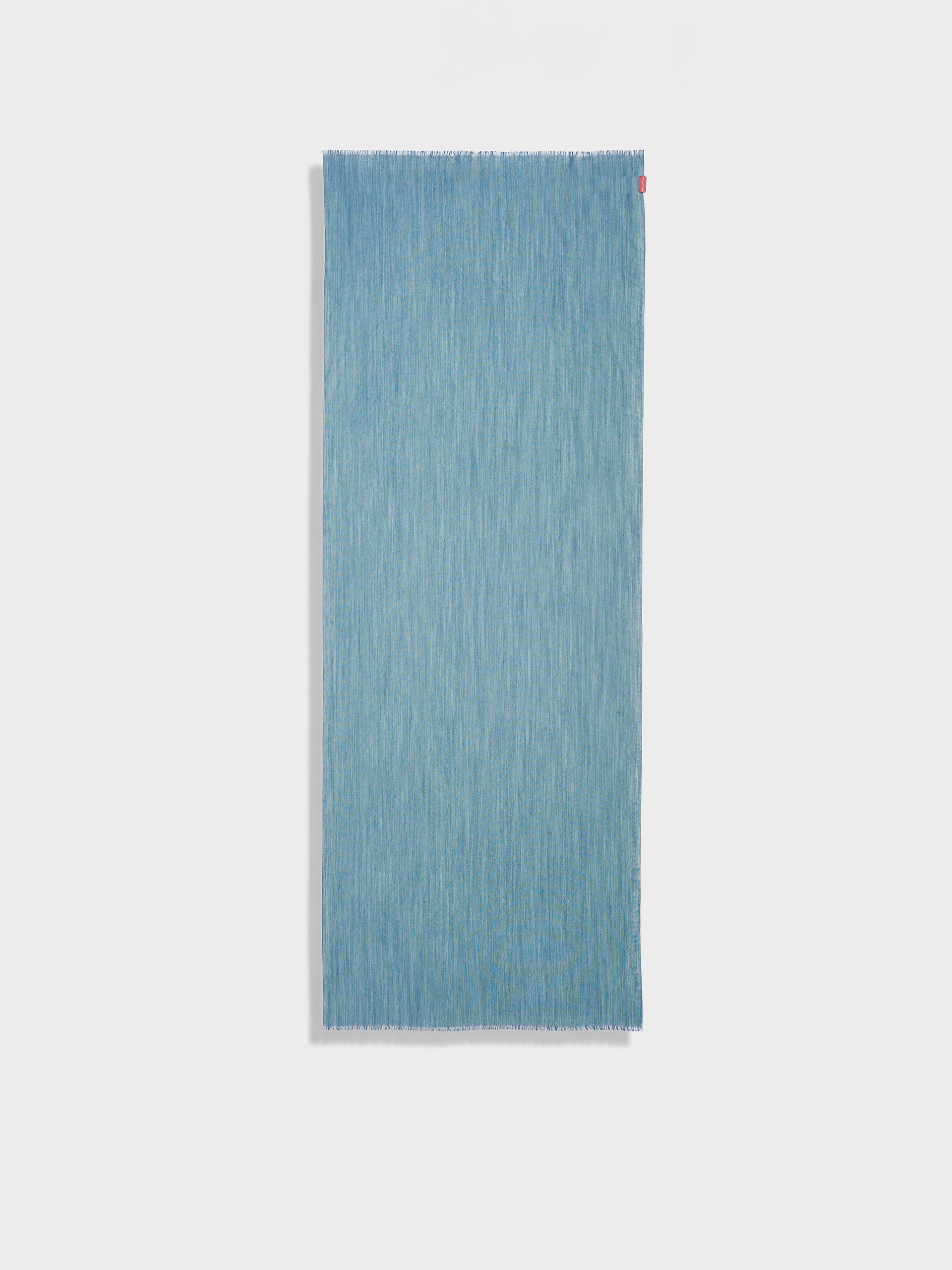 Zaina Stole in light blue tone, with a subtle iridescent effect, featuring fine fringed edges. Crafted from baby alpaca and silk, it combines lightness and softness. | Predominant material: Baby Alpaca