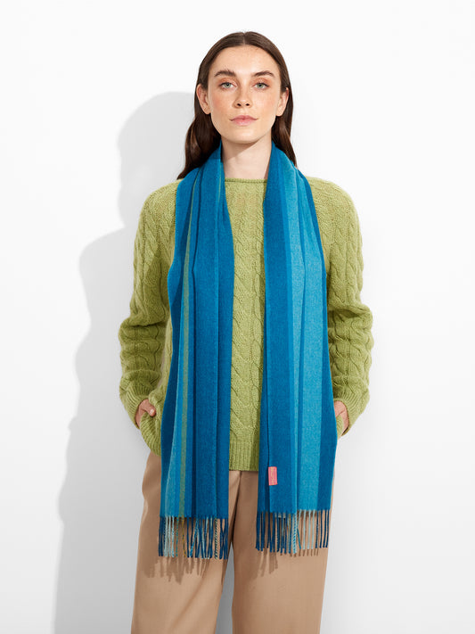 Perejil Scarf in turquoise tone, featuring wide vertical stripes. The thick fringed edges provide a...