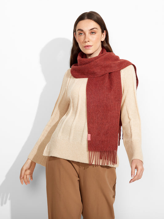 Tundra Scarf in red tone, featuring a double-faced design that highlights two dominant colors. Finished...