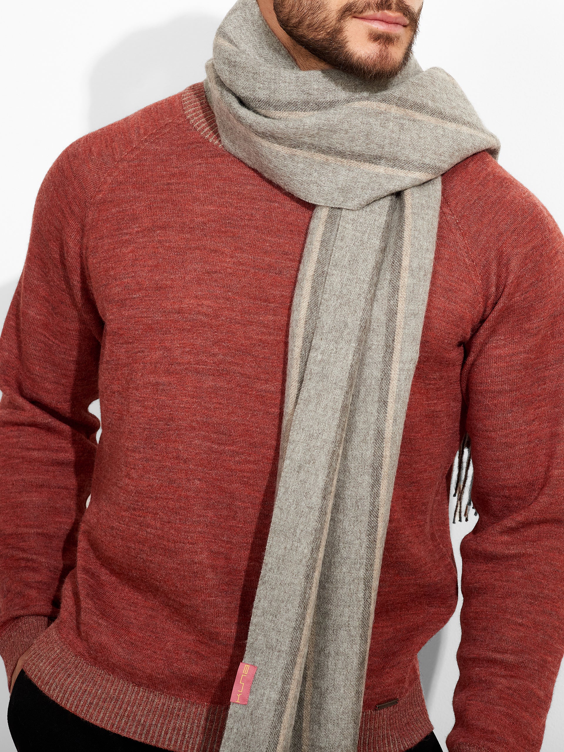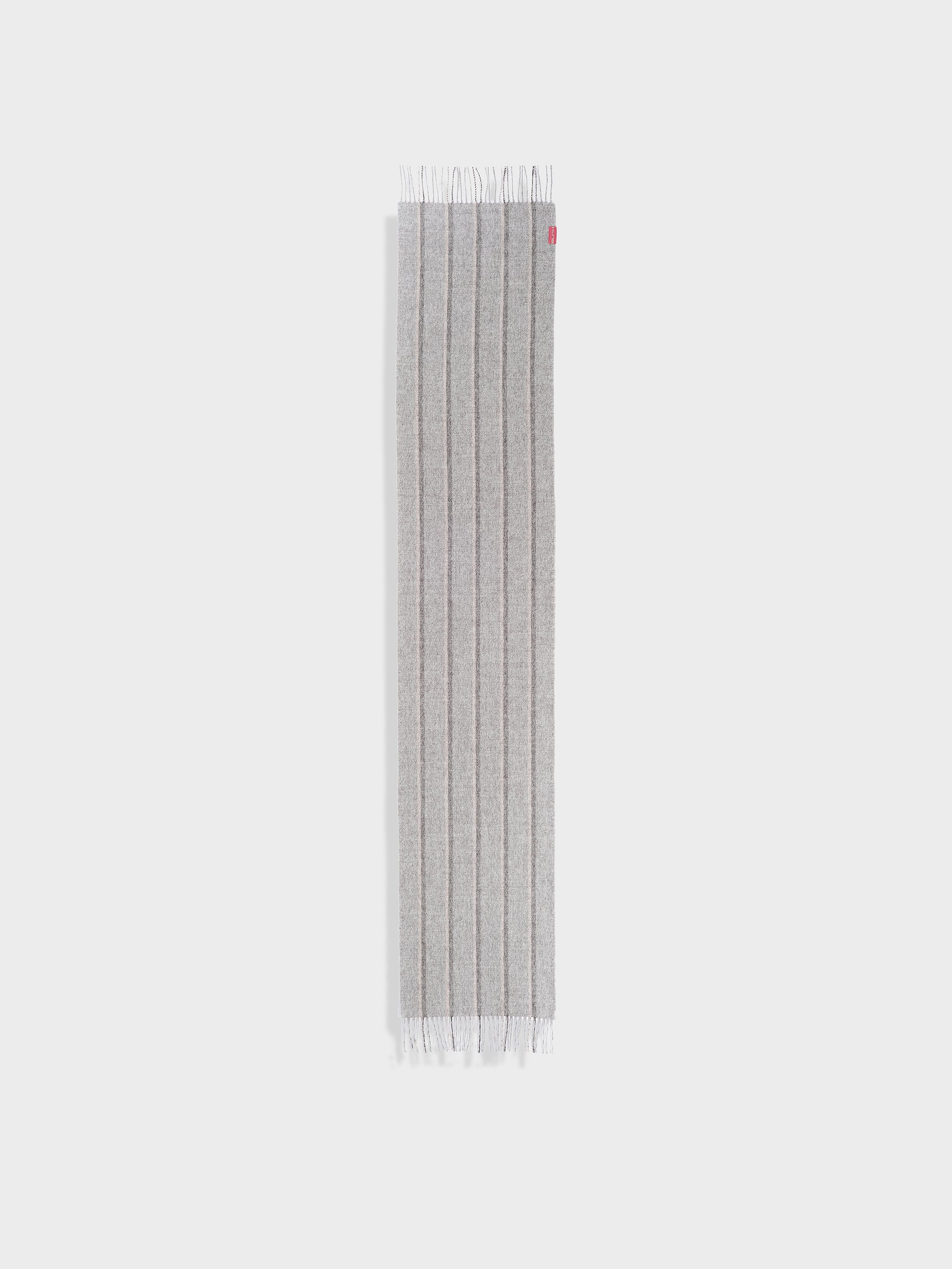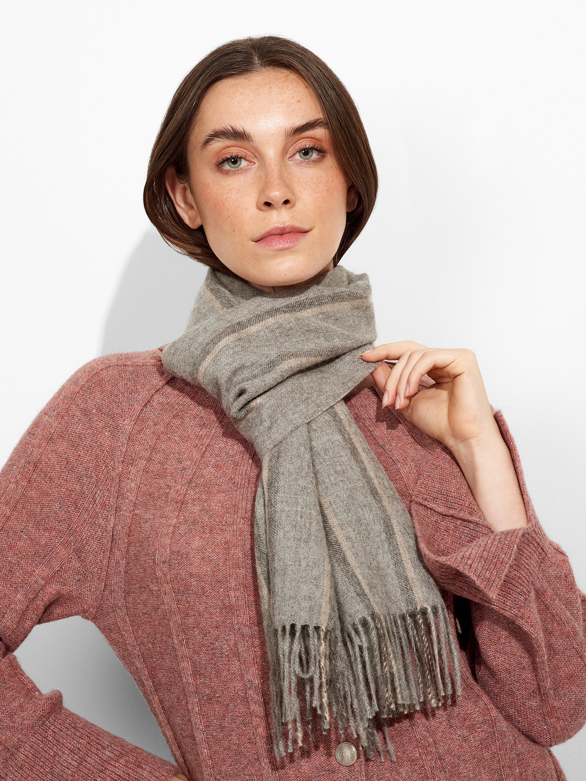Jean Scarf in gray tone, featuring fine vertical stripes that add a subtle touch of elegance. The fringed edges complement its style. Crafted from eco baby alpaca, it offers warmth and exceptional softness. | Predominant material: Baby Alpaca