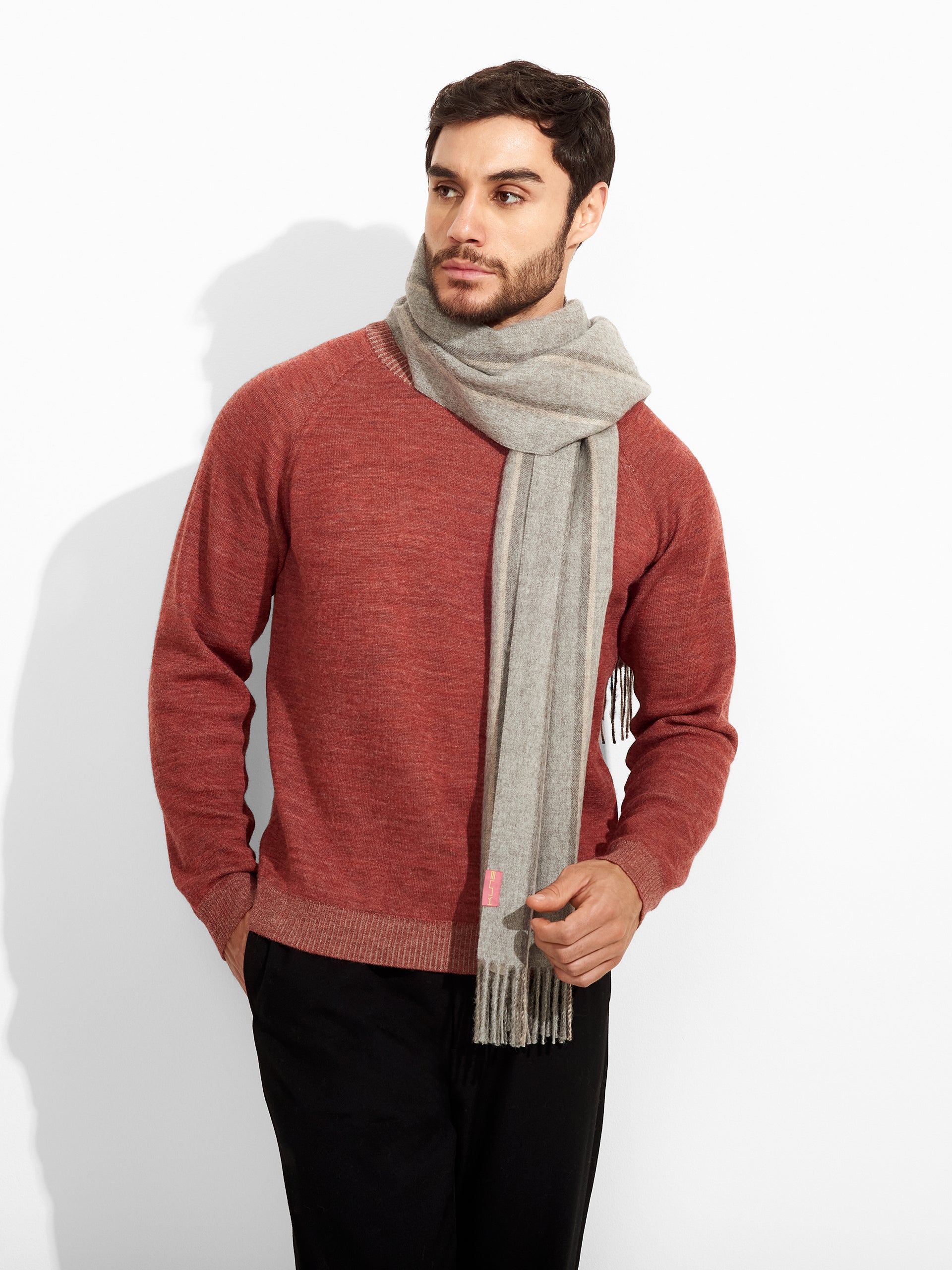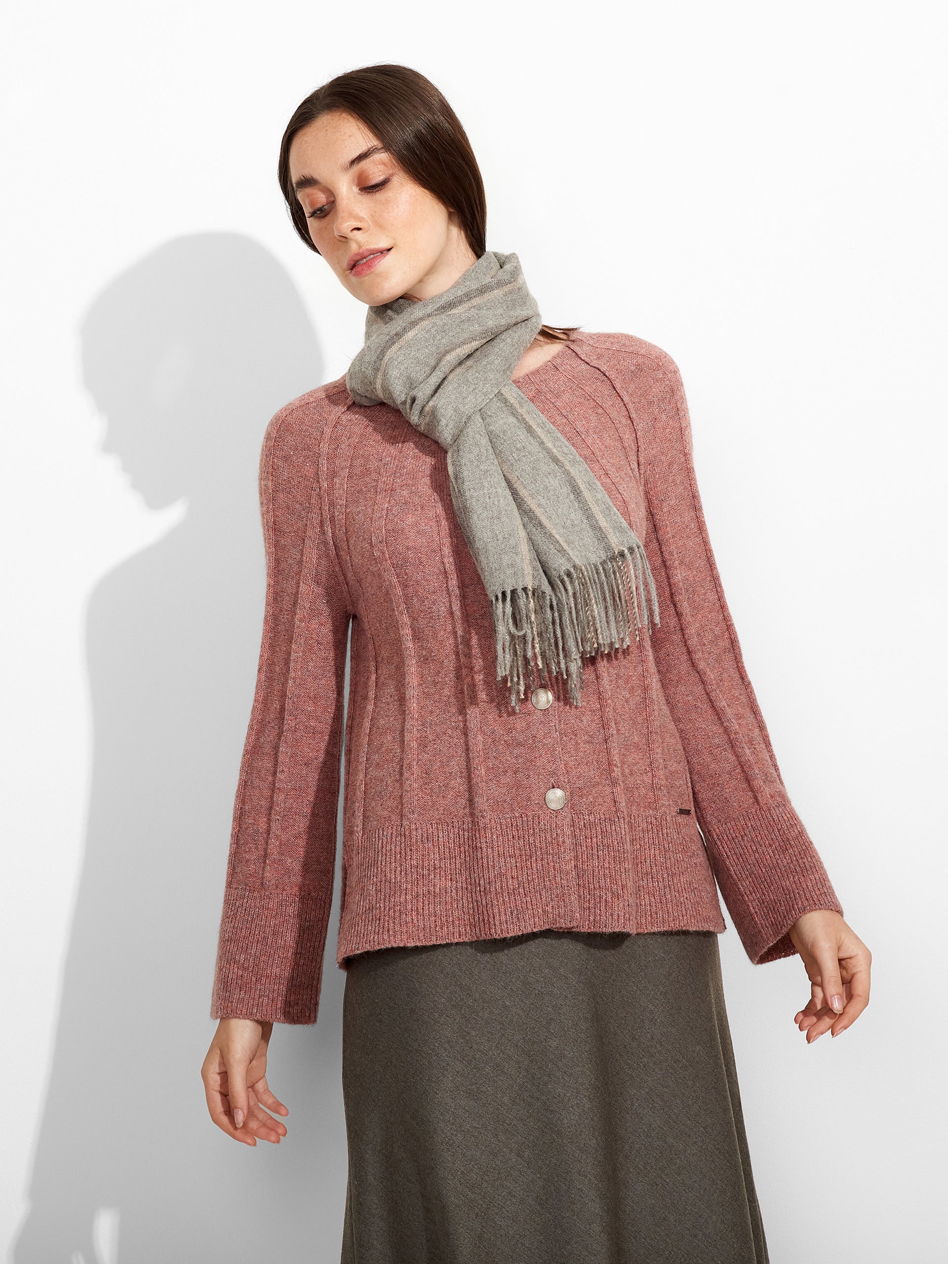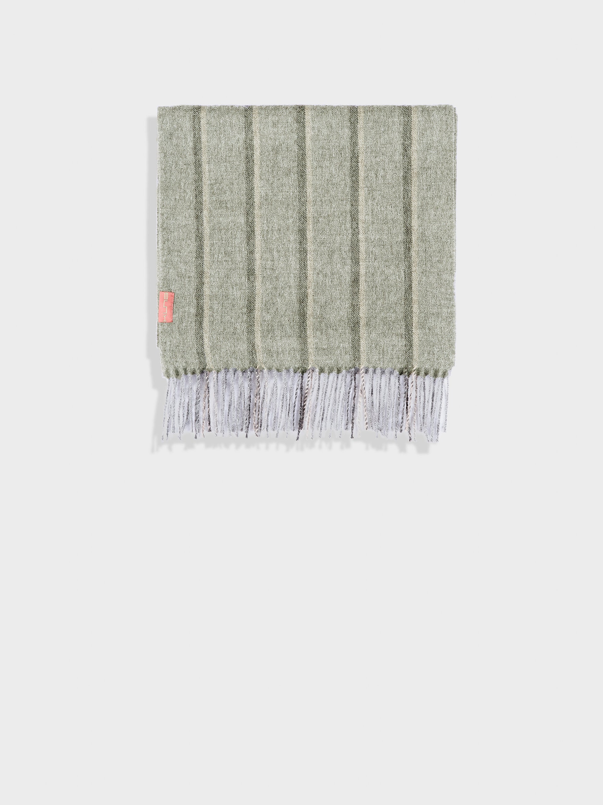 Jean Scarf in gray tone, featuring fine vertical stripes that add a subtle touch of elegance. The fringed edges complement its style. Crafted from eco baby alpaca, it offers warmth and exceptional softness. | Predominant material: Baby Alpaca