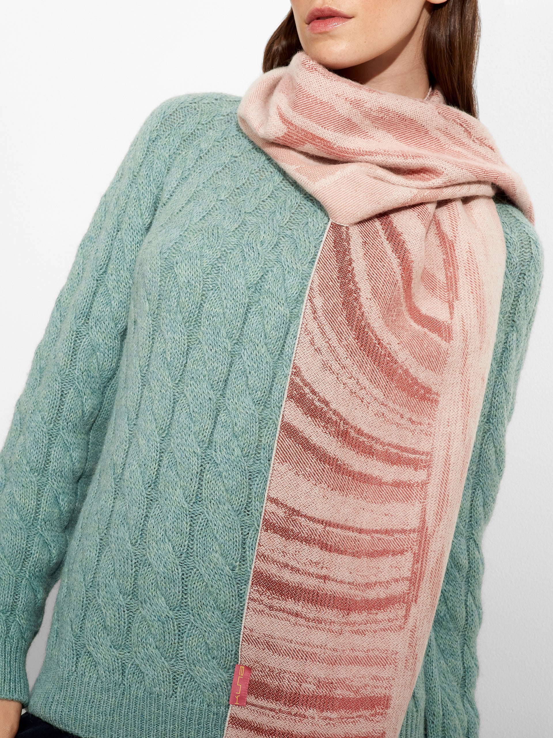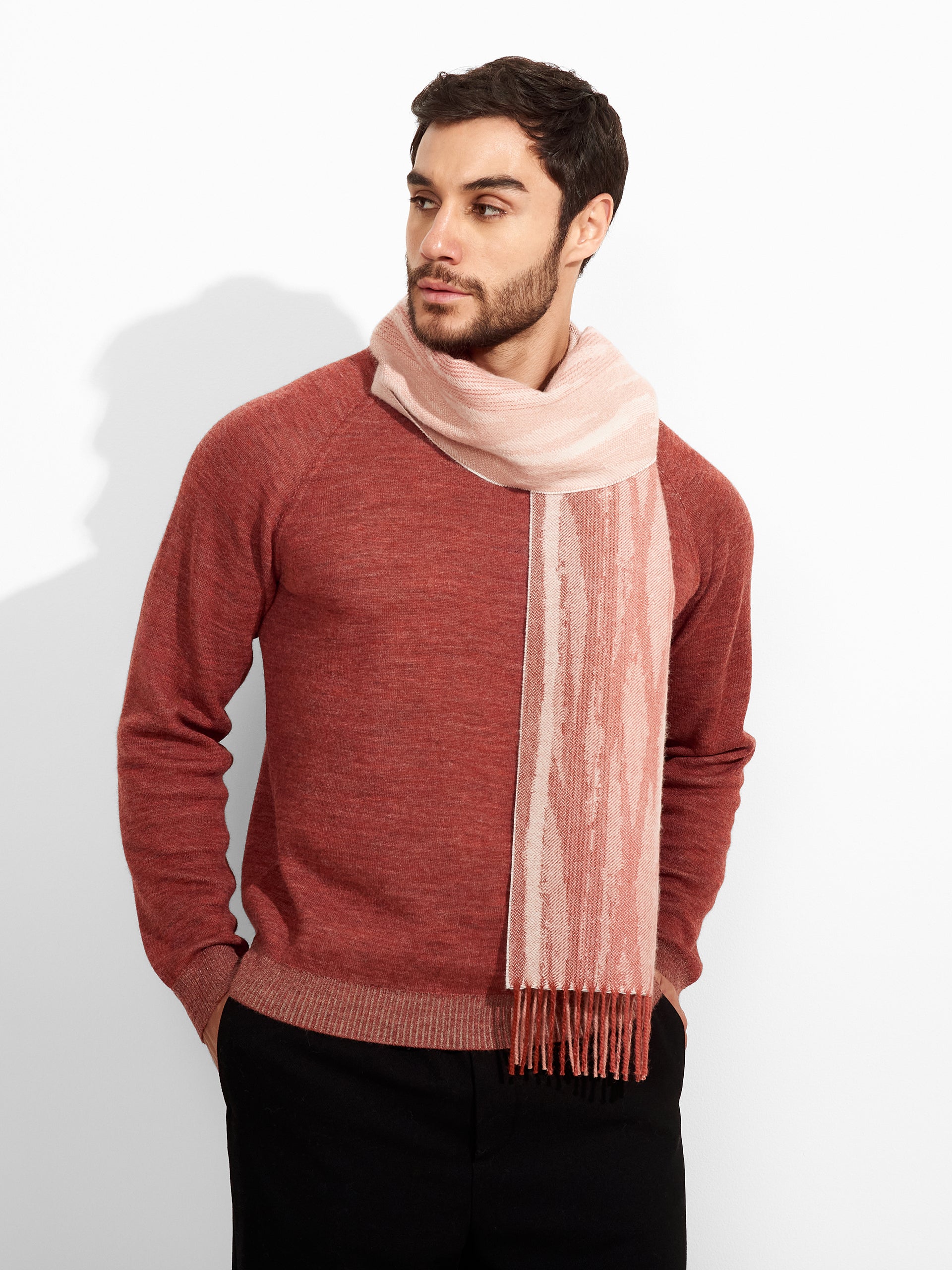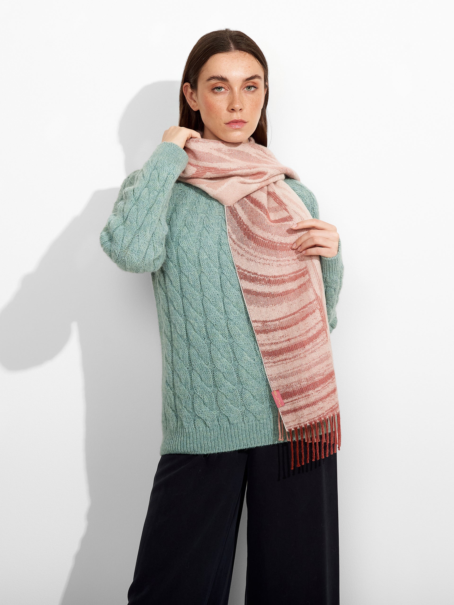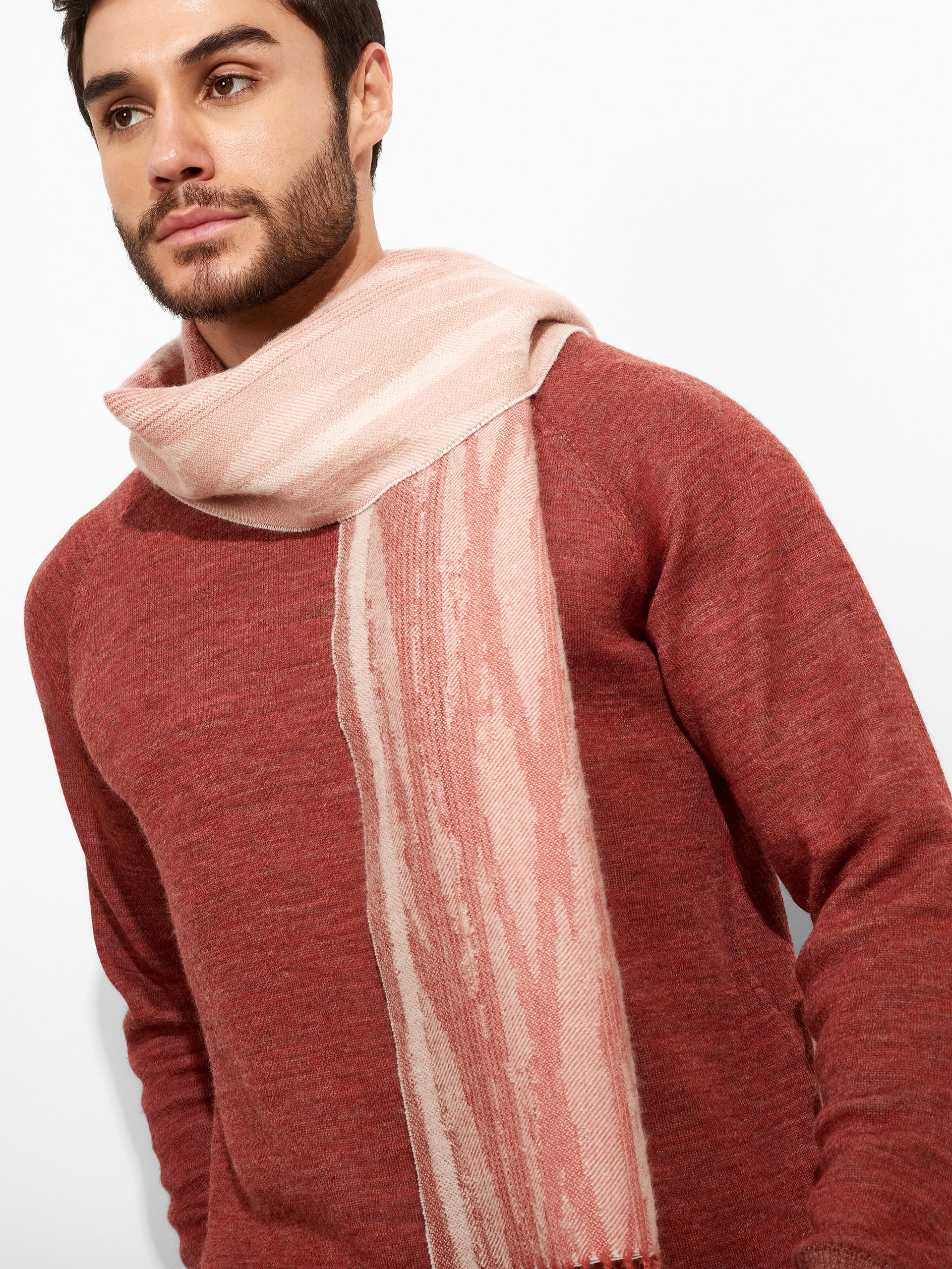 Zagoni Scarf in pink tone, featuring irregular stripe design. The fine fringed edges complete the finish with a delicate touch. Crafted from baby alpaca, it offers warmth and exceptional softness. | Predominant material: Baby Alpaca
