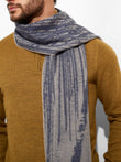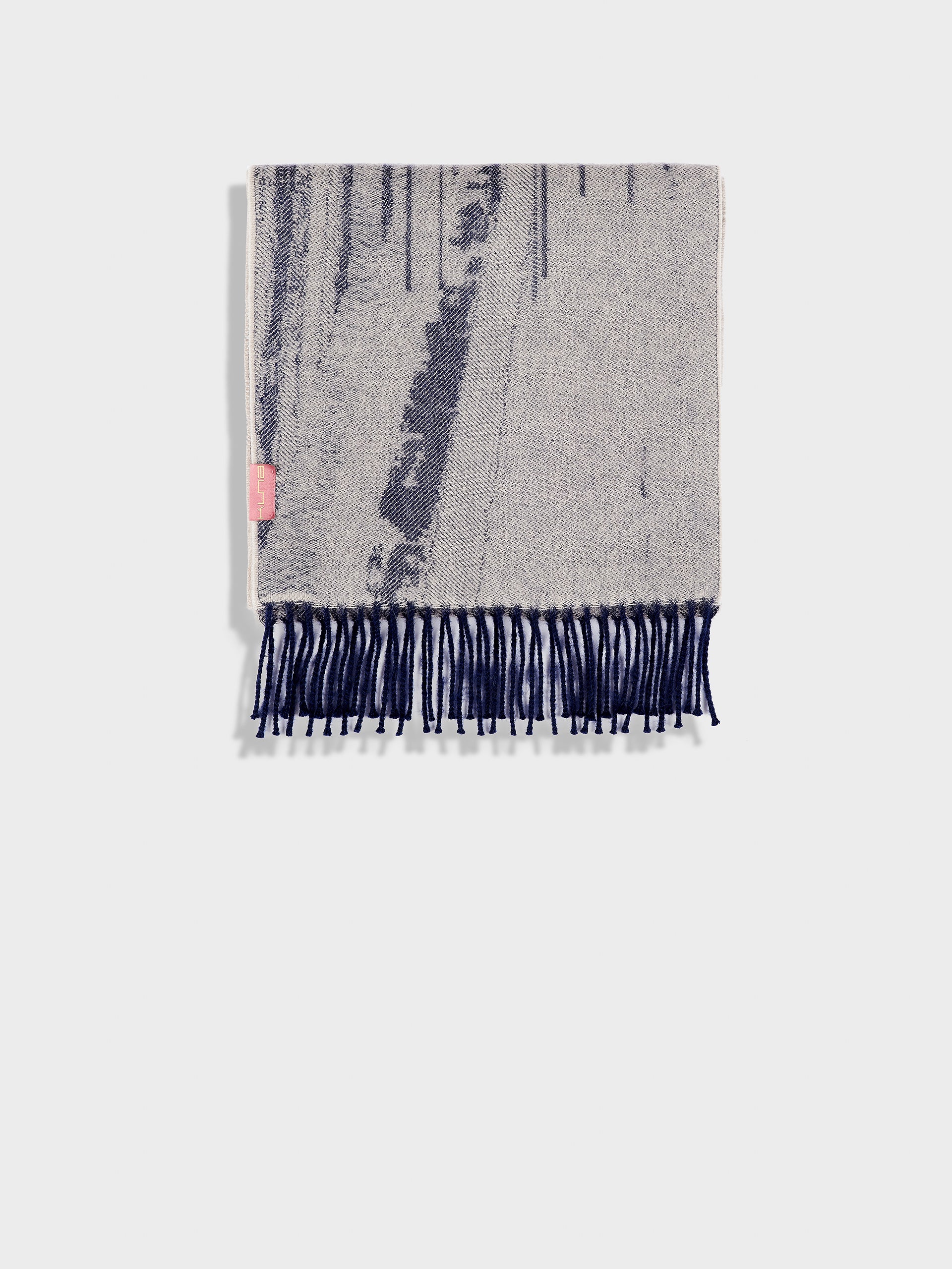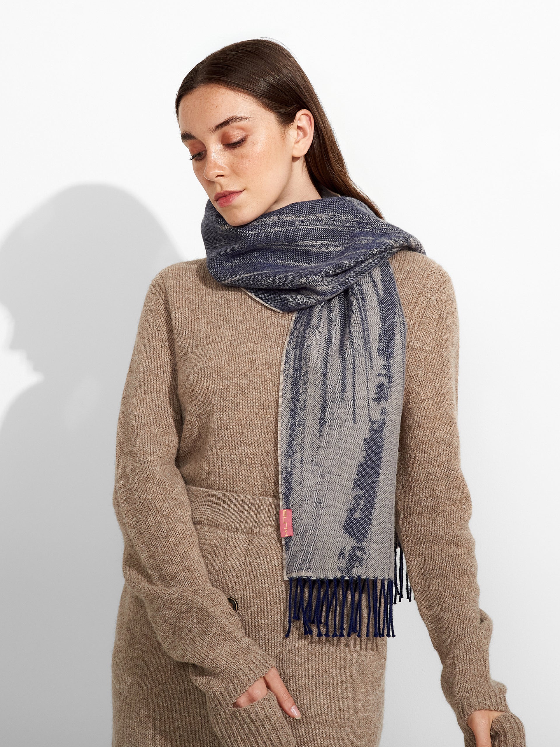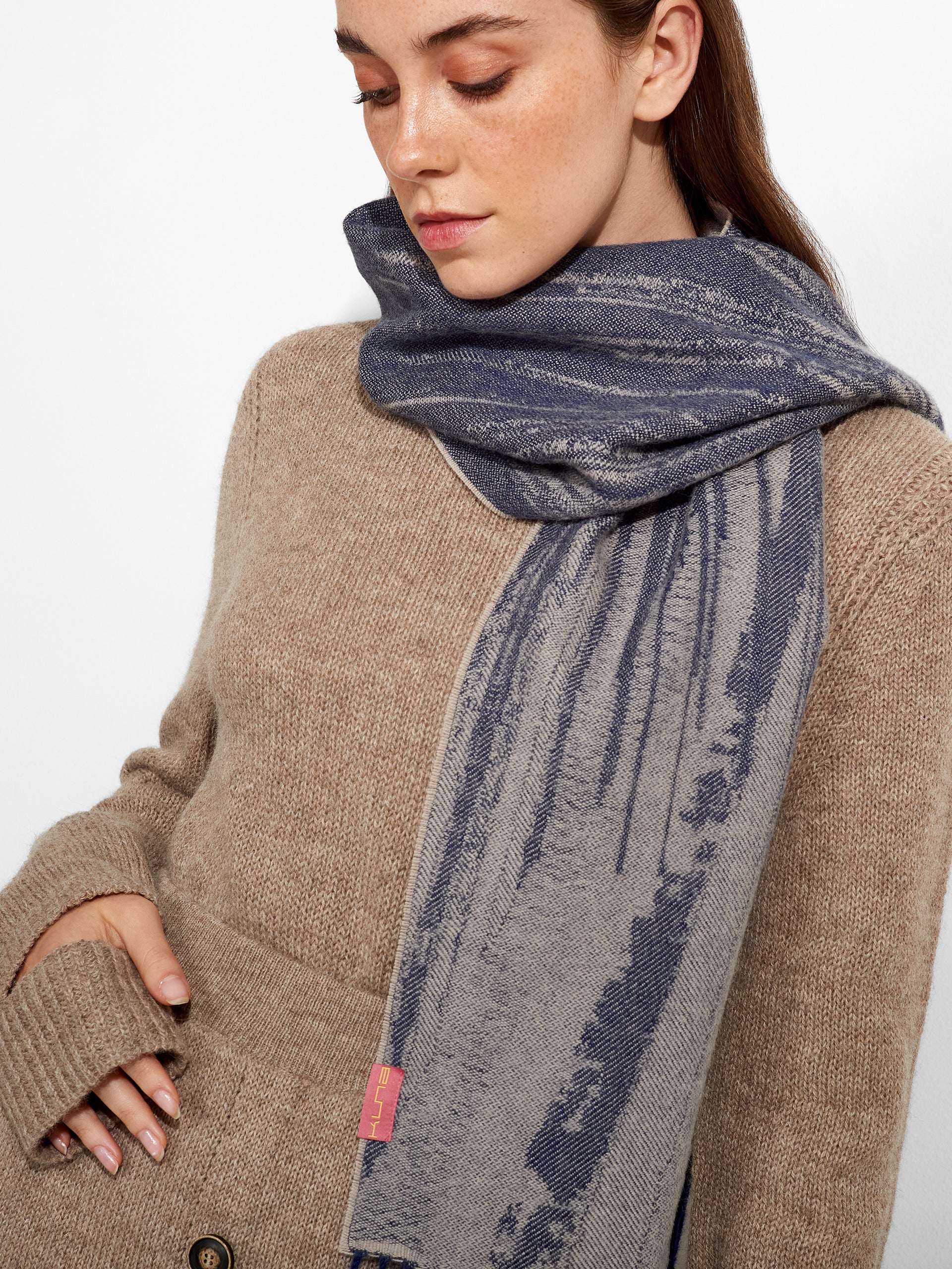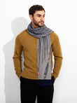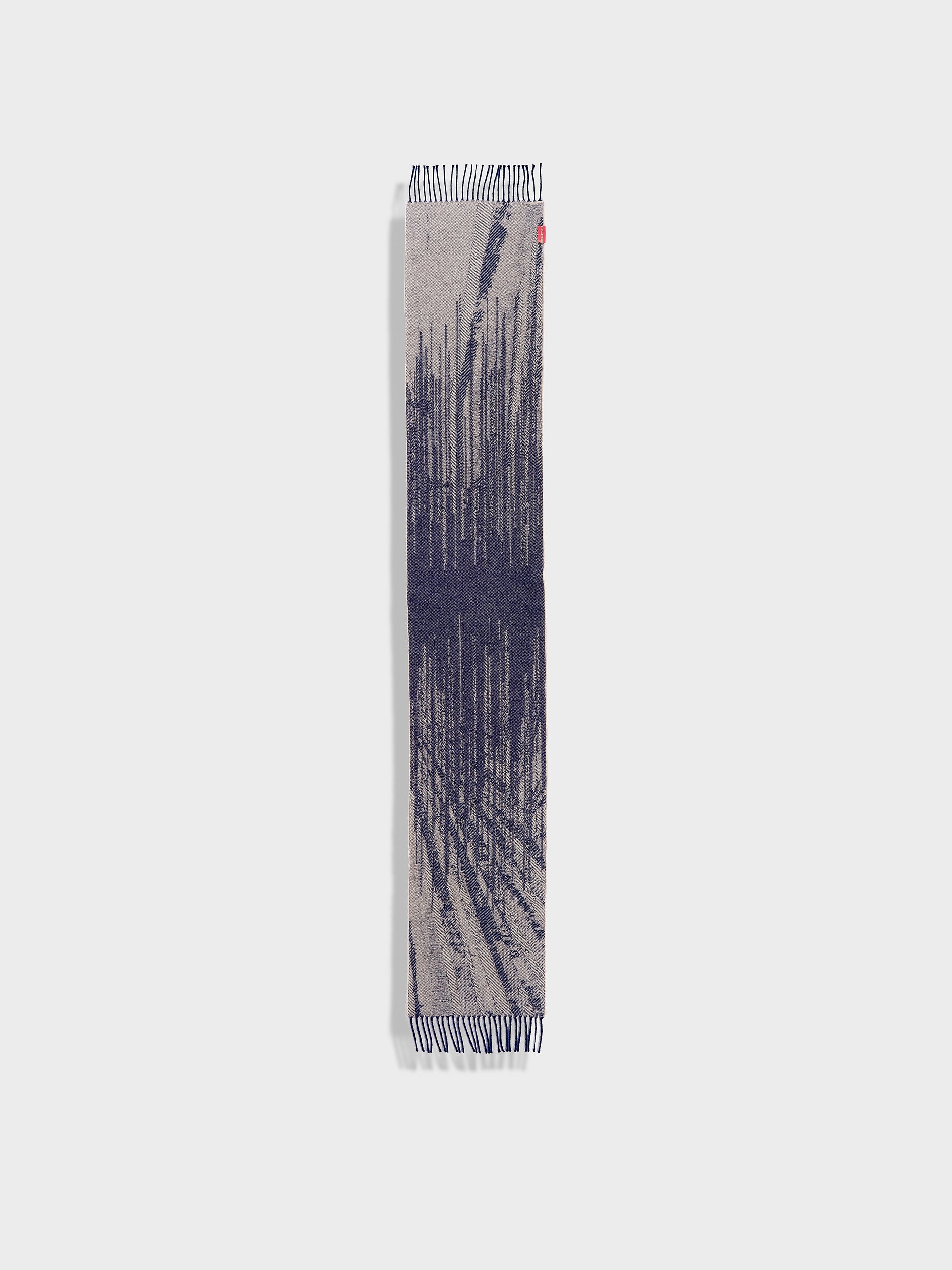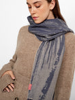 Zangay Scarf in blue tone, featuring an abstract design that adds a contemporary style. It showcases thick fringed edges in a contrasting color. Crafted from baby alpaca, it offers warmth and exceptional softness. | Predominant material: Baby Alpaca