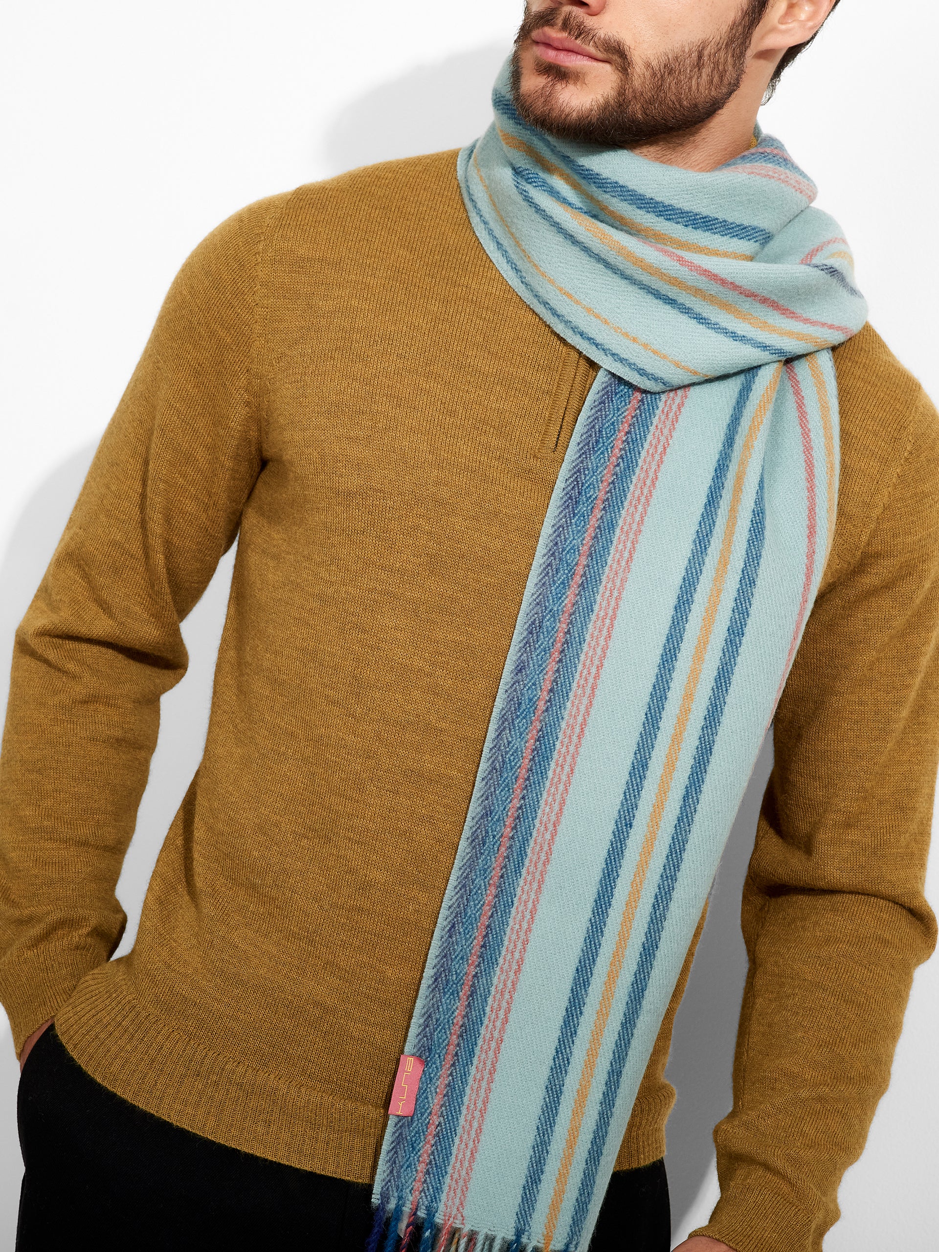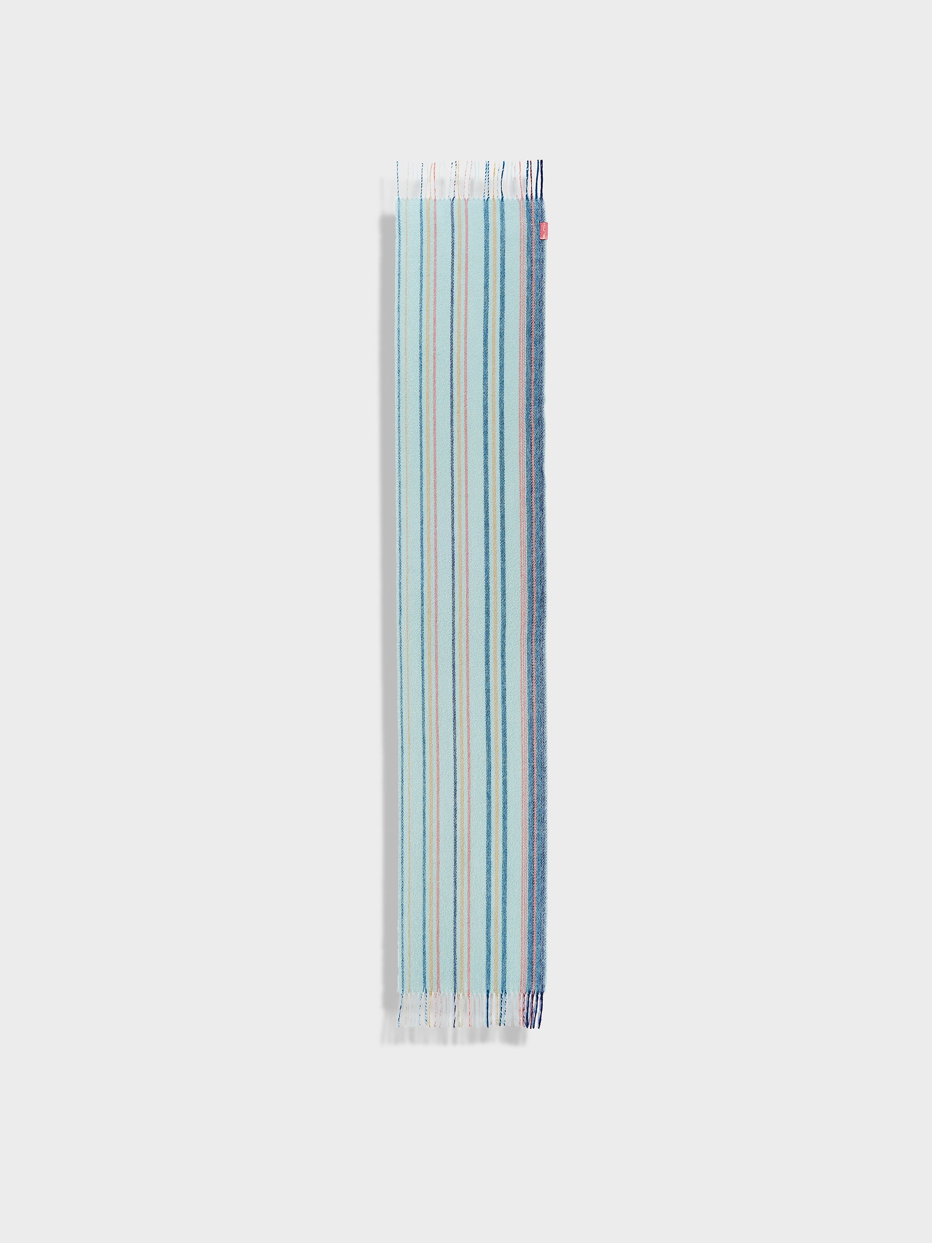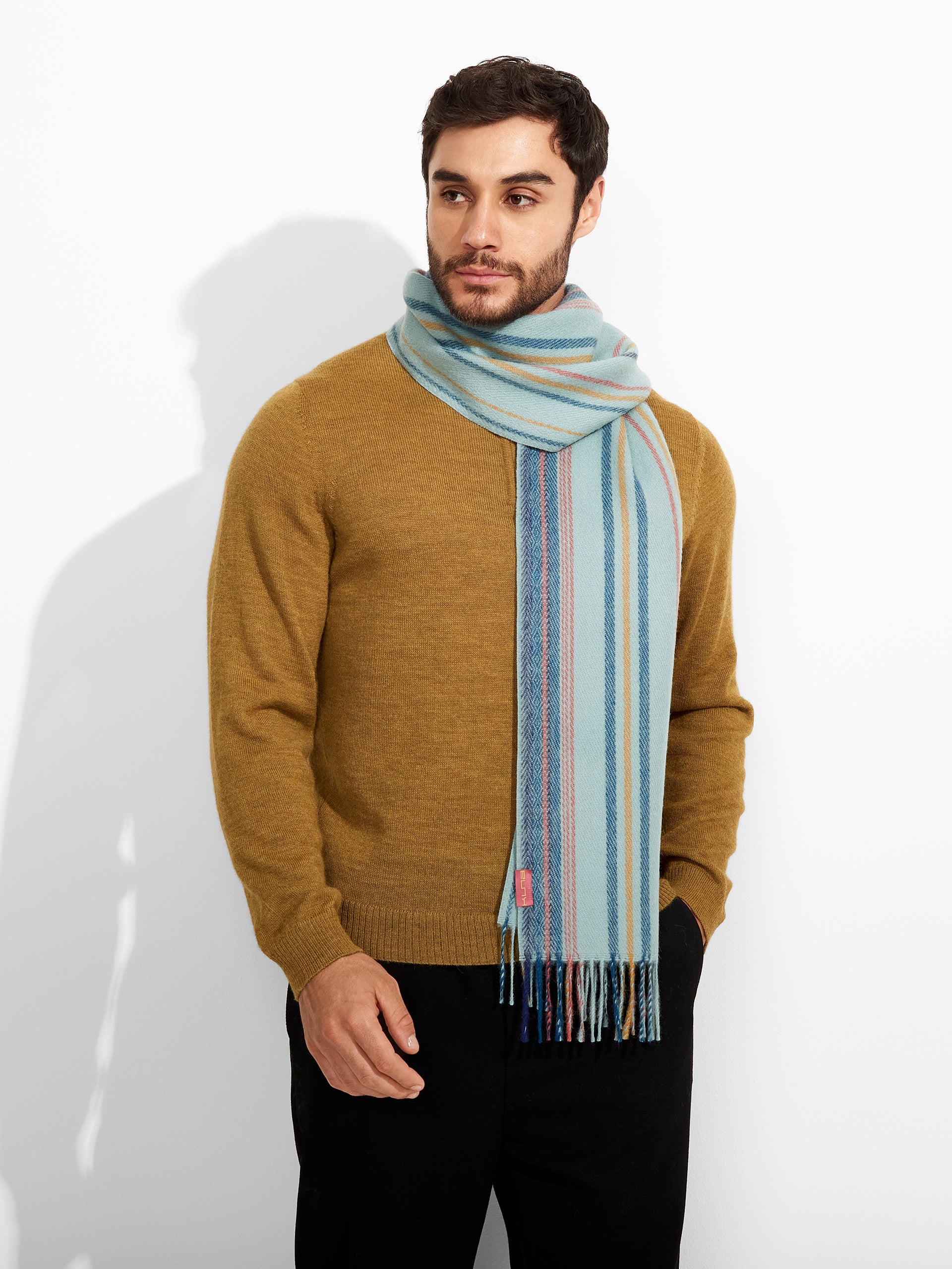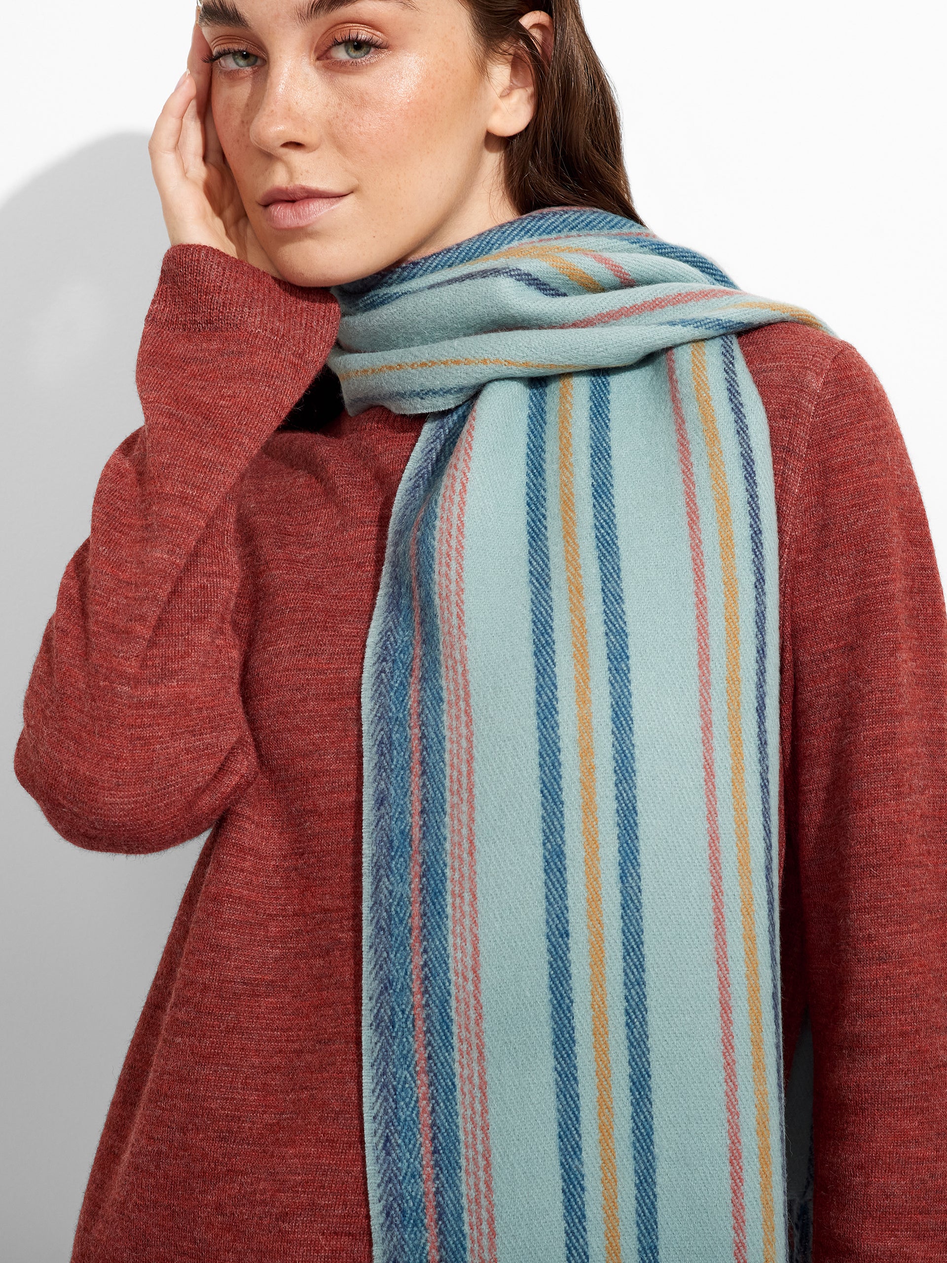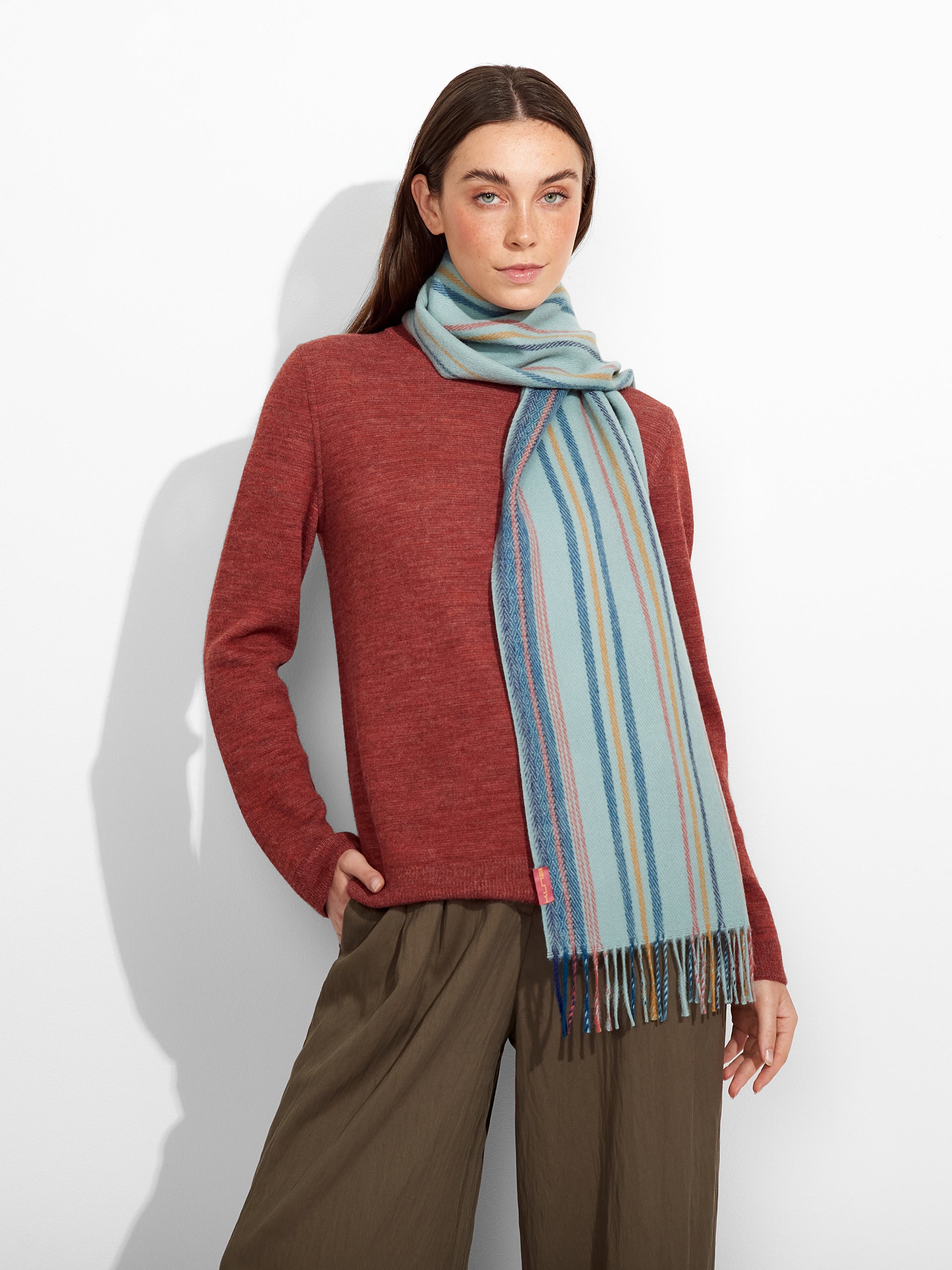 Zareno Scarf in light blue tone, featuring multiple vertical stripes that add texture and movement. The fine fringed edges complete the finish with an artisanal touch. Crafted from baby alpaca, it offers warmth and exceptional softness. | Predominant material: Baby Alpaca