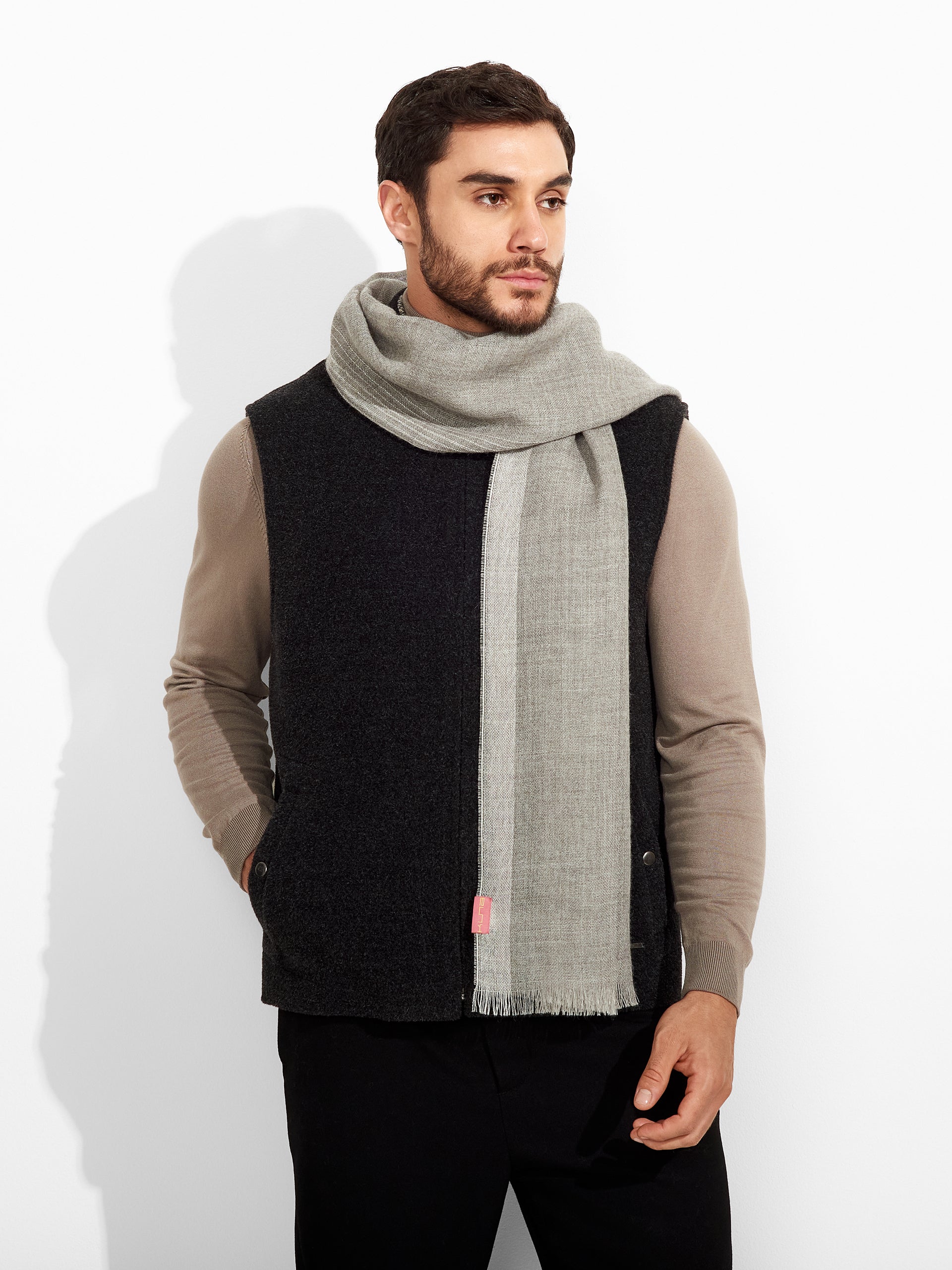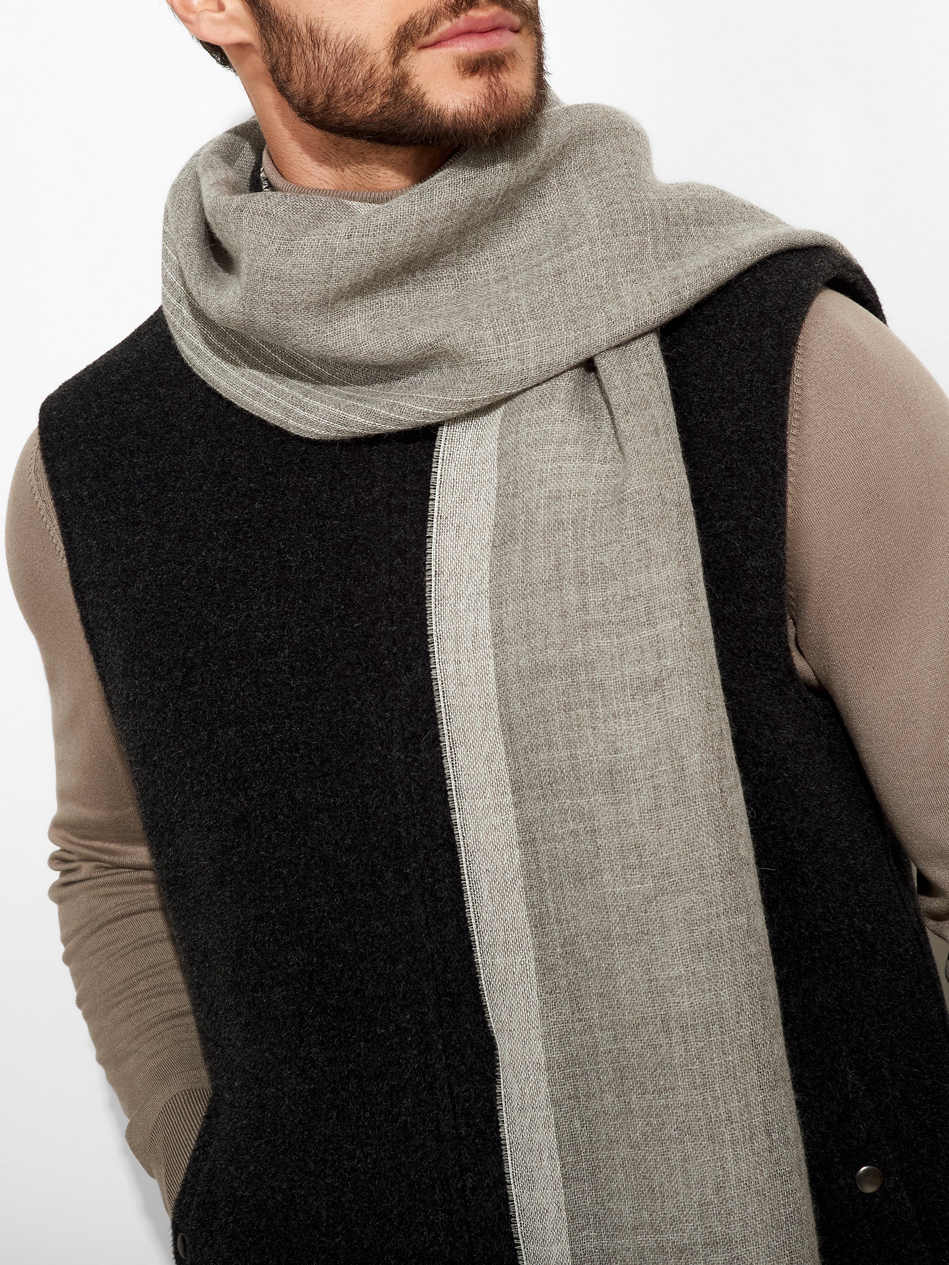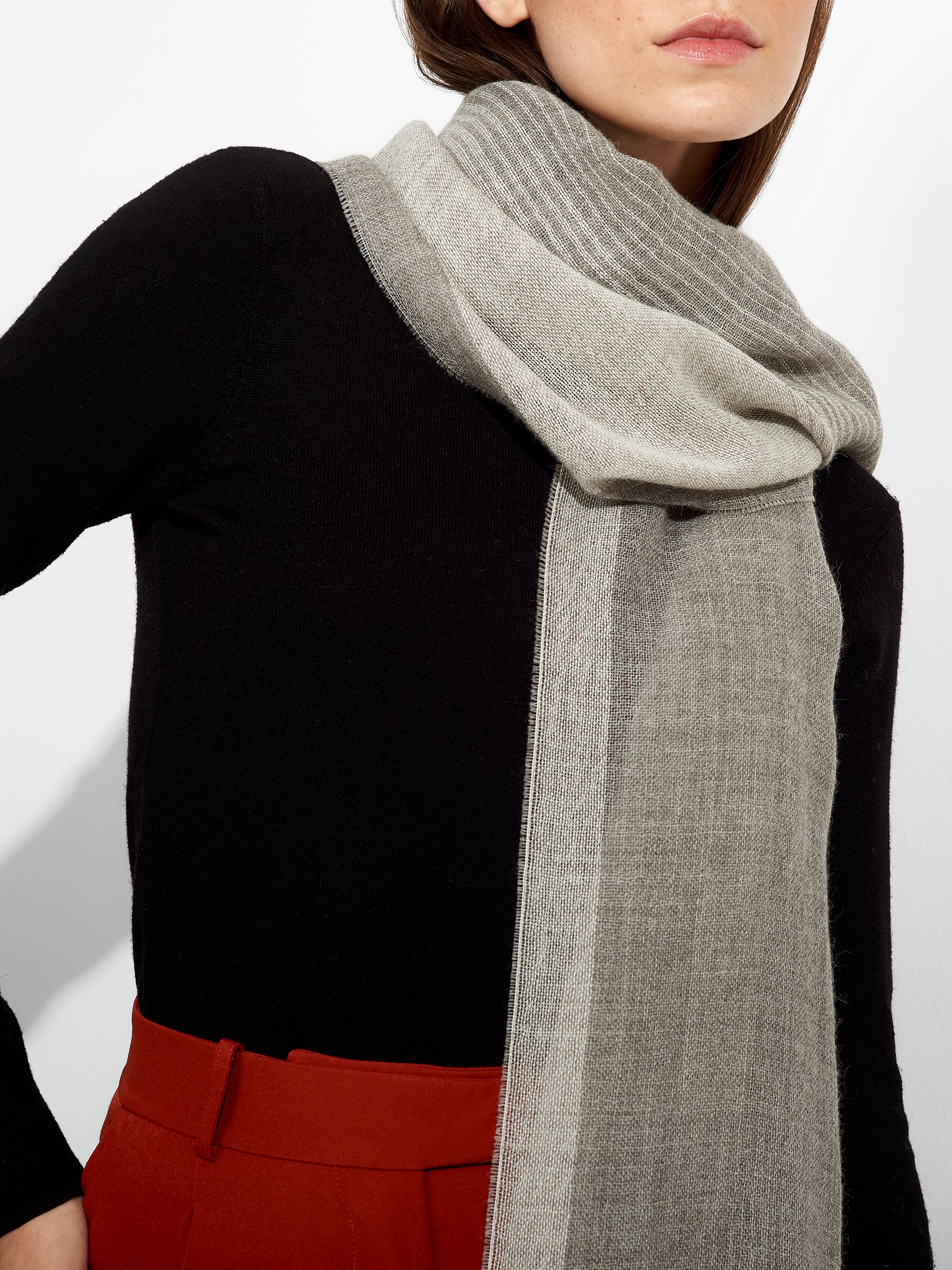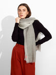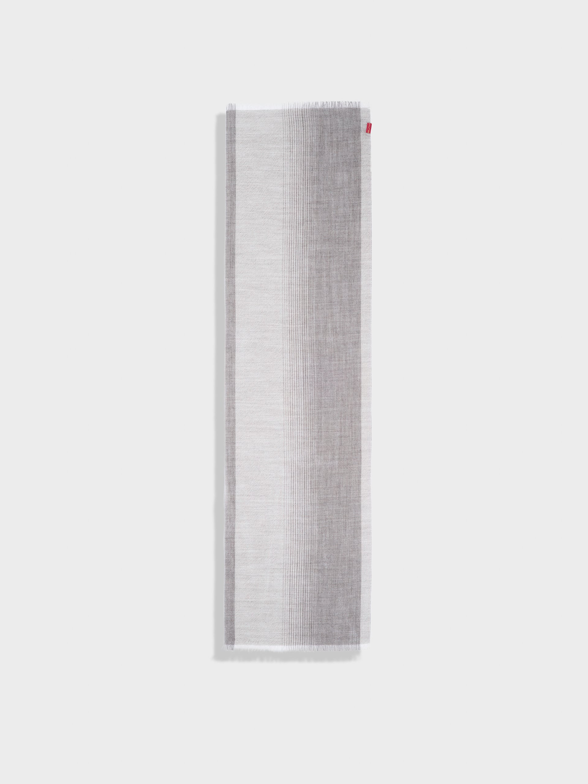 Pesca Stole in gray tone, featuring narrow color blocks on the sides, fine fringed edges, and a dégradé knit. Crafted from baby alpaca, it offers warmth and softness. | Predominant material: Baby Alpaca