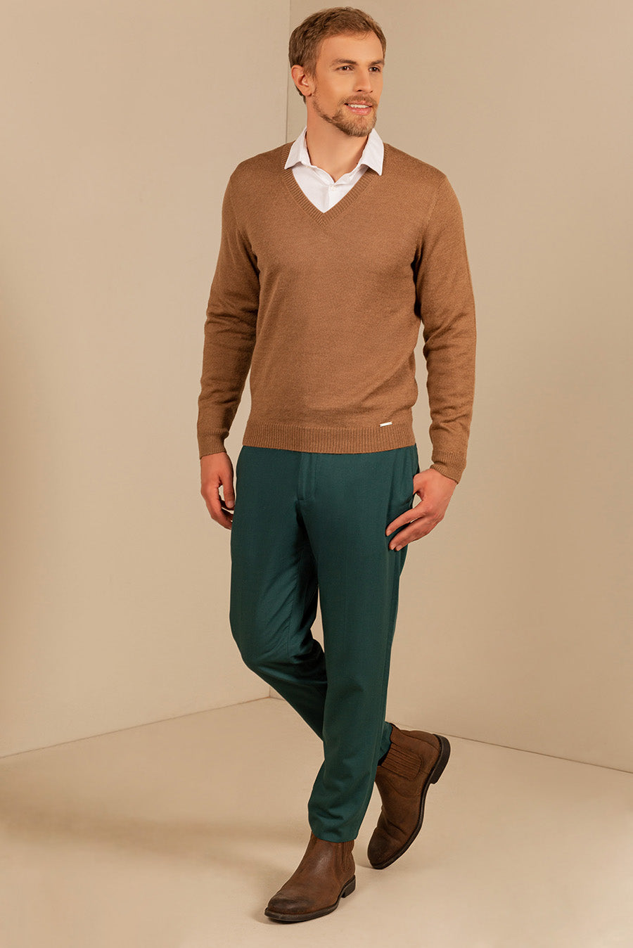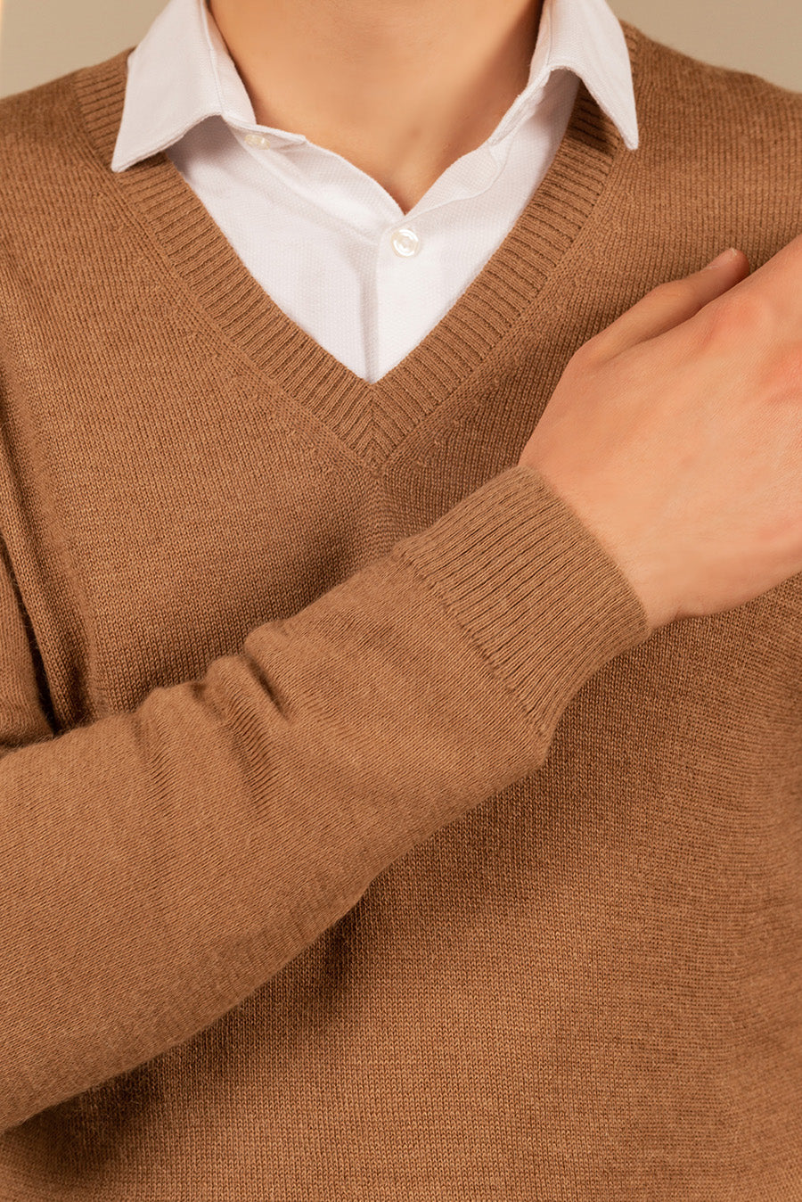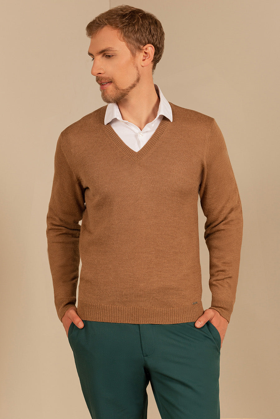 An elegant V-necked sweater with details included on the neckline. Made entirely of baby alpaca fibre, this garment is the perfect choice at any time of day.