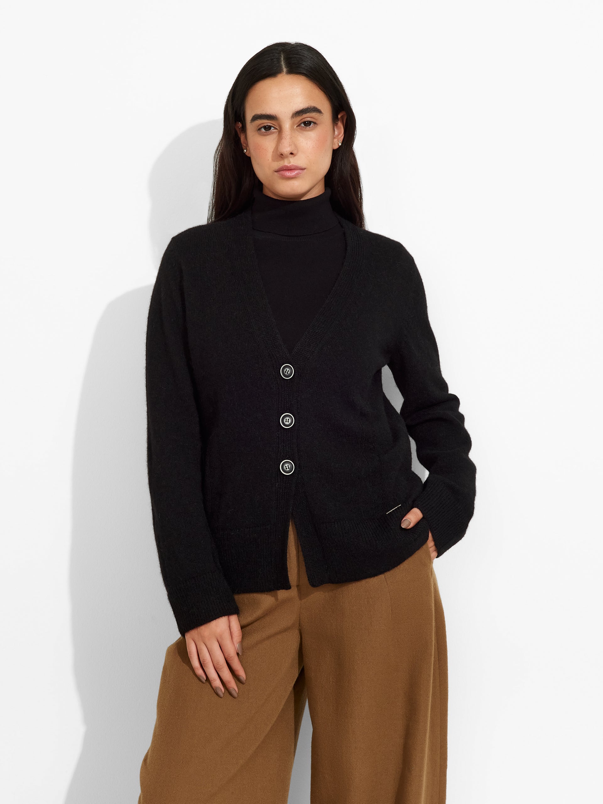 Zia Cardigan in black tone, with a classic cut, button closure, and a V-neckline. Crafted from baby alpaca, it offers warmth and exceptional softness. | Predominant material: Baby Alpaca