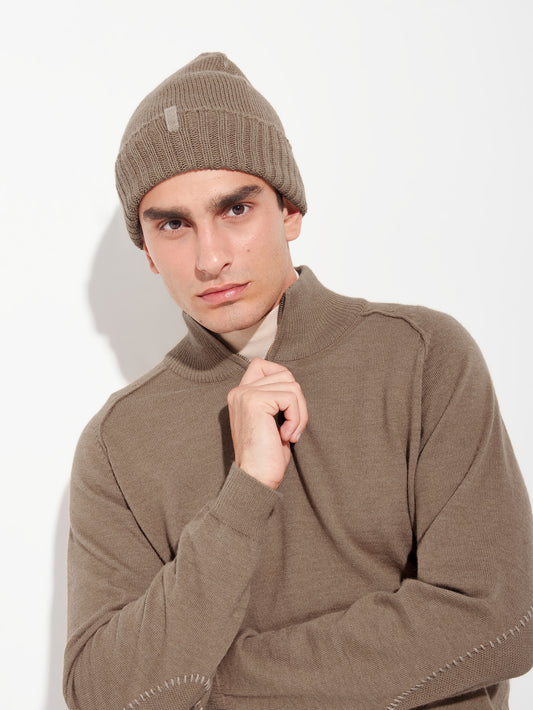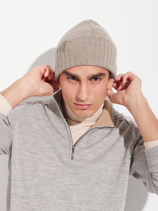 Beige beanie hat, knitted in jersey stitch and made from 100% RAS baby alpaca. Solid...