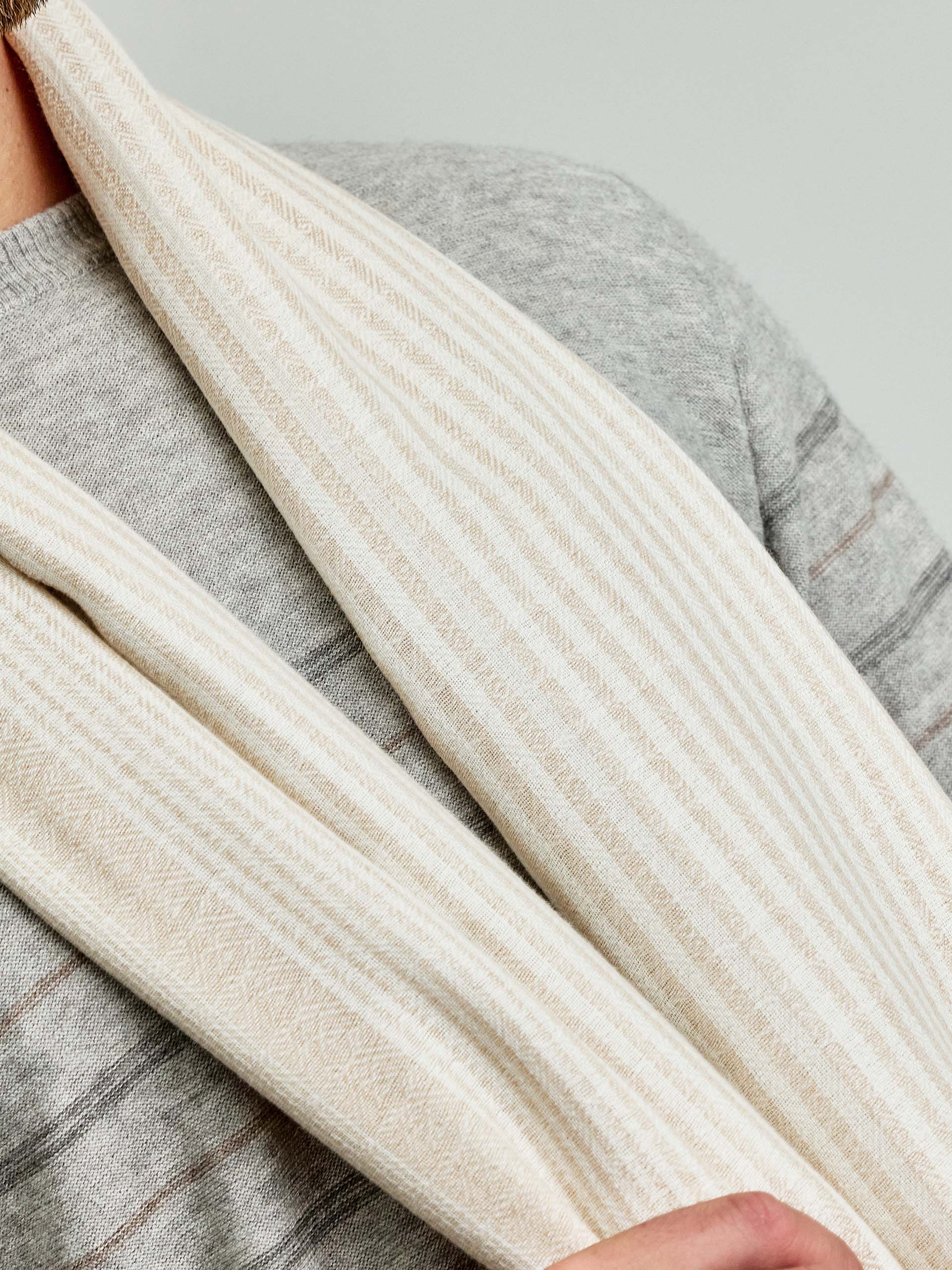 Shawl made of baby alpaca, silk and organic cotton. This beautiful accessory has a striped design. The Walden pashmina is a must-have for the summer and spring season. Feel the warmth and softness of this versatile shawl. Ideal for casual outings. | Predominant material: Cotton & Baby Alpaca