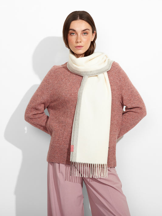 Ravenna Scarf in ecru tone, with contrasting color edges, featuring fine fringes that add a...