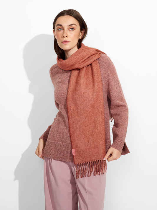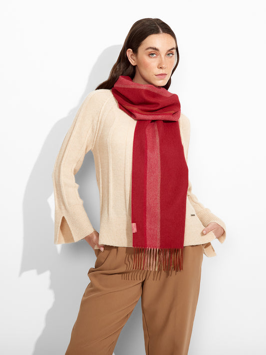 Tundra Scarf in red tone, featuring a double-faced design that highlights two dominant colors. Finished...