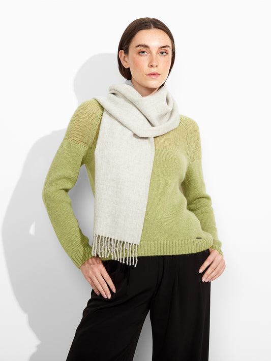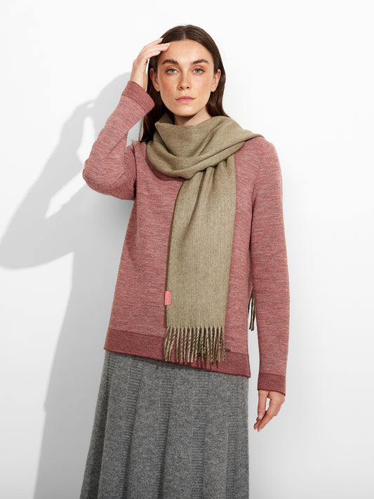 Tundra Scarf in green tone, featuring a double-faced design that highlights two dominant colors. Finished...