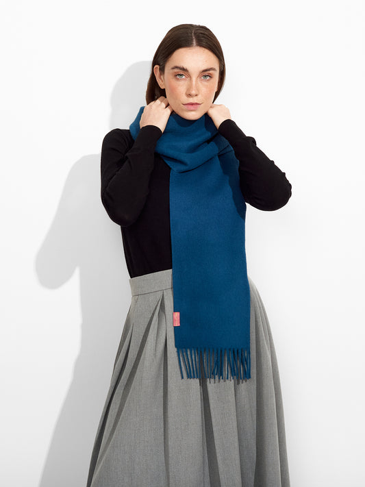Adrian Scarf in blue tone, designed in solid color with thick fringed edges. Crafted from...