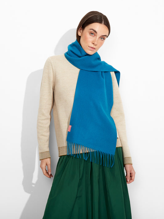 Adrian Scarf in turquoise tone, designed in solid color with thick fringed edges. Crafted from...