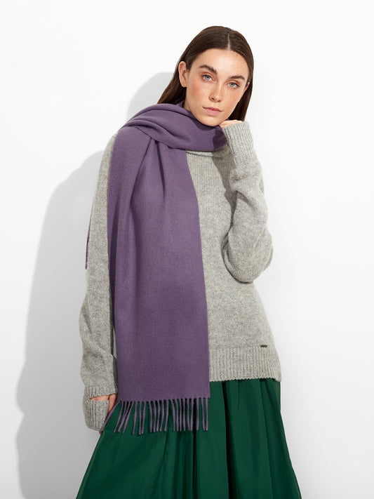 Adrian Scarf in purple tone, designed in solid color with thick fringed edges. Crafted from...
