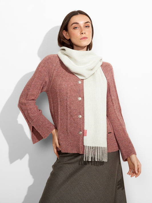 Zeta Scarf in beige tone, designed in solid color with thick fringed edges. Crafted from...